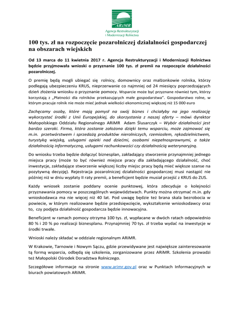 100 tys. zł na rozpoczęcie pozarolniczej działalności gospodarczej na obszarach wiejskich Od 13 marca do 11 kwietnia 2017 r. Agencja Restrukturyzacji i Modernizacji Rolnictwa będzie przyjmowała wnioski o przyznanie 100 tys. zł premii na rozpoczęcie działalności pozarolniczej. O premię będą mogli ubiegać się rolnicy, domownicy oraz małżonkowie rolnika, którzy podlegają ubezpieczeniu KRUS, nieprzerwanie co najmniej od 24 miesięcy poprzedzających dzień złożenia wniosku o przyznanie pomocy. Wsparcie może być przyznane również tym, którzy korzystają z „Płatności dla rolników przekazujących małe gospodarstwa”. Gospodarstwo rolne, w którym pracuje rolnik nie może mieć jednak wielkości ekonomicznej większej niż 15 000 euro Zachęcamy osoby, które mają pomysł na swój biznes i chciałyby na jego realizację wykorzystać środki z Unii Europejskiej, do skorzystania z naszej oferty – mówi dyrektor Małopolskiego Oddziału Regionalnego ARiMR Adam Ślusarczyk – Wybór działalności jest bardzo szeroki. Firma, która zostanie założona dzięki temu wsparciu, może zajmować się m.in. przetwórstwem i sprzedażą produktów nierolniczych, rzemiosłem, rękodzielnictwem, turystyką wiejską, usługami opieki nad dziećmi, osobami niepełnosprawnymi, a także działalnością informatyczną, usługami rachunkowości czy działalnością weterynaryjną. Do wniosku trzeba będzie dołączyć biznesplan, zakładający stworzenie przynajmniej jednego miejsca pracy (może to być również miejsce pracy dla zakładającego działalność, choć inwestycje, zakładające stworzenie większej liczby miejsc pracy będą mieć większe szanse na pozytywną decyzję). Rejestracja pozarolniczej działalności gospodarczej musi nastąpić nie później niż w dniu wypłaty II raty premii, a beneficjent będzie musiał przejść z KRUS do ZUS. Każdy wniosek zostanie poddany ocenie punktowej, która zdecyduje o kolejności przyznawania pomocy w poszczególnych województwach. Punkty można otrzymać m.in. gdy wnioskodawca ma nie więcej niż 40 lat. Pod uwagę będzie też brana skala bezrobocia w powiecie, w którym realizowane będzie przedsięwzięcie, wykształcenie wnioskodawcy oraz to, czy podjęta działalność gospodarcza będzie innowacyjna. Beneficjent w ramach pomocy otrzyma 100 tys. zł, wypłacane w dwóch ratach odpowiednio 80 % i 20 % po realizacji biznesplanu. Przynajmniej 70 tys. zł trzeba wydać na inwestycje w środki trwałe. Wnioski należy składać w oddziale regionalnym ARiMR. W Krakowie, Tarnowie i Nowym Sączu, gdzie przewidywane jest największe zainteresowanie tą formą wsparcia, odbędą się szkolenia, zorganizowane przez ARiMR. Szkolenia prowadzi też Małopolski Ośrodek Doradztwa Rolniczego. Szczegółowe informacje na stronie www.arimr.gov.pl oraz w Punktach Informacyjnych w biurach powiatowych ARiMR.