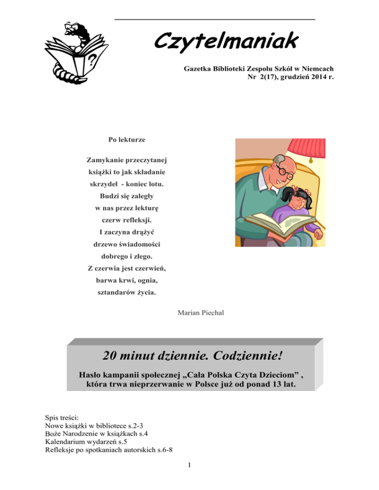 Czytelmaniak Gazetka Biblioteki Zespołu Szkół w Niemcach Nr 2(17), grudzień 2014 r. Po lekturze Zamykanie przeczytanej książki to jak składanie skrzydeł - koniec lotu. Budzi się zaległy w nas przez lekturę czerw refleksji. I zaczyna drążyć drzewo świadomości dobrego i złego. Z czerwia jest czerwień, barwa krwi, ognia, sztandarów życia. Marian Piechal 20 minut dziennie. Codziennie! Hasło kampanii społecznej „Cała Polska Czyta Dzieciom” , która trwa nieprzerwanie w Polsce już od ponad 13 lat. Spis treści: Nowe książki w bibliotece s.2-3 Boże Narodzenie w książkach s.4 Kalendarium wydarzeń s.5 Refleksje po spotkaniach autorskich s.6-8 1 Nowe książki w bibliotece szkolnej Albumy : Chrześcijaństwo, Józef Chełmoński, Lokomotywy, Luksusowe zegarki, Na przełomie wieków, Na większą chwałę Bożą: stulecie parafii św. Ignacego Loyoli w Niemcach Nowe Słowniki języka niemieckiego Poradniki do rysowania: Rysuję samoloty, Rysuję ciężarówki i traktory, Jak rysować psy i szczeniaki Książki dla naszych młodszych czytelników: seria Czytam Sobie, a w niej - Mur, Pan Fortepianek, Walizka pana Hanumana, inne pozycje: A ja jestem Polak mały, Lustro pana Grymsa, Krakowski rynek, Królestwo dziewczynki, Wiersze z kąpieli, Cztery strony czasu, Pałac prezydencki dla dzieci, Niedoparki, Bolek i Lolek- genialni detektywi, Kacper Niewypał, Dźwięki kolorów, Machiną przez Chiny, Geniusz Kuba, Osiem metrów niespodzianki, Noskawery, Messi: mały chłopiec, który stał się wielkim piłkarzem. Seria „Wojny Dorosłych- historie Dzieci” i tu: Mój tato szczęściarz, Syberyjskie przygody Chmurki, Wszystkie moje mamy, Bezsenność Jutki. Jest to wzruszająca literatura faktu; trudne historie dzieci z czasów wojny napisane w przystępnej formie ciekawych opowieści. 2 Książki dla młodzieży: Niezgodna, Wierna, Zbuntowana, Ogry, Cierpienia sięciolatka, Noga w szufladzie, Jak wytrzymać z moją siostrą?, Mejle na miotle, Sekret Milly, Zaliczenie z tragedii, Zmorojewo, Młody samuraj, Zjeść żabę, Kiedy zegar wybije dziesiątą, Wyciskacz do łez, Księżniczka popu, Półbrat, Pieniądze albo kasa. Co to są noskawery? Moim zdaniem książka pt. „Noskawery” Pawła Beręsewicza jest bardzo fajna. Opowiada o małej dziewczynce o imieniu Zuzia. Pewnego dnia w szkole Zuzia widzi, jak jej koleżanka rozdaje zaproszenia. Dziewczynka myśli, że też zostanie zaproszona, ale tak nie jest. Stara się ukryć smutek, lecz to jej nie wychodzi. Jeśli chcecie się dowiedzieć, jakie miała przygody przeczytajcie tę książkę. Polecam. Gabriela Przypis kl. 5b Dla dorosłych: Dałem głos ubogim: rozmowy Ryszarda Kapuścińskiego z włoską młodzieżą, Maluch: biografia – pełna anegdot i ciekawostek historia „złotego dziecka” polskiej motoryzacji, Ości – głośna obecnie powieść współczesnego pisarza Ignacego Karpowicza, Siła codzienności – 17 rozmów ze znanymi ludźmi kultury na codzienne, życiowe tematy. Książki pojawiające się systematycznie w bibliotece szkolnej są najczęściej zakupione w księgarniach. Pani Renata Staszek kupuje je także na Targach Książki Polskiej w Krakowie. Inną formą (znacznie rzadszą) pozyskiwania są dary od wydawnictw, instytucji, osób prywatnych. Jest więc co czytać. Pamiętajmy: czytaniu poświęcić można TYLKO 20 minut dziennie, to już coś znaczy! 3 Bibliografia - Boże Narodzenie w książkach 1. Boże Narodzenie w poezji polskiej- wybór tekstów i ilustracji I. Pawlak. 2. Christie A., Boże Narodzenie Herkulesa Poirot – klasyczny kryminał. 3. Dickens Ch., Opowieść wigilijna- historia skąpca, który w okresie świąt odmienił swoje życie. 4. Ficner-Ogonowska A., Szczęście w cichą noc – opowieść o szczęśliwej rodzinie oczekującej na narodziny dziecka, zawiera także przepisy na świąteczne potrawy. 5. Gaarder J., Tajemnica Bożego Narodzenia- ciepła, magiczna i prawdziwie świąteczna podróż do świata, w którym wszystko jest możliwe. 6. Pierwsze Boże Narodzenie- bogato ilustrowana książeczka o świętej rodzinie. 7. Pinkwart S., Zaczarowana Wigilia – w dzień Wigilii w zamkniętej szkole znalazła się czwórka dzieci, groźna woźna i nauczyciel muzyki. Co sprawiło, że w taki dzień znaleźli się właśnie tutaj? 8. Piotrowska E., Święty Mikołaj z Miry – zabawna, wierszowana opowieść o prawdziwym świętym Mikołaju, dobroczyńcy i biskupie mieszkającym przed wiekami na terenie dzisiejszej Turcji. 9. Teusen G., Boże Narodzenie w naszym domu: najpiękniejsze dekoracje świąteczne i ozdoby choinkowe. 10. Wetzel-Maesmanna S., Każde dziecko to potrafi: robótki na Adwent i Boże Narodzenie. 4 Kalendarium wydarzeń biblioteki szkolnej 9 października - Wystąpienie na II Konferencji Bibliotekarzy Bibliotek Szkolnych i Pedagogicznych Województwa Lubelskiego przebiegającej pod hasłem „Czy tylko Internet? Twórcze sposoby na promocję biblioteki” z prezentacją „Dobry adres – Biblioteka Zespołu szkół w Niemcach”, 17- 31 października – „Jesień to dobra pora na czytanie” – zajęcia czytelnicze dla klas 1-3 SP, 22 października i 25 listopada – spotkanie klas gimnazjalnych z dyrektorem Gminnej Biblioteki Publicznej Grzegorzem Niećko – prelekcja „Irena Kosmowska – dotąd nieznana, od dziś kojarzona”, 4 listopada- warsztaty „ABC dziennikarstwa” z dziennikarzem Robertem Horbaczewskim oraz warsztaty kaligrafii z Renatą Horbaczewską- pasjonatką pięknego pisania, 5 listopada – warsztaty „Dom ze słów” – projekt Lubelskiej Izby Drukarstwa, 7 listopada – „Muzyka z historią w tle” – recital Witka Szaconia, połączony z prelekcją dra Marcina Kruszyńskiego z lubelskiego Instytutu Pamięci Narodowej, 19 listopada – występ uczniów klasy 5b na IV Festiwalu Słowa i Obrazu – konkursie pięknego czytania w Lublinie, Super konkurs! 19 listopada 2014 r. odbył się konkurs pięknego czytan