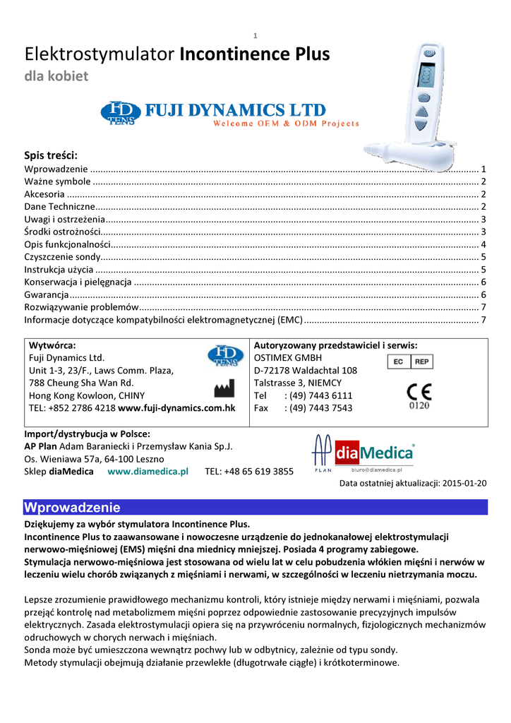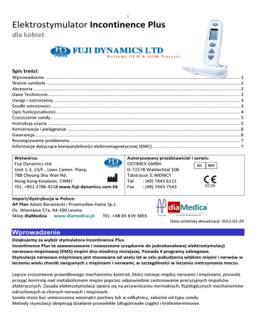 1 Elektrostymulator Incontinence Plus dla kobiet Spis treści: Wprowadzenie ....................................................................................................................................................... 1 Ważne symbole ...................................................................................................................................................... 2 Akcesoria ................................................................................................................................................................ 2 Dane Techniczne..................................................................................................................................................... 2 Uwagi i ostrzeżenia................................................................................................................................................. 3 Środki ostrożności................................................................................................................................................... 3 Opis funkcjonalności............................................................................................................................................... 4 Czyszczenie sondy................................................................................................................................................... 5 Instrukcja użycia ..................................................................................................................................................... 5 Konserwacja i pielęgnacja ...................................................................................................................................... 6 Gwarancja............................................................................................................................................................... 6 Rozwiązywanie problemów.................................................................................................................................... 7 Informacje dotyczące kompatybilności elektromagnetycznej (EMC) .................................................................... 7 Wytwórca: Fuji Dynamics Ltd. Unit 1-3, 23/F., Laws Comm. Plaza, 788 Cheung Sha Wan Rd. Hong Kong Kowloon, CHINY TEL: +852 2786 4218 www.fuji-dynamics.com.hk Autoryzowany przedstawiciel i serwis: OSTIMEX GMBH D-72178 Waldachtal 108 Talstrasse 3, NIEMCY Tel : (49) 7443 6111 Fax : (49) 7443 7543 Import/dystrybucja w Polsce: AP Plan Adam Baraniecki i Przemysław Kania Sp.J. Os. Wieniawa 57a, 64-100 Leszno TEL: +48 65 619 3855 Sklep diaMedica www.diamedica.pl Data ostatniej aktualizacji: 2015-01-20 Wprowadzenie Dziękujemy za wybór stymulatora Incontinence Plus. Incontinence Plus to zaawansowane i nowoczesne urządzenie do jednokanałowej elektrostymulacji nerwowo-mięśniowej (EMS) mięśni dna miednicy mniejszej. Posiada 4 programy zabiegowe. Stymulacja nerwowo-mięśniowa jest stosowana od wielu lat w celu pobudzenia włókien mięśni i nerwów w leczeniu wielu chorób związanych z mięśniami i nerwami, w szczególności w leczeniu nietrzymania moczu. Lepsze zrozumienie prawidłowego mechanizmu kontroli, który istnieje między nerwami i mięśniami, pozwala przejąć kontrolę nad metabolizmem mięśni poprzez odpowiednie zastosowanie precyzyjnych impulsów elektrycznych. Zasada elektrostymulacji opiera się na przywróceniu normalnych, fizjologicznych mechanizmów odruchowych w chorych nerwach i mięśniach. Sonda może być umieszczona wewnątrz pochwy lub w odbytnicy, zależnie od typu sondy. Metody stymulacji obejmują działanie przewlekłe (długotrwałe ciągłe) i krótkoterminowe. 2 Ważne symbole Potwierdzamy, że urządzenie jest zgodne z dyrektywą 93/42 / EEC Przed użyciem urządzenia prosimy dokładnie przeczytać instrukcję. Przed użyciem urządzenia prosimy dokładnie przeczytać instrukcję. Urządzenie należy przechowywać z dala od spray’ów, wody lub deszczu. Producent Przedstawiciel Autoryzowany Numer Seryjny Urządzenie typu BF IEC / EN60601-1. Zapewnia wysoki stopień ochrony przed porażeniem prądem elektrycznym. Przeznaczone jest do pracy ciągłej bez stopnia ochrony przed wnikaniem wody. Pozbywanie się urządzenia: Przepisy wymagają, aby wszystkie urządzenia elektryczne i elektroniczne były zebrane celem ponownego użycia i recyklingu. Sprzęt elektryczny i elektroniczny oznaczony symbolem wskazującym selektywną zbiórkę takiego sprzętu musi być po zakończeniu używania zwrócony do specjalnego punktu zbiórki odpadów. Akcesoria 1 x Sonda dopochwowa 2 x Przewód doprowadzający prąd do sondy 2 x Bateria 1.5V AAA 1 x Instrukcja obsługi 1 x Futerał Dane Techniczne Liczba kanałów Liczba programów Kształt impulsu Napięcie wyjściowe Natężenie wyjściowe Minutnik Pamięć Wykrywanie sondy Automatyczne wyłączenie Częstotliwość Typ baterii Poziom niskiego stanu baterii Czas pracy na bateriach Warunki pracy Warunki przechowywania i transportu Czas eksploatacji (spodziewany) Pojedynczy 4 Prostokątny, asymetryczny, dwufazowy 0-60V szczytowe, dla 500Ω 120mA szczytowe, dla 500Ω 20 minutowy czas zabiegu Zapamiętuje ostatnio stosowany program, jeśli urządzenie posiada baterię Jeśli sonda nie zostanie wykryta, np. z powodu złych połączeń lub niewłaściwego kontaktowania sondy z ciałem pacjenta, intensywność może być zwiększona tylko do poziomu 2. Dalsze zwiększanie spowoduje spadek intensywności do zera. Przy zerowym sygnale wyjściowym utrzymującym się przynajmniej 5 minut, urządzenie wyłączy się automatycznie. 12.5 Hz (A), 50 Hz (B), falowanie: 10-50-10 Hz (C), fazy: 10 Hz i 27 Hz (D) 2 x 1.5V AAA (Typ LR03) Przy 2.2V ±0.1V Ok. 85 godzin dla programu C (bateria Energizer E92) Temperatura 0-40°C, Wilgotność powietrza 30-75% Ciśnienie atmosferyczne 700 hPa - 1060 hPa Temperatura: 0-40°C, Wilgotność powietrza: 30-90% Ciśnienie atmosfer