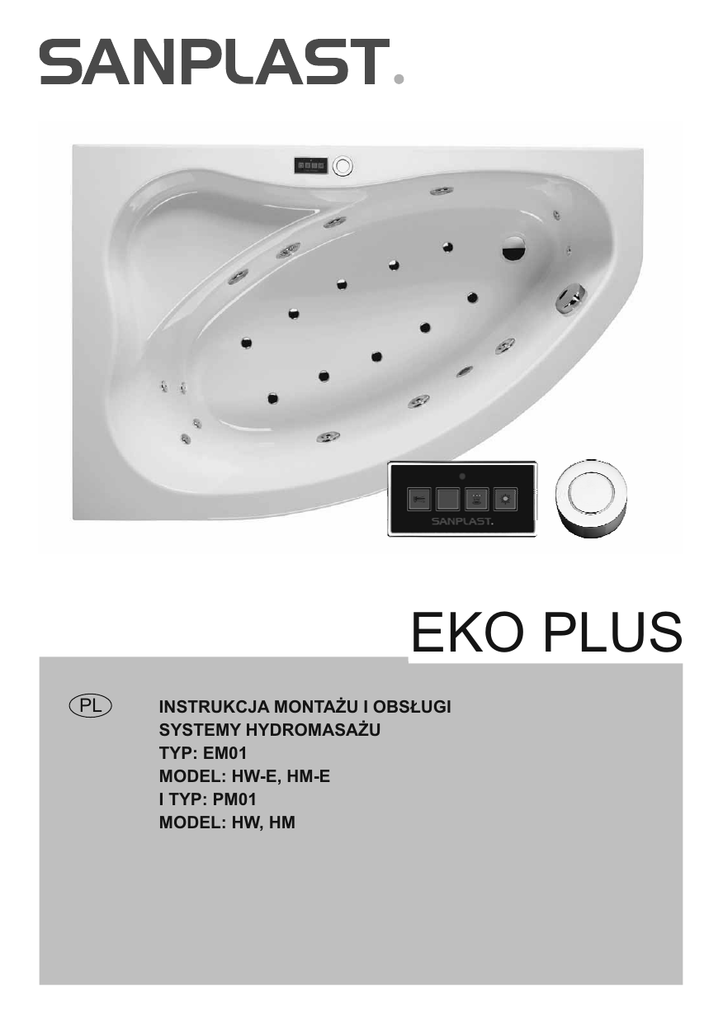 EKO PLUS PL INSTRUKCJA MONTAŻU I OBSŁUGI SYSTEMY HYDROMASAŻU TYP: EM01 MODEL: HW-E, HM-E I TYP: PM01 MODEL: HW, HM SYSTEMY HYDROMASAŻU 2 EKO PLUS 1. Korzystanie z hydromasażu . . . . . . . . . . . . . . . . . . . . . . . . . . . . . . . . . . . . . . . . . . . . . . . . . . . . . . . . . 4 2. Montaż wanny z hydromasażem . . . . . . . . . . . . . . . . . . . . . . . . . . . . . . . . . . . . . . . . . . . . . . . . . . . . . 4 2.1. Transport . . . . . . . . . . . . . . . . . . . . . . . . . . . . . . . . . . . . . . . . . . . . . . . . . . . . . . . . . . . . . . . . . . . . . 4 2.2. Przygotowanie miejsca montażu . . . . . . . . . . . . . . . . . . . . . . . . . . . . . . . . . . . . . . . . . . . . . . . . . . . 4 2.3. Montaż wanny . . . . . . . . . . . . . . . . . . . . . . . . . . . . . . . . . . . . . . . . . . . . . . . . . . . . . . . . . . . . . . . . . 4 2.4. Certyfikaty i deklaracje . . . . . . . . . . . . . . . . . . . . . . . . . . . . . . . . . . . . . . . . . . . . . . . . . . . . . . . . . . . 4 2.5. Podłączenie elektryczne. . . . . . . . . . . . . . . . . . . . . . . . . . . . . . . . . . . . . . . . . . . . . . . . . . . . . . . . . . 5 2.6. Podłączenie hydrauliczne. . . . . . . . . . . . . . . . . . . . . . . . . . . . . . . . . . . . . . . . . . . . . . . . . . . . . . . . . 6 2.7. Sprawdzenie instalacji . . . . . . . . . . . . . . . . . . . . . . . . . . . . . . . . . . . . . . . . . . . . . . . . . . . . . . . . . . . 6 2.8. Zabudowa wanny . . . . . . . . . . . . . . . . . . . . . . . . . . . . . . . . . . . . . . . . . . . . . . . . . . . . . . . . . . . . . . . 7 3. Schemat elektryczny . . . . . . . . . . . . . . . . . . . . . . . . . . . . . . . . . . . . . . . . . . . . . . . . . . . . . . . . . . . . . . . 8 3.1. System HW-E i HM-E . . . . . . . . . . . . . . . . . . . . . . . . . . . . . . . . . . . . . . . . . . . . . . . . . . . . . . . . . . . . 8 3.2. System HW i HM . . . . . . . . . . . . . . . . . . . . . . . . . . . . . . . . . . . . . . . . . . . . . . . . . . . . . . . . . . . . . . . 8 4. Funkcje i wyposażenie systemów hydromasażu . . . . . . . . . . . . . . . . . . . . . . . . . . . . . . . . . . . . . . . . 9 5. Konserwacja . . . . . . . . . . . . . . . . . . . . . . . . . . . . . . . . . . . . . . . . . . . . . . . . . . . . . . . . . . . . . . . . . . . . . 11 6. Samodzielne rozwiązywanie problemów w hydromasażu . . . . . . . . . . . . . . . . . . . . . . . . . . . . . . . . 12 8. Warunki gwarancji . . . . . . . . . . . . . . . . . . . . . . . . . . . . . . . . . . . . . . . . . . . . . . . . . . . . . . . . . . . . . . . . 13 3 SYSTEMY HYDROMASAŻU 1. KORZYSTANIE Z HYDROMASAŻU Przed przystąpieniem do montażu lub korzystaniem z wanny z systemem hydromasażu należy zapoznać się z instrukcją montażu i obsługi. Niniejszą instrukcję nalezy zachować aby, w miarę potrzeb, udostępnić ją innym właścicielom lub użytkownikom. Przed kąpielą z hydromasażem dobrze jest wziąć prysznic, aby usunąć cząstki mydła, brudu i naskórka. Do hydromasażu można stosować wodę o rozmaitej temperaturze w zależności od efektów masażu, jakie chcemy uzyskać: Kąpiel w wodzie zimnej o temperaturze do 30°C ma działanie pobudzające przemianę materii i krążenia, orzeźwiające oraz przeciwbólowe. Czas masażu: do 15 minut. Kąpiel w wodzie o temperaturze obojętnej, tj. 33-38°C, działa uspokajająco, rozluźniająco, zmniejsza napięcie mięśni. Czas masażu: do 20 minut. Kąpiele w temperaturze 37-38°C mają działanie rozkurczowe, nasenne, poprawiają pracę układu krążenia. Czas masażu: do 15 minut. Bardzo ciepłe kąpiele, tj. w temperaturze powyżej 39°C, można stosować jedynie pod kontrolą lekarza. Osoby z różnymi dolegliwościami, jak np. ostre infekcje, zakrzepy, niewydolność nerek, choroby serca, cukrzyca powinny korzystać z hydromasażu po konsultacji z lekarzem, co pozwoli na zastosowanie odpowiedniej terapii. Zalecamy konsultację lekarską również kobietom w ciąży. Dla dzieci hydromasaż jest wyczerpujący, dlatego nie należy pozostawiać ich w takiej kąpieli bez opieki. Niniejszy sprzęt nie jest przeznaczony do uzytkowania przez osoby (w tym dzieci) o ograniczonej dolności fizycznej, czuciowej lub psychicznej, lub osoby nie mające doświadczenia lub znajomości sprzętu, chyba że odbywa się to pod nadzorem lub zgodnie z instrukcją użytkowania sprzętu, przekazanej przez osoby odpowiadające za ich bezpieczeństwo. Należy zwracać uwagę na dzieci aby nie bawiły się sprzętem. Osoby starsze powoli poruszające się lub osoby niepełnosprawne powinny używać wanien z zachowaniem ostrożności. 2. MONTAŻ WANNY Z HYDROMASAŻEM 2.1. TRANSPORT Przewożenie wanny powinno odbywać się w oryginalnym opakowaniu producenta! W czasie przenoszenia wanny w żadnym wypadku nie należy chwytać za elementy systemów masażu. Nie ponosimy odpowiedzialności za przecieki powstałe w wyniku nieprzestrzegania powyższej zasady! 2.2. PRZYGOTOWANIE MIEJSCA MONTAŻU Odpowiednio przygotowane miejsce montażu powinno posiadać: - wypoziomowane podłoże - doprowadzone zasilanie o napięciu 230V zabezpieczone wyłącznikiem różnicowo-prądowym o prądzie In=30mA (np. B 16/0,03A) - wentylację zapewniającą swobodny dopływ powietrza do urządzeń i elementów wyposażenia - instalację wodno-kanalizacyjną 2.3. MONTAŻ WANNY Należy: - Wypoziomować wannę - Umieścić wannę ok. 2 mm od ścian w celu odizolowania drgań, a powstałą szczelinę wypełnić silikonem sanitarnym lub taśmą uszczelniającą. 4 EKO PLUS 2.4. CERTYFIKATY I DEKLARACJE Wanny akrylowe stosowane do systemów hydromasażu posiadają atest higieniczny PZH na akryl sanitarny a systemy hydromasażu (marki EKO PLUS typ EM01, PM01) posiadają certyfikat Polskiego Centrum Badań i Certyfikacji umożliwiające oznaczenie wyrobów znakiem bezpieczeństwa B i CE. 2.5. PODŁĄCZENIE ELEKTRYCZNE Instalację elektryczną należy wyk