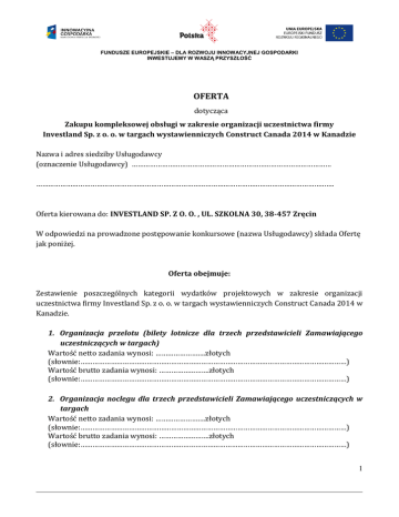 FUNDUSZE EUROPEJSKIE – DLA ROZWOJU INNOWACYJNEJ GOSPODARKI INWESTUJEMY W WASZĄ PRZYSZŁOŚĆ OFERTA dotycząca Zakupu kompleksowej obsługi w zakresie organizacji uczestnictwa firmy Investland Sp. z o. o. w targach wystawienniczych Construct Canada 2014 w Kanadzie Nazwa i adres siedziby Usługodawcy (oznaczenie Usługodawcy) ……………………………………………………………………………………… …………………………………………………………………………………………………………………………………. Oferta kierowana do: INVESTLAND SP. Z O. O. , UL. SZKOLNA 30, 38-457 Zręcin W odpowiedzi na prowadzone postępowanie konkursowe (nazwa Usługodawcy) składa Ofertę jak poniżej. Oferta obejmuje: Zestawienie poszczególnych kategorii wydatków projektowych w zakresie organizacji uczestnictwa firmy Investland Sp. z o. o. w targach wystawienniczych Construct Canada 2014 w Kanadzie. 1. Organizacja przelotu (bilety lotnicze dla trzech przedstawicieli Zamawiającego uczestniczących w targach) Wartość netto zadania wynosi: …………………….złotych (słownie:……………………………………………………………………………………………………………………) Wartość brutto zadania wynosi: …………………….złotych (słownie:……………………………………………………………………………………………………………………) 2. Organizacja noclegu dla trzech przedstawicieli Zamawiającego uczestniczących w targach Wartość netto zadania wynosi: …………………….złotych (słownie:……………………………………………………………………………………………………………………) Wartość brutto zadania wynosi: …………………….złotych (słownie:……………………………………………………………………………………………………………………) 1 FUNDUSZE EUROPEJSKIE – DLA ROZWOJU INNOWACYJNEJ GOSPODARKI INWESTUJEMY W WASZĄ PRZYSZŁOŚĆ 3. Wynajem powierzchni wystawienniczej Wartość netto zadania wynosi: …………………….złotych (słownie:……………………………………………………………………………………………………………………) Wartość brutto zadania wynosi: …………………….złotych (słownie:……………………………………………………………………………………………………………………) 4. Wynajem zabudowy powierzchni wystawienniczej Wartość netto zadania wynosi: …………………….złotych (słownie:……………………………………………………………………………………………………………………) Wartość brutto zadania wynosi: …………………….złotych (słownie:……………………………………………………………………………………………………………………) 5. Obsługa techniczna w obrębie powierzchni wystawienniczej Wartość netto zadania wynosi: …………………….złotych (słownie:……………………………………………………………………………………………………………………) Wartość brutto zadania wynosi: …………………….złotych (słownie:……………………………………………………………………………………………………………………) 6. Wpis do katalogu targowego, pokrycie opłat rejestracyjnych Wartość netto zadania wynosi: …………………….złotych (słownie:……………………………………………………………………………………………………………………) Wartość brutto zadania wynosi: …………………….złotych (słownie:……………………………………………………………………………………………………………………) 7. Transport i spedycja eksponatów wraz z ubezpieczeniem i odprawą celną Wartość netto zadania wynosi: …………………….złotych (słownie:……………………………………………………………………………………………………………………) Wartość brutto zadania wynosi: …………………….złotych (słownie:……………………………………………………………………………………………………………………) 8. Organizacja pokazów, prezentacji produktów Wartość netto zadania wynosi: …………………….złotych (słownie:……………………………………………………………………………………………………………………) Wartość brutto zadania wynosi: …………………….złotych (słownie:……………………………………………………………………………………………………………………) 9. Organizacja udziału w spotkaniach bilateralnych i wyjazdach studyjnych Wartość netto zadania wynosi: …………………….złotych (słownie:……………………………………………………………………………………………………………………) Wartość brutto zadania wynosi: …………………….złotych 2 FUNDUSZE EUROPEJSKIE – DLA ROZWOJU INNOWACYJNEJ GOSPODARKI INWESTUJEMY W WASZĄ PRZYSZŁOŚĆ (słownie:……………………………………………………………………………………………………………………) 10. Organizacja udziału zamawiającego w szkoleniach Wartość netto zadania wynosi: …………………….złotych (słownie:……………………………………………………………………………………………………………………) Wartość brutto zadania wynosi: …………………….złotych (słownie:……………………………………………………………………………………