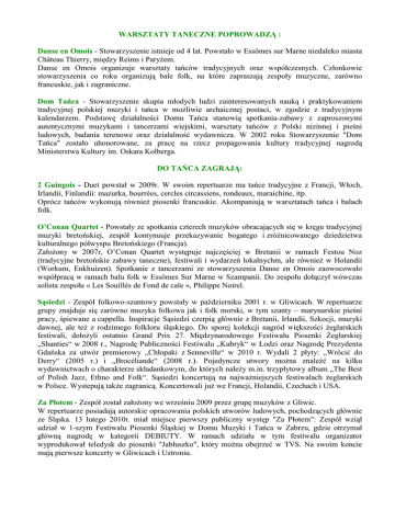 WARSZTATY TANECZNE POPROWADZĄ : Danse en Omois - Stowarzyszenie istnieje od 4 lat. Powstało w Essômes sur Marne niedaleko miasta Château Thierry, między Reims i ParyŜem. Danse en Omois organizuje warsztaty tańców tradycyjnych oraz współczesnych. Członkowie stowarzyszenia co roku organizują bale folk, na które zapraszają zespoły muzyczne, zarówno francuskie, jak i zagraniczne. Dom Tańca - Stowarzyszenie skupia młodych ludzi zainteresowanych nauką i praktykowaniem tradycyjnej polskiej muzyki i tańca w moŜliwie archaicznej postaci, w zgodzie z tradycyjnym kalendarzem. Podstawę działalności Domu Tańca stanowią spotkania-zabawy z zaproszonymi autentycznymi muzykami i tancerzami wiejskimi, warsztaty tańców z Polski nizinnej i pieśni ludowych, badania terenowe oraz działalność wydawnicza. W 2002 roku Stowarzyszenie "Dom Tańca" zostało uhonorowane, za pracę na rzecz propagowania kultury tradycyjnej nagrodą Ministerstwa Kultury im. Oskara Kolberga. DO TAŃCA ZAGRAJĄ: 2 Guingois - Duet powstał w 2009r. W swoim repertuarze ma tańce tradycyjne z Francji, Włoch, Irlandii, Finlandii: mazurka, bourrées, cercles circassiens, rondeaux, maraichine, itp. Oprócz tańców wykonują równieŜ piosenki francuskie. Akompaniują w warsztatach tańca i balach folk. O’Conan Quartet - Powstały ze spotkania czterech muzyków obracających się w kręgu tradycyjnej muzyki bretońskiej, zespół kontynuuje przekazywanie bogatego i zróŜnicowanego dziedzictwa kulturalnego półwyspu Bretońskiego (Francja). ZałoŜony w 2007r, O’Conan Quartet występuje najczęściej w Bretanii w ramach Festou Noz (tradycyjne bretońskie zabawy taneczne), festiwali i wydarzeń lokalnychm, ale równieŜ w Holandii (Workum, Enkhuizen). Spotkanie z tancerzami ze stowarzyszenia Danse en Omois zaowocowało współpracą w ramach balu folk w Essômes Sur Marne w Szampanii. Do zespołu dołączył wówczas solista zespołu « Les Souillés de Fond de cale », Philippe Noirel. Sąsiedzi - Zespół folkowo-szantowy powstały w październiku 2001 r. w Gliwicach. W repertuarze grupy znajduje się zarówno muzyka folkowa jak i folk morski, w tym szanty – marynarskie pieśni pracy, śpiewane a cappella. Inspiracje Sąsiedzi czerpią głównie z Bretanii, Irlandii, Szkocji, muzyki dawnej, ale teŜ z rodzimego folkloru śląskiego. Do sporej kolekcji nagród większości Ŝeglarskich festiwali, dołoŜyli ostatnio Grand Prix 27. Międzynarodowego Festiwalu Piosenki śeglarskiej „Shanties“ w 2008 r., Nagrodę Publiczności Festiwalu „Kubryk“ w Łodzi oraz Nagrodę Prezydenta Gdańska za utwór premierowy „Chłopaki z Senneville“ w 2010 r. Wydali 2 płyty: „Wrócić do Derry“ (2005 r.) i „Brocéliande“ (2008 r.). Pojedyncze utwory moŜna znaleźć na kilku wydawnictwach o charakterze składankowym, do których naleŜy m.in. trzypłytowy album „The Best of Polish Jazz, Ethno and Folk“. Sąsiedzi koncertują na najwaŜniejszych festiwalach Ŝeglarskich w Polsce. Wystepują takŜe zagranicą. Koncertowali juŜ we Francji, Holandii, Czechach i USA. Za Płotem - Zespół został załoŜony we wrześniu 2009 przez grupę muzyków z Gliwic. W repertuarze posiadają autorskie opracowania polskich utworów ludowych, pochodzących głównie ze Śląska. 13 lutego 2010r. miał miejsce pierwszy publiczny występ "Za Płotem": Zespół wziął udział w 1-szym Festiwalu Piosenki Śląskiej w Domu Muzyki i Tańca w Zabrzu, gdzie otrzymał główną nagrodę w kategorii DEBIUTY. W ramach udziału w tym festiwalu organizator wyprodukował teledysk do piosenki "Jabłuszko", który moŜna obejrzeć w TVS. Na swoim koncie mają pierwsze koncerty w Gliwicach i Ustroniu.