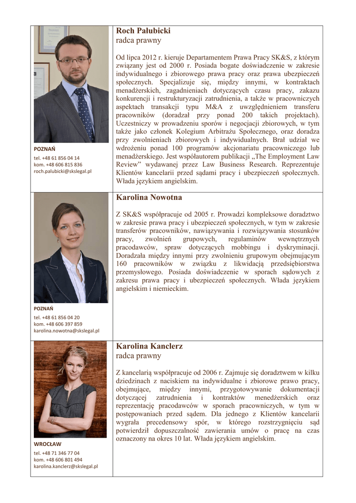 Roch Pałubicki radca prawny POZNAŃ tel. +48 61 856 04 14 kom. +48 606 815 836 [email protected] Od lipca 2012 r. kieruje Departamentem Prawa Pracy SK&S, z którym związany jest od 2000 r. Posiada bogate doświadczenie w zakresie indywidualnego i zbiorowego prawa pracy oraz prawa ubezpieczeń społecznych. Specjalizuje się, między innymi, w kontraktach menadżerskich, zagadnieniach dotyczących czasu pracy, zakazu konkurencji i restrukturyzacji zatrudnienia, a także w pracowniczych aspektach transakcji typu M&A z uwzględnieniem transferu pracowników (doradzał przy ponad 200 takich projektach). Uczestniczy w prowadzeniu sporów i negocjacji zbiorowych, w tym także jako członek Kolegium Arbitrażu Społecznego, oraz doradza przy zwolnieniach zbiorowych i indywidualnych. Brał udział we wdrożeniu ponad 100 programów akcjonariatu pracowniczego lub menadżerskiego. Jest współautorem publikacji „The Employment Law Review” wydawanej przez Law Business Research. Reprezentuje Klientów kancelarii przed sądami pracy i ubezpieczeń społecznych. Włada językiem angielskim. Karolina Nowotna Z SK&S współpracuje od 2005 r. Prowadzi kompleksowe doradztwo w zakresie prawa pracy i ubezpieczeń społecznych, w tym w zakresie transferów pracowników, nawiązywania i rozwiązywania stosunków pracy, zwolnień grupowych, regulaminów wewnętrznych pracodawców, spraw dotyczących mobbingu i dyskryminacji. Doradzała między innymi przy zwolnieniu grupowym obejmującym 160 pracowników w związku z likwidacją przedsiębiorstwa przemysłowego. Posiada doświadczenie w sporach sądowych z zakresu prawa pracy i ubezpieczeń społecznych. Włada językiem angielskim i niemieckim. POZNAŃ tel. +48 61 856 04 20 kom. +48 606 397 859 [email protected] Karolina Kanclerz radca prawny WROCŁAW tel. +48 71 346 77 04 kom. +48 606 801 494 [email protected] Z kancelarią współpracuje od 2006 r. Zajmuje się doradztwem w kilku dziedzinach z naciskiem na indywidualne i zbiorowe prawo pracy, obejmujące, między innymi, przygotowywanie dokumentacji dotyczącej zatrudnienia i kontraktów menedżerskich oraz reprezentację pracodawców w sporach pracowniczych, w tym w postępowaniach przed sądem. Dla jednego z Klientów kancelarii wygrała precedensowy spór, w którego rozstrzygnięciu sąd potwierdził dopuszczalność zawierania umów o pracę na czas oznaczony na okres 10 lat. Włada językiem angielskim. Aleksandra Kozłowska adwokat Z SK&S współpracuje od 2006 r. W centrum jej zainteresowań jest reprezentowanie Klientów kancelarii w sporach sądowych. W ramach tej specjalizacji zdobyła znaczące doświadczenie w sporach sądowych z zakresu prawa pracy i ubezpieczeń społecznych. Doradza również w zakresie relacji ze związkami zawodowymi, transferów pracowników i innych zagadnień prawa pracy. Włada językiem angielskim i niemieckim. WARSZAWA tel. +48 22 608 73 23 kom. +48 698 621 985 [email protected] Joanna Wielgolawska adwokat WARSZAWA Jest w zespole SK&S od 2008 r. Specjalizuje się w sporach sądowych, z naciskiem na zagadnienia prawa pracy. Wielokrotnie reprezentowała Klientów kancelarii w sporach sądowych dotyczących nieuzasadnionego bądź niezgodnego z prawem rozwiązania umowy o pracę, dyskryminacji, mobbingu, wynagrodzenia za pracę w godzinach nadliczbowych i zakazu konkurencji. Posiada także doświadczenie w sprawach karnych dotyczących pracowników. Ponadto, zajmuje się przygotowywaniem dokumentów związanych ze stosunkiem pracy. Włada językiem angielskim i niemieckim. tel. +48 22 608 70 08 kom. +48 600 870 182 [email protected] Katarzyna Gradzik W SK&S pracuje od 2009 r. i specjalizuje się w prawie pracy. Jej doświadczenie obejmuje sądowe sprawy pracownicze, pracownicze badania typu due diligence, a także doradztwo z zakresu prawa pracy, w tym sprawy dotyczące związków zawodowych i układów zbiorowych pracy. Włada językiem angielskim i francuskim. KATOWICE tel. +48 32 731 50 18 kom. +48 790 581 086 [email protected] Irena Pacholewska-Urgacz radca prawny Z kancelarią związana jest od 2010 r. Doradza w sprawach z zakresu prawa cywilnego oraz prawa pracy, a także reprezentuje Klientów kancelarii przed sądami. Posiada doświadczenie w przygotowywaniu oraz negocjowaniu umów o pracę i kontraktów menedżerskich, a także w sprawach dotyczących związków zawodowych. Włada językiem angielskim i francuskim. KATOWICE tel. +48 32 731 50 21 kom. +48 602 757 831 [email protected]