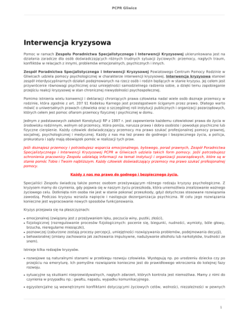 PCPR Gliwice Interwencja kryzysowa Pomoc w ramach Zespołu Poradnictwa Specjalistycznego i Interwencji Kryzysowej ukierunkowana jest na działania zaradcze dla osób doświadczających różnych trudnych sytuacji życiowych: przemocy, nagłych traum, konfliktów w relacjach z innymi, problemów emocjonalnych, psychicznych i innych. Zespół Poradnictwa Specjalistycznego i Interwencji Kryzysowej Powiatowego Centrum Pomocy Rodzinie w Gliwicach udziela pomocy psychologicznej w charakterze interwencji kryzysowej. Interwencja kryzysowa stanowi zespół interdyscyplinarnych działań podejmowanych na rzecz osób i rodzin będących w stanie kryzysu. Jej celem jest przywrócenie równowagi psychicznej oraz umiejętności samodzielnego radzenia sobie, a dzięki temu zapobieganie przejściu reakcji kryzysowej w stan chronicznej niewydolności psychospołecznej. Pomimo istnienia wielu konwencji i deklaracji chroniących prawa człowieka nadal wiele osób doznaje przemocy w rodzinie, która zgodnie z art. 207 §1 Kodeksu Karnego jest przestępstwem ściganym przez prawo. Dlatego warto mówić o uniwersalnych prawach człowieka oraz o szczególnej roli instytucji publicznych i organizacji pozarządowych, których celem jest pomoc ofiarom przemocy fizycznej i psychicznej w domu. Jednym z podstawowych założeń Konstytucji RP z 1997 r. jest zapewnienie każdemu człowiekowi prawa do życia w środowisku rodzinnym, wolnym od przemocy, która poniża, narusza prawa i dobra osobiste i powoduje psychiczne lub fizyczne cierpienie. Każdy człowiek doświadczający przemocy ma prawo szukać profesjonalnej pomocy prawnej, socjalnej, psychologicznej i medycznej. Każdy z nas ma też prawo do godnego i bezpiecznego życia, a policja, prokuratura i sądy mają obowiązek pomóc w realizacji tych praw. Jeśli doznajesz przemocy i potrzebujesz wsparcia emocjonalnego, bytowego, porad prawnych, Zespół Poradnictwa Specjalistycznego i Interwencji Kryzysowej PCPR w Gliwicach udziela takich form pomocy. Jeśli potrzebujesz schronienia pracownicy Zespołu udzielają informacji na temat instytucji i organizacji pozarządowych, które są w stanie pomóc Tobie i Twoim najbliższym. Każdy człowiek doświadczający przemocy ma prawo szukać profesjonalnej pomocy. Każdy z nas ma prawo do godnego i bezpiecznego życia. Specjaliści Zespołu świadczą także pomoc osobom przeżywającym różnego rodzaju kryzysy psychologiczne. Z kryzysem mamy do czynienia, gdy pojawia się w naszym życiu przeszkoda, która uniemożliwia zrealizowanie ważnego życiowego celu. Dotknięta nim osoba nie jest w stanie pokonać przeszkody, gdyż dotychczas stosowane rozwiązania zawodzą. Podczas kryzysu wzrasta napięcie i następuje dezorganizacja psychiczna. W celu jego rozwiązania konieczne jest wypracowanie nowych sposobów funkcjonowania. Kryzys przejawia się na płaszczyznach: ● ● ● ● emocjonalnej (związany jest z przeżywaniem lęku, poczucia winy, pustki, złości), fizjologicznej (rozregulowanie procesów fizjologicznych: pocenie się, biegunki, nudności, wymioty, bóle głowy, brzucha, nieregularne miesiączki), poznawczej (zaburzone zostają procesy percepcji, umiejętności rozwiązywania problemów, podejmowania decyzji), behawioralnej (zmiany zachowania jak zachowania impulsywne, nadużywanie alkoholu lub narkotyków, trudności ze snem). Istnieje kilka rodzajów kryzysów. ● ● ● rozwojowe są naturalnymi stanami w przebiegu rozwoju człowieka. Występują np. po urodzeniu dziecka czy po przejściu na emeryturę. Ich pomyślne rozwiązanie konieczne jest do prawidłowego wkroczenia do kolejnej fazy rozwoju. sytuacyjne są skutkami nieprzewidywalnych, nagłych zdarzeń, których kontrola jest niemożliwa. Mamy z nimi do czynienia w przypadku np.: gwałtu, napadu, wypadku komunikacyjnego. egzystencjalne są wewnętrznymi konfliktami dotyczącymi życiowych celów, wolności, niezależności w pewnych 1 PCPR Gliwice obszarach. Kryzys taki wystąpić może w pewnym wieku (często średnim) jako wynik braku poczucia sensu własnego życia. ● środowiskowe mają miejsce, gdy osobę lub grupę osób spotyka naturalna lub wywołana działaniem ludzkim katastrofa. Wywołują je powodzie, trzęsienia ziemi, epidemie i wojny. Skutki kryzysu mogą być zarówno pozytywne jak i negatywne. W pierwszym przypadku kryzys jest początkiem zmiany na lepsze i rozwoju. W drugim przypadku kryzys prowadzić może do zachowań destrukcyjnych. Niektóre osoby potrafią sobie poradzić same w przezwyciężaniu kryzysu i czerpać z tego doświadczenia, inni załamują się i nie są zdolni do samodzielnego przezwyciężenia kryzysu. W przypadku, gdy osoba nie jest w stanie sama przezwyciężyć kryzysu, a stres jest bardzo silny, warto jest wówczas zwrócić się o pomoc do specjalisty. 2