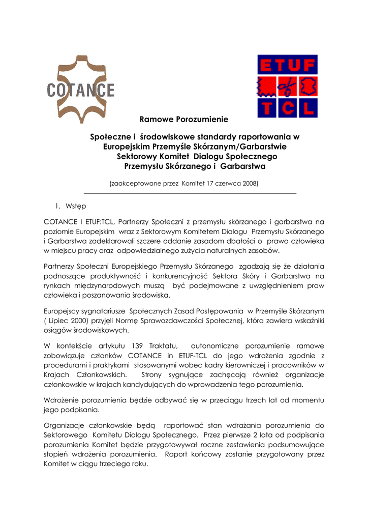 Ramowe Porozumienie Społeczne i środowiskowe standardy raportowania w Europejskim Przemyśle Skórzanym/Garbarstwie Sektorowy Komitet Dialogu Społecznego Przemysłu Skórzanego i Garbarstwa (zaakceptowane przez Komitet 17 czerwca 2008) 1. Wstęp COTANCE I ETUF:TCL, Partnerzy Społeczni z przemysłu skórzanego i garbarstwa na poziomie Europejskim wraz z Sektorowym Komitetem Dialogu Przemysłu Skórzanego i Garbarstwa zadeklarowali szczere oddanie zasadom dbałości o prawa człowieka w miejscu pracy oraz odpowiedzialnego zuŜycia naturalnych zasobów. Partnerzy Społeczni Europejskiego Przemysłu Skórzanego zgadzają się Ŝe działania podnoszące produktywność i konkurencyjność Sektora Skóry i Garbarstwa na rynkach międzynarodowych muszą być podejmowane z uwzględnieniem praw człowieka i poszanowania środowiska. Europejscy sygnatariusze Społecznych Zasad Postępowania w Przemyśle Skórzanym ( Lipiec 2000) przyjęli Normę Sprawozdawczości Społecznej, która zawiera wskaźniki osiągów środowiskowych. W kontekście artykułu 139 Traktatu, autonomiczne porozumienie ramowe zobowiązuje członków COTANCE in ETUF-TCL do jego wdroŜenia zgodnie z procedurami i praktykami stosowanymi wobec kadry kierowniczej i pracowników w Krajach Członkowskich. Strony sygnujące zachęcają równieŜ organizacje członkowskie w krajach kandydujących do wprowadzenia tego porozumienia. WdroŜenie porozumienia będzie odbywać się w przeciągu trzech lat od momentu jego podpisania. Organizacje członkowskie będą raportować stan wdraŜania porozumienia do Sektorowego Komitetu Dialogu Społecznego. Przez pierwsze 2 lata od podpisania porozumienia Komitet będzie przygotowywał roczne zestawienia podsumowujące stopień wdroŜenia porozumienia. Raport końcowy zostanie przygotowany przez Komitet w ciągu trzeciego roku. *** Spis Treści: Słowo Wstępu 1. 2. 3. 4. Zakres i zastosowanie Standardy odniesienia Pojęcia i definicje Wymogi 4.1. Zasady ogólne 4.2. Wskaźniki społeczne 4.3. Wskaźniki środowiskowe 5. Wymogi formalne Słowo Wstępu Społeczne raporty i deklaracje środowiskowe są uwaŜane za jedne z najnowocześniejszych narzędzi dostępnych dla firm, które pozwalają na poinformowanie ich środowiska biznesowego i około biznesowego, - np. klientów, instytucji, konkurencji, rynku finansowego, organów kontrolnych, dostawców oraz personelu – o ich społecznym i środowiskowym zaangaŜowaniu. 1. Zakres i zastosowanie Prezentowany dokument przedstawia uŜyteczne wskaźniki dla firm sektora skórzanego, które pozwolą im nakreślić społeczne raporty i deklaracje środowiskowe mające na celu poinformowanie zainteresowanych stron (udziałowców) o ich strategii biznesowej. W tym celu dołączono wykaz społecznych i środowiskowych wskaźników. Ponadto dokument zawiera informacje o niezaleŜnych jednostkach certyfikujących, które przeprowadzają audyty tego rodzaju raportów. Norma ma zastosowanie jeŜeli nie obowiązują inne regulacje w tym zakresie. 2. Standardy odniesienia - COTANCE-ETUF:TCL Społeczne Zasady Postępowania w Sektorze Skórzanym - ISO 9000 ISO 9001 ISO 9004 System Zarządzania Jakością – Podstawy i słownictwo System Zarządzania Jakością – Wymogi System Zarządzania Jakością – Poprawa Jakości Zarządzania - ISO 14001 SA 8000 System Zarządzania Środowiskiem – Wymogi i wskazówki Odpowiedzialność społeczna 8000 3. Pojęcia i Definicje PoniŜsze definicje stosuje się do omawianej normy: 3.1. Strategia społeczna i środowiskowa: cele i ogólne wskazówki organizacji dotyczące zaangaŜowania społecznego i kwestii środowiskowych, formalnie wyraŜone przez kadrę zarządzającą. 3.2. Precedura: precyzyjnie zdefiniowany sposób działania lub proces 3.3. Wskaźnik: jakościowy bądź ilościowy indeks określający poziom danej cechy. 3.4. Raport: dokument mający na celu przekazanie informacji na zewnątrz firmy. 3.5. Ocena: dokument mający wewnętrzne zastosowanie. Z zasady zawiera się w analizie ilościowej. 4. Wymogi 4.1. Zasady ogólne Raport opisuje daną firmę. Wszystkie zawarte informacje w raporcie społecznym i deklaracji środowiskowej są poprawne, weryfikowalne i jasno przedstawione. W raporcie muszą znajdować się przejrzyste informacje o firmie, jej działalności i zaangaŜowanych jednostkach. Raport jest dyskutowany przez przedstawicieli pracodawcy i pracowników. Raport jest jednoznaczny, istnieje moŜliwość zgłaszania uwag do jego treści i składania próśb o dalsze informacje. 4.2. Wskaźniki społeczne Minimum informacji zawartych w raporcie społecznym będzie opartych na następujących wskaźnikach (Q=dotyczący jakości, R=dotyczący ilości, E=wskaźnik ekonomiczny/monetarny) 4.2.1. Wskaźniki dotyczące zasobów ludzkich Q Pracownicy Ogółem Grupy wynikające z postanowień umowy (czas nieokreślony, czas określony,tymczasowy, …) Obecność Związków Zawodowych a) Wiek b) StaŜ pracy c) Wynagrodzenie d) Narodowość e) Nowo zatrudnieni pracownicy/Liczba złoŜonych wypowiedzeń pracownikom f) % męŜczyzn/kobiet wśród personelu g) Programy szkoleniowe (zakończone i planowane) h) Zwolnienia z powodu choroby/wypadku i) Zadowolenie personelu dotyczące: zaplecza socjalnego, przejrzystości celów, systemu motywacji j) Konflikty (strajki, itp.) X R X X E X X X X X X X X X X X X X X X X 4.2.2. Wskaźniki społeczne a) Poparcie dla kodeksu postępowania b) Certyfikat społeczny c) Członkostwo w stowarzyszeniach branŜowych, jednostkach standaryzujących lub innych podobnych organizacjach 4.2.3. Q X X X R E Wskaźniki środowiskowe Raport będzie zawierał przynajmniej następujące kluczowe informacje: 1. Opis cyklu technologicznego i jego zasadniczego wpływu na środowisko, przy uwzględnieniu miejsca gdzie firma rozwija swoją działalność. 2. Wskazanie wszystkich elementów kosztów mających istotne znaczenie dla środowiska, np. - Woda - Powietrze - Odpady - Energia - Inne istotn