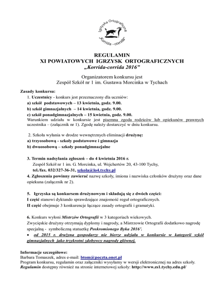 K ” or rid a f a” s I grzy Ortogr a ne icz ka id - co rr REGULAMIN XI POWIATOWYCH IGRZYSK ORTOGRAFICZNYCH „Korrida-corrida 2016” Organizatorem konkursu jest Zespół Szkół nr 1 im. Gustawa Morcinka w Tychach Zasady konkursu: 1. Uczestnicy - konkurs jest przeznaczony dla uczniów: a) szkół podstawowych – 13 kwietnia, godz. 9.00. b) szkół gimnazjalnych – 14 kwietnia, godz. 9.00. c) szkół ponadgimnazjalnych – 15 kwietnia, godz. 9.00. Warunkiem udziału w konkursie jest pisemna zgoda rodziców lub opiekunów prawnych uczestnika – (załącznik nr 1). Zgodę należy dostarczyć w dniu konkursu. 2. Szkoła wyłania w drodze wewnętrznych eliminacji drużynę: a) trzyosobową - szkoły podstawowe i gimnazja b) dwuosobową – szkoły ponadgimnazjalne 3. Termin nadsyłania zgłoszeń – do 4 kwietnia 2016 r. Zespół Szkół nr 1 im. G. Morcinka, ul. Wejchertów 20, 43-100 Tychy, tel./fax. 032/327-36-31, [email protected] 4. Zgłoszenia powinny zawierać nazwę szkoły, imiona i nazwiska członków drużyny oraz dane opiekuna (załącznik nr 2). 5. Igrzyska są konkursem drużynowym i składają się z dwóch części: I część stanowi dyktando sprawdzające znajomość reguł ortograficznych. II część obejmuje 3 konkurencje łączące zasady ortografii i gramatyki. 6. Konkurs wyłoni Mistrzów Ortografii w 3 kategoriach wiekowych. Zwycięskie drużyny otrzymają dyplomy i nagrody, a Mistrzowie Ortografii dodatkowo nagrodę specjalną - symboliczną statuetkę Poskromionego Byka 2016’. od 2015 r. drużyna gospodarzy nie bierze udziału w konkursie w kategorii szkół gimnazjalnych jako trzykrotni zdobywcy nagrody głównej. Informacje szczegółowe: Barbara Tomaszek, adres e-mail: [email protected] Program konkursu, regulamin oraz załączniki wysyłamy w wersji elektronicznej na adres szkoły. Regulamin dostępny również na stronie internetowej szkoły: http://www.zs1.tychy.edu.pl/