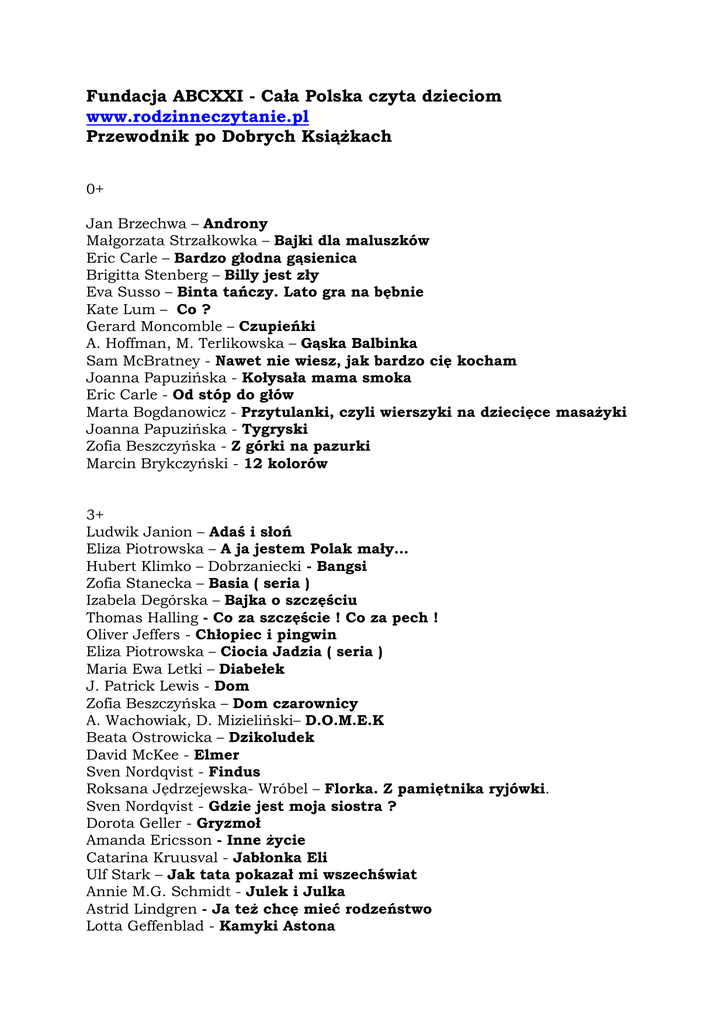Fundacja ABCXXI - Cała Polska czyta dzieciom www.rodzinneczytanie.pl Przewodnik po Dobrych Książkach 0+ Jan Brzechwa – Androny Małgorzata Strzałkowka – Bajki dla maluszków Eric Carle – Bardzo głodna gąsienica Brigitta Stenberg – Billy jest zły Eva Susso – Binta tańczy. Lato gra na bębnie Kate Lum – Co ? Gerard Moncomble – Czupieńki A. Hoffman, M. Terlikowska – Gąska Balbinka Sam McBratney - Nawet nie wiesz, jak bardzo cię kocham Joanna Papuzińska - Kołysała mama smoka Eric Carle - Od stóp do głów Marta Bogdanowicz - Przytulanki, czyli wierszyki na dziecięce masażyki Joanna Papuzińska - Tygryski Zofia Beszczyńska - Z górki na pazurki Marcin Brykczyński - 12 kolorów 3+ Ludwik Janion – Adaś i słoń Eliza Piotrowska – A ja jestem Polak mały… Hubert Klimko – Dobrzaniecki - Bangsi Zofia Stanecka – Basia ( seria ) Izabela Degórska – Bajka o szczęściu Thomas Halling - Co za szczęście ! Co za pech ! Oliver Jeffers - Chłopiec i pingwin Eliza Piotrowska – Ciocia Jadzia ( seria ) Maria Ewa Letki – Diabełek J. Patrick Lewis - Dom Zofia Beszczyńska – Dom czarownicy A. Wachowiak, D. Mizieliński– D.O.M.E.K Beata Ostrowicka – Dzikoludek David McKee - Elmer Sven Nordqvist - Findus Roksana Jędrzejewska- Wróbel – Florka. Z pamiętnika ryjówki. Sven Nordqvist - Gdzie jest moja siostra ? Dorota Geller - Gryzmoł Amanda Ericsson - Inne życie Catarina Kruusval - Jabłonka Eli Ulf Stark – Jak tata pokazał mi wszechświat Annie M.G. Schmidt - Julek i Julka Astrid Lindgren - Ja też chcę mieć rodzeństwo Lotta Geffenblad - Kamyki Astona Joanna Chmielewska - Kłopot Christina Bjork - Linnea w ogrodzie Moneta Roksana Jędrzejewska – Wróbel - Maleńkie królestwo królewny Aurelki A. i D.Mizielińscy - Mapy A. i D. Mizielińscy - Miasteczko Mamoko J.i T. Wieslander - Mama Mu Mądra mysz - seria Liliana Bardijewska - Moje – nie moje Joanna Papuzińska - Mój tato szczęściarz Pija Lindenbaum - Nusia i wilki Stanisław Wygodzki - Odwiedziła mnie żyrafa Jacek Jelonkiewicz - Okruszek z Zaczarowanego Lasu Ian Falconer - Oliwia Wojciech Widłak - Pan Kuleczka ( seria ) Wouter van Reek – Pelerynek i pogoda pod psem Astrid Lindgren - Pewnie, że Lotta umie jeździć na rowerze Anna Onichimowska - Piecyk, czapeczka i budyń Simme Tabback - Płaszcz Józefa Emily Horn - Przepraszam, czy jesteś czarownicą ? Joanna Berendt - Przyjaciele żyrafy. Bajki o empatii. Adam Jaromir - Słoniątko Danuta Wawiłow - Strasznie ważna rzecz Markus Majaluoma - Tato, popłyńmy na wyspę Zdenek Sverak - Ucieszki Cieszka Rotraut Suzanne Berber – Ulica Czereśniowa ( seria ) Przemysław Wechterowicz – W pogoni za życiem Wojciech Widłak - Wesoły Ryjek Małgorzata Strzałkowska - Wiersze do poduchy Małgorzata Strzałkowska - Wiersze, że aż strach Melanie Watt - Wiewiór wystraszony Tove Appelgren, Salla Savolainen – Wilhelmina i aksamitny nosek Maria Marjańska- Czernik - Wypożyczalnia babć Łukasz Wierzbicki - Wyprawa niesłychana Benedykta i Jana Annelore Parot - Yumi Anna Onichimowska - Zasypianki na każdy dzień miesiąca Małgorzata Strzałkowska - Zielony, żółty, rudy, brązowy ! Liliana Bardijewska - Zielony wędrowiec Bibi Dumon Tak - Zwierzaki – cudaki Max Velthuijs – Żabka i obcy 6+ Małgorzata Strykowska-Zaręba – Abecelki Łukasz Wierzbicki – Afryka Kazika Markery Williams – Aksamitny królik Joanna Papuzińska – Asiunia Baśnie świata ( Media Rodzina ) David Williams – Babcia Rabuś Gianni Rodari – Bajki przez telefon Zbigniew Kiersznowski – Baśnie japońskie. Bezpowrotna góra Paweł Beręsewicz – Co tam u Ciumków ? Ivona Brezinova – Cukierek dla dziadka Tadka Afanasjewowie – Czarodziejski Młyn Iwona Chmielewska – Cztery zwykłe miski Ulf Stark – Czy umiesz gwizdać Joanno ? Kim Heekyoung – Dokąd iść ? Mapy mówią do nas Liliana Bardijewska – Dom ośmiu tajemnic Łukasz Wierzbicki – Dziadek i niedźwiadek Oskar Brenifier - Dzieci filozofują ( seria ) David Almond - Dzikus Edith Nesbit – Feniks i dywan Ingelin Angerborn – Gdybym nie pomyliła psów Sali Peltoniemi – Groszka. Piesek, który chciał mieć dziewczynkę Michał Rusinek – Jak robić przekręty. Poradnik dla dzieci T. Kwaśniewski, A. Bedyńska – Jedno oko na Maroko Leo Buscaglia – Jesień liścia Jasia Beata Ostrowicka – Jest taka historia. Opowieść o Januszu Korczaku Katarzyna Kotowska – Jeż Ingmar Fjell – Joachim Lis Grzegorz Kasdepke - Kacperiada Roksana Jędrzejewska – Wróbel - Kamienica Rafał Witek – Klub latających ciotek Maria Ewa Letki – Królewna w koronie Marek Bieńczyk – Książę w cukierni Michael Ende – Kuba Guzik i maszynista Łukasz Łukasz Wierzbicki – Machiną przez Chiny Andrzej Maleszka – Magiczne drzewo ( seria ) Szymon Sławiński – Mały Powstaniec Zuzanna Orlińska – Matka Polka Grzegorz Kasdepke – Mity dla dzieci Rose Lagercrantz – Moje szczęśliwe życie Joanna Papuzińska - Mój tata szczęściarz Tove Jansson – Muminki Zofia Stanecka – Nasza paczka i niepodległość Michael Ende – Niekończąca się historia Gianni Rodari – Niewidzialny Tonino Ulrich Hub – O ósmej na arce Beata Majchrzak – Opowieść o błękitnym psie Małgorzata Strzałkowska – O wartościach Miroslav Sasek – Oto jest Paryż ( seria ) Wanda Chotomska – Panna Kreseczka Heine Janisz – Pan Jaromir i arcyzłodziej Leena Krohn – Pelikan. Opowieść z miasta Asa Lind – Piaskowy Wilk Joanna Olech – Pompon w rodzinie Fisiów Oscar Brenifier – Prawda według Niny Otfried Preussler –Rozbójnik Hotzenplotz Marketa Bankowa - Sroka w krainie entropii Zofia Stanecka – Świat według dziadka Martin Widmark – Tajemnica mumii Paweł Beręsewicz – Tajemnica człowieka z blizną Myoko Matsutani - Tatsu Taro, syn smoka Maria Parr - Tonja z Glimmerdalen Moni Nilsson - Tsatsiki A. i D. Mizielińscy – Tu jesteśmy. Kosmiczne wyprawy, wizje i eksperyment