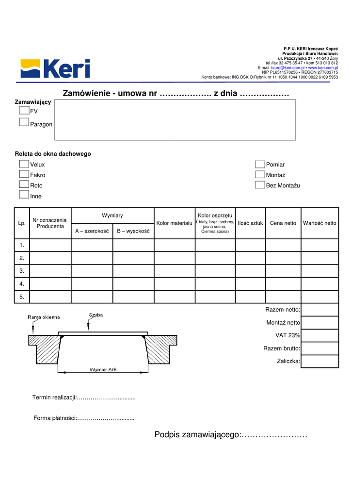 P.P.U. KERI Ireneusz Kopeć Produkcja i Biuro Handlowe: ul. Pszczyńska 27 ▪ 44-240 Żory tel./fax 32 475 35 47 ▪ kom 513 013 812 E-mail: [email protected] ▪ www.keri.com.pl NIP PL6511570256 ▪ REGON 277803715 Konto bankowe: ING BSK O/Rybnik nr 11 1050 1344 1000 0022 6189 5953 Zamówienie - umowa nr ………………. z dnia ……………… Zamawiający FV Paragon Roleta do okna dachowego Velux Pomiar Fakro Montaż Roto Bez Montażu Inne Lp. Nr oznaczenia Producenta Wymiary A – szerokość B – wysokość Kolor osprzętu Kolor materiału ( biały, brąz, srebrny, Ilość sztuk jasna sosna, Ciemna sosna) Cena netto Wartość netto 1. 2. 3. 4. 5. Razem netto: Montaż netto VAT 23% Razem brutto: Zaliczka: Termin realizacji:…………………........... Forma płatności:………………….......... Podpis zamawiającego:……………………