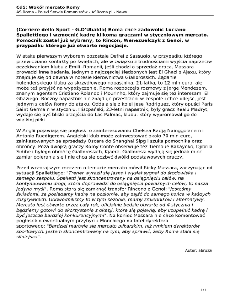 CdS: Wokół mercato Romy AS Roma - Polski Serwis Romanistów - ASRoma.pl - News (Corriere dello Sport - G.D'Ubaldo) Roma chce zadowolić Luciano Spallettiego i wzmocnić kadrę kilkoma graczami w styczniowym mercato. Pomocnik został już wybrany, to Rincon, Wenezuelczyk z Genoi, w przypadku którego już otwarto negocjacje. W ataku pierwszym wyborem pozostaje Defrel z Sassuolo, w przypadku którego przewidziano kontakty po świętach, ale w związku z trudnościami wyjścia naprzeciw oczekiwaniom klubu z Emilii-Romanii, jeśli chodzi o sprzedaż graca, Massara prowadzi inne badania. Jednym z najczęściej śledzonych jest El Ghazi z Ajaxu, który znajduje się od dawna w notesie kierownictwa Giallorossich. Żądanie holenderskiego klubu za skrzydłowego napastnika, 21-latka, to 12 mln euro, ale może też przyjść na wypożyczenie. Roma rozpoczęła rozmowy z Jorge Mendesem, znanym agentem Cristiano Rolando i Mourinho, który zajmuje się też interesami El Ghaziego. Boczny napastnik nie znajduje przestrzeni w zespole i chce odejść, jest jednym z celów Romy do ataku. Oddala się z kolei Jese Rodriguez, który opuści Paris Saint Germain w styczniu. Hiszpański, 23-letni napastnik, były gracz Realu Madryt, wydaje się być bliski przejścia do Las Palmas, klubu, który wypromował go do wielkiej piłki. W Anglii pojawiają się pogłoski o zainteresowaniu Chelsea Radją Nainggolanem i Antonio Ruedigerem. Angielski klub może zainwestować około 70 mln euro, zainkasowanych ze sprzedaży Oscara do Shanghai Sipg i szuka pomocnika oraz obrońcy. Poza dwójką graczy Romy Conte obserwuje też Tiemoue Bakayoko, Djibrila Sidibe i byłego obrońcę Giallorossich, Kjaera. Giallorossi wydają się jednak mieć zamiar opierania się i nie chcą się pozbyć dwójki podstawowych graczy. Przed wczorajszym meczem o temacie mercato mówił Ricky Massara, zaczynając od sytuacji Spallettiego: "Trener wyraził się jasno i wysłał sygnał do środowiska i samego zespołu. Spalletti jest skoncentrowany na osiągnięciu celów, na kontynuowaniu drogi, która doprowadzi do osiągnięcia poważnych celów, to nasza jedyna myśl". Roma stara się zamknąć transfer Rincona z Genoi: "Jesteśmy świadomi, że posiadamy kadrę na poziomie, aby zajść do samego końca w każdych rozgrywkach. Udowodniliśmy to w tym sezonie, mamy zmienników i alternatywy. Mercato jest otwarte przez cały rok, oficjalnie będzie otwarte od 4 stycznia i będziemy gotowi do skorzystania z okazji, które się pojawią, aby uzupełnić kadrę i być jeszcze bardziej konkurencyjnymi". Na koniec Massara nie chce komentować pogłosek o ewentualnym przybyciu Monchiego na fotel dyrektora sportowego: "Bardziej martwię się mercato piłkarskim, niż rynkiem dyrektorów sportowych. Jestem skoncentrowany na tym, aby sprawić, żeby Roma stała się silniejsza". Autor: abruzzi 1/1 Powered by TCPDF (www.tcpdf.org)