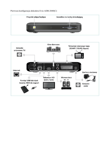 Pierwsza konfiguracja dekodera Evio ADB-2840(C) 1. Po prawidłowym podłączeniu dekodera do telewizora i zasialania na ekranie odbiornika zostanie wyświetlony ekran powitalny. Pamiętaj! Przełączeniu telewizora na odpowiednie wejście, do którego podłączony jest dekoder (np. HDMI1, EURO1, AV). Możesz tego dokonać z pilota telewizora lub klawiszy na jego obudowie zgodnie z instrukcją obsługi dostarczoną przez producenta telewizora. 2. Przy pierwszym uruchomieniu dekodera należy go skonfigurować, aby prawidłowo współpracował z innymi podłączonymi urządzeniami. Potwierdzamy klawiszem OK na pilocie dekodera aby przejść do następnego etapu. 3. Wybież typu telewizora, do którego podłączony jest dekoder. Panoramiczny (16:9) wszystkie telewizory z szerokim, płaskim ekranem LCD/LED. lub Standardowy (4:3) dla telewizy kineskopowe starszego typu. Wybierz za pomocą strzałek przycisk Kontynuuj i potwierdź wybór klawiszem OK 4. Parametry sieci TVK Na ekranie zostanie wyświetlona tabela : Częstotlowość początkowa 330.000 hz Przepływność/bitrate : 6875 QAM : 256 Numer sieci :1 Po wprowadzeniu danych wybierz Kontynuuj i potwierdź klawiszem OK 5. Jeżeli dane zostały prawidłowo wprowadzone do pamięci dekodera automatycznie rozpocznie się proces wyszukiwania kanałów cyfrowych w sieci. Oczekujemy na komunikat pomyślnego wyszukania dostępnych w sieci kanałów. Nasępnie wybieramy Kontynuuj i potwierdź klawiszem OK 6. Aktualizacja oprogramowania Jeżeli wersja oprogramowania jest aktualna wybieramy przycisk Kontynuuj i potwierdź klawiszem OK Po zakończeniu procesu instalacji dekoder jest gotowy do pracy i rozpoczyna odtwarzanie pierwszego dostępnego kanału z listy TV.
