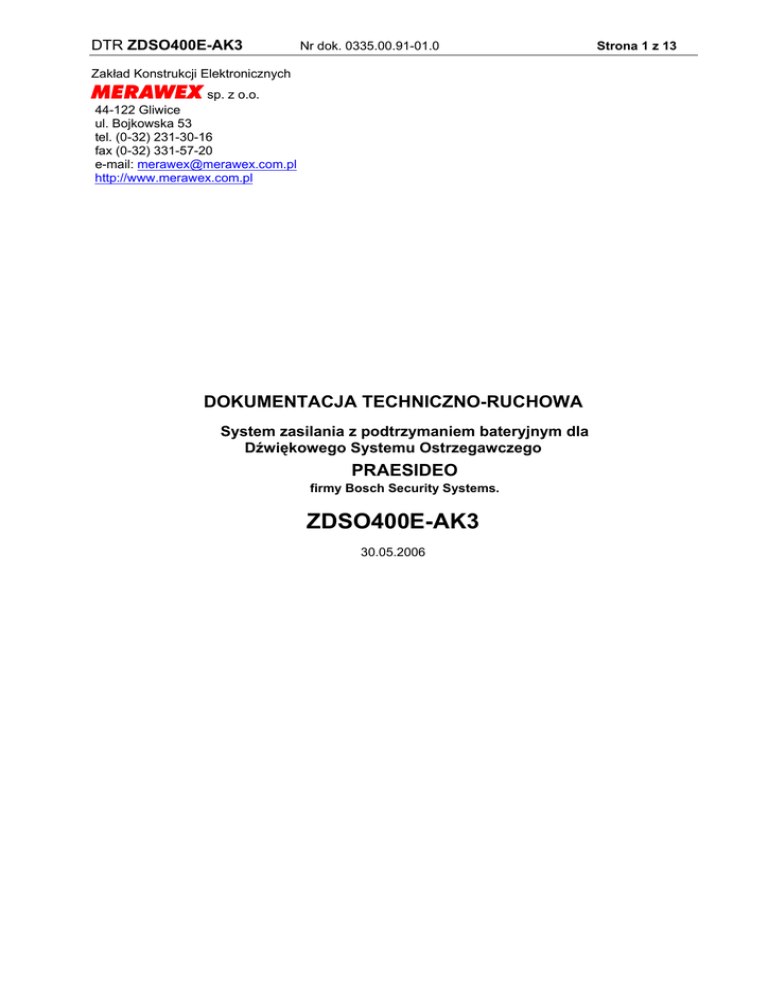 DTR ZDSO400E-AK3 Nr dok. 0335.00.91-01.0 Zakład Konstrukcji Elektronicznych MERAWEX sp. z o.o. 44-122 Gliwice ul. Bojkowska 53 tel. (0-32) 231-30-16 fax (0-32) 331-57-20 e-mail: [email protected] http://www.merawex.com.pl DOKUMENTACJA TECHNICZNO-RUCHOWA System zasilania z podtrzymaniem bateryjnym dla Dźwiękowego Systemu Ostrzegawczego PRAESIDEO firmy Bosch Security Systems. ZDSO400E-AK3 30.05.2006 Strona 1 z 13 DTR ZDSO400E-AK3 Nr dok. 0335.00.91-01.0 Strona 2 z 13 SPIS TREŚCI 1. WSTĘP. ...................................................................................................................................................... 3 1.1. PRZEZNACZENIE..................................................................................................................................... 3 2. FORMULARZ TECHNICZNY.................................................................................................................. 3 2.1. OGÓLNY OPIS SYSTEMU......................................................................................................................... 3 2.2. MAKSYMALNA KONFIGURACJA SYSTEMU ZASILANIA. ............................................................................. 5 2.3. WARUNKI EKSPLOATACJI........................................................................................................................ 5 2.4. DANE TECHNICZNE. ................................................................................................................................ 5 2.4.1. Znamionowe parametry zasilacza ZDSO-400-E ....................................................................... 5 2.4.2. Bezpieczeństwo użytkowania....................................................................................................... 6 2.4.3. Parametry mechaniczne. .............................................................................................................. 6 2.5. KONSTRUKCJA........................................................................................................................................ 6 2.6. ZASADA DZIAŁANIA. ................................................................................................................................ 7 2.7. KONTROLA STANU PRACY. ..................................................................................................................... 8 2.7.1. Wykrywanie i sygnalizacja stanów alarmowych w wieloszafowych systemach zasilania... 9 2.8. UKŁADY SYSTEMU ZASILANIA. .............................................................................................................. 10 3. INSTALOWANIE, OBSŁUGA I EKSPLOATACJA. .......................................................................... 11 3.1. BEZPIECZEŃSTWO PRACY I OBSŁUGI. .................................................................................................. 11 3.2. INSTALOWANIE ...................................................................................................................................... 11 3.2.1. Wskazówki ogólne ....................................................................................................................... 11 3.2.2. Podłączenie sieci elektroenergetycznej.................................................................................... 11 3.2.3. Podłączenie baterii akumulatorów............................................................................................. 12 3.2.4. Podłączenie zasilania do odbiorów ........................................................................................... 12 3.2.5. Wyprowadzenia alarmów............................................................................................................ 12 3.2.6. Podłączenie dodatkowych sygnałów alarmowych .................................................................. 12 3.3. POŁĄCZENIE SZAF WIELOSZAFOWYCH SYSTEMÓW DSO.................................................................... 12 3.4. OBSŁUGA.............................................................................................................................................. 12 3.5. KONSERWACJA I NAPRAWY. ................................................................................................................. 12 3.5.1. Konserwacja. ................................................................................................................................ 12 3.5.2. Usuwanie uszkodzeń................................................................................................................... 12 4. PAKOWANIE, PRZECHOWYWANIE, TRANSPORT....................................................................... 13 4.1. PAKOWANIE. ......................................................................................................................................... 13 4.2. PRZECHOWYWANIE. ............................................................................................................................. 13 4.3. TRANSPORT.......................................................................................................................................... 13 5. INFORMACJE DODATKOWE.............................................................................................................. 13 5.1. UWAGI PRODUCENTA. .......................................................................................................................... 13 5.2. DOKUMENTY ZWIĄZANE ........................................................................................................................ 13 DTR ZDSO400E-AK3 Nr dok. 0335.00.91-01.0 Strona 3 z 13 1. Wstęp. Niniejsza DTR jest dokumentem dla użytkowników systemu zasilania z podtrzymaniem bateryjnym ZDSO400E-AK3 przeznaczonego dla Dźwiękowego Systemu Ostrzegawczego (DSO) PRAESIDEO firmy Bosch Security Systems. Zawiera dane oraz wskazówki niezbędne do zapoznania się z zasadami funkcjonowania, sposobem instalowania i obsług