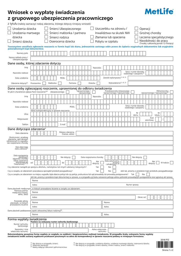 Wniosek o wypłatę świadczenia z grupowego ubezpieczenia pracowniczego z tytułu (należy zaznaczyć rodzaj zdarzenia, którego dotyczy niniejszy wniosek) Uszczerbku na zdrowiu / Inwalidztwa na skutek NW Złamania lub oparzenia Pobytu w szpitalu Śmierci Ubezpieczonego Śmierci małżonka / partnera Śmierci rodzica Osierocenia dziecka Urodzenia dziecka Urodzenia martwego dziecka Śmierci dziecka Operacji Groźnej choroby Leczenia specjalistycznego Niezdolności do pracy (Trwałej i całkowitej ponad 12 miesięcy) Towarzystwo umożliwia zgłoszenie roszczenia w formie kopii lub skanu, jednocześnie zastrzega sobie prawo do żądania oryginalnych dokumentów lub oryginalnie poświadczonych kopii dokumentów. Numery polis Nazwa zakładu pracy / Ubezpieczającego Dane osoby, której zdarzenie dotyczy Imię Nazwisko Seria i numer dowodu osobistego / paszportu1) Nazwisko rodowe Data urodzenia Zdarzenie dotyczy2): D D M M R R R R Zawód wykonywany1), 4), 5) PESEL Małżonka Pracownika Partnera Wykształcenie1), 4), 5) Dziecka Dane osoby zgłaszającej roszczenie, uprawnionej do odbioru świadczenia W jakim charakterze zgłasza Pan/i roszczenie?2) Uprawnionego / Uposażonego Ubezpieczonego Imię Przedstawiciela Ustawowego Uprawnionego / Uposażonego Pełnomocnika Uprawnionego / Uposażonego3) Nazwisko Nazwisko rodowe Data urodzenia D D M M R R R R Seria i numer dowodu osobistego / paszportu PESEL Adres korespondencyjny w sprawie roszczenia Nr domu Ulica Nr lokalu Kod pocztowy Miejscowość – E-mail Telefon Dane dotyczące zdarzenia4) Data zdarzenia D D M M R R R R D D M M R R R R Miejsce zdarzenia (nazwa, adres) Okoliczności, przebieg zdarzenia, opis obrażeń odniesionych w wypadku lub rozpoznanie choroby Opis obecnego stanu zdrowia1) Data wystąpienia pierwszych objawów choroby Okres zwolnienia lekarskiego po hospitalizacji1), 5) od D D M M R R R R Data rozpoznania choroby Nie dotyczy do D D M M R R R R Nie dotyczy Czy zdarzenie nastąpiło po spożyciu alkoholu, narkotyków lub innych substancji toksycznych? Tak Czy w związku ze zdarzeniem pracodawca sporządził protokół powypadkowy? Tak D D M M Data zakończenia leczenia i rehabilitacji1), 5) Nie Nie R R R R Nie dotyczy D D M M R R R R Nie dotyczy W trakcie Jeśli tak, prosimy o przesłanie kopii protokołu powypadkowego. Nie Czy w związku ze zdarzeniem na miejscu wypadku była obecna policja lub czy policja, prokuratura lub sąd prowadziły lub prowadzą postępowanie? Tak Jeśli tak, prosimy o przesłanie kopii dokumentacji w sprawie, a w przypadku jej braku wskazanie pełnego adresu jednostek prowadzących postępowanie oraz sygnatury akt sprawy. Nazwa Numer sprawy Adres Dane placówek medycznych, w których prowadzono leczenie w związku ze zdarzeniem. Pierwsza pomoc Nazwa medyczna (nazwa, adres, data) Okres: od Adres Pozostałe adresy placówek, w których prowadzono leczenie Nazwa Nazwa Adres Adres D D M M R R R R Dane placówki podstawowej opieki zdrowotnej (lekarz rodzinny)5). Nazwa Adres Forma wypłaty świadczenia Przelew na wskazany numer rachunku bankowego Numer rachunku bankowego Nazwisko i imię Adres właściciela właściciela rachunku rachunku Rekomendujemy powyższą formę wypłaty ze względu na szybkość i bezpieczeństwo realizacji świadczenia. W przypadku braku wskazania formy wypłaty świadczenia środki zostaną wypłacone przekazem pocztowym na adres do korespondencji w sprawie roszczenia podany w niniejszym formularzu. 2016 FO 1) 2) 3) Nie dotyczy w przypadku śmierci. Właściwe zaznaczyć. Należy dołączyć dokument pełnomocnictwa. 4) 5) Nie dotyczy w przypadku urodzenia dziecka, urodzenia martwego dziecka, osierocenia dziecka. Nie dotyczy w przypadku śmierci dziecka, śmierci rodzica, śmierci małżonka. Strona 1 z 2 Oświadczenia Przyjmuję do wiadomości, że MetLife TUnŻiR S.A. przetwarzać będzie moje dane osobowe na podstawie przepisów Ustawy o działalności ubezpieczeniowej i reasekuracyjnej oraz Ustawy o przeciwdziałaniu praniu pieniędzy oraz finansowaniu terroryzmu w celu wykonania obowiązków wynikających z ich treści. Wyrażam zgodę na przekazywanie mi drogą elektroniczną na podany przeze mnie numer telefonu i adres e-mail informacji związanych z wykonaniem zawartej umowy ubezpieczenia, w szczególności dotyczących zgłoszonych roszczeń. Uwaga. Nie jest to zgoda na otrzymywanie ze strony MetLife TUnŻiR S.A. informacji reklamowych. Tak Nie Jestem świadomy/a, iż podanie moich danych osobowych jest dobrowolne, oraz że mam prawo wglądu do moich danych osobowych oraz prawo ich poprawiania. Świadomy/a odpowiedzialności karnej za składanie fałszywych zeznań wynikającej z art. 233 k.k. oświadczam, że przesłane przeze mnie kopie dokumentów są zgodne z oryginałami, które posiadam, a informacje i odpowiedzi na pytania zawarte na 1 i 2 stronie formularza są prawdziwe i zgodne ze stanem faktycznym. W razie poświadczenia nieprawdy zobowiązuję się zwrócić otrzymane świadczenie w terminie 14 dni od daty wezwania przez Towarzystwo. Zostałem/am poinformowany/a przez MetLife TUnŻiR S.A., że wszelkie reklamacje wynikające z umowy ubezpieczenia winny być przesyłane do Towarzystwa pisemnie, elektronicznie na adres e-mail wskazany przez Towarzystwo, telefonicznie na numer wskazany przez Towarzystwo (do protokołu) lub osobiście w siedzibie Towarzystwa lub Agencji MetLife (do protokołu). W przypadku zaś nieuznania reklamacji przez Towarzystwo, organem właściwym do rozpatrzenia reklamacji jest Miejski i Powiatowy Rzecznik Konsumenta, Rzecznik Finansowy, Komisja Nadzoru Finansowego lub istnieje możliwość wystąpienia z powództwem do sądu powszechnego. Reklamacje Klientów będących osobami fizycznymi rozpatrywane są w ciągu 30 dni od dnia ich otrzymania przez Towarzystwo. W sprawach szczególnie skomplikowanych wspomniany powyżej termin może ulec wydłużeniu maksymalnie do 60 dni, o czym osoba składająca reklamację zostanie poinformowana. Pol