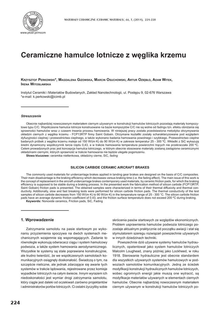 MATERIA£Y CERAMICZNE /CERAMIC MATERIALS/, 66, 3, (2014), 224-228 www.ptcer.pl/mccm Ceramiczne hamulce lotnicze z wĊglika krzemu KRZYSZTOF PERKOWSKI*, MAGDALENA GIZOWSKA, MARCIN OSUCHOWSKI, ARTUR OZIĉBàO, ADAM WITEK, IRENA WITOSàAWSKA Instytut Ceramiki i Materiaáów Budowlanych, Zakáad Nanotechnologii, ul. PostĊpu 9, 02-676 Warszawa *e-mail: [email protected] Streszczenie Obecnie najbardziej nowoczesnym materiaáem ciernym uĪywanym w konstrukcji hamulców lotniczych pozostają materiaáy kompozytowe typu C/C. Wspóáczesne hamulce lotnicze konstruowane na bazie kompozytów C/C nie są wolne od fadingu tzn. efektu obniĪania siĊ sprawnoĞci hamulców wraz z czasem trwania procesu hamowania. W niniejszej pracy zostaáa przedstawiona metodyka otrzymywania okáadzin ciernych z wĊglika krzemu - FCP13RTP ¿rmy Saint Gobain. Otrzymane ksztaátki zostaáy scharakteryzowane pod wzglĊdem dyfuzyjnoĞci cieplnej i przewodnictwa cieplnego, a takĪe wykonano badania hamowania powolnego i szybkiego. Przewodnictwo cieplne badanych próbek z wĊglika krzemu maleje od 150 W/(m·K) do 90 W/(m·K) w zakresie temperatur 25 - 300 ºC. Wkáadki z SiC wykazują Ğredni dynamiczny wspóáczynnik tarcia rzĊdu 0,43, a w trakcie hamowania temperatura powierzchni trących nie przekraczaáa 200 ºC. Celem prowadzonych prac jest koncepcja hamulca lotniczego, w którym obecnie stosowane materiaáy zostaną zastąpione ceramicznymi okáadzinami ciernymi, których sprawnoĞü w trakcie hamowania nie bĊdzie ulegaáa pogorszeniu. Sáowa kluczowe: ceramika nietlenkowa, okáadziny cierne, SiC, fading SILICON CARBIDE CERAMIC AIRCRAFT BRAKES The commonly used materials for undercarriage brakes applied in landing gear brakes are designed on the basis of C/C composites. Their main disadvantage is the braking ef¿ciency which decreases versus braking time (i.e. the fading effect). The main issue of this work is the concept of replacement in the aircraft undercarriage brakes contemporary used materials, by ceramic friction pads, for which the braking ef¿ciency is supposed to be stable during a braking process. In the presented work the fabrication method of silicon carbide (FCP13RTP, Saint Gobain) friction pads is presented. The obtained samples were characterized in terms of their thermal diffusivity and thermal conductivity. Additionally, slow and fast breaking tests were performed for silicon carbide friction pads. The thermal conductivity of the test samples of silicon carbide decreases from 150 W/(m·K) to 90 W/(m·K) in the temperature range of 25 - 300 °C. The silicon carbide friction pads have an average dynamic friction coef¿cient of 0.43, and the friction surface temperature does not exceed 200 ºC during braking. Keywords: Nonoxide ceramics, Friction pads, SiC, Fading 1. Wprowadzenie Zatrzymanie samolotu na pasie startowym po wykonaniu przyziemienia spoczywa na dwóch systemach mechanicznych wzajemnie siĊ wspomagających. Zadanie to równolegle wykonują odwracacz ciągu i system hamulcowy podwozia, a takĪe system hamowania aerodynamicznego. Wszystkie te systemy są stale poprawiane konstrukcyjnie, ale trudno twierdziü, Īe we wspóáczesnych samolotach komunikacyjnych osiągnĊáy doskonaáoĞü. ĝwiadczą o tym, na szczĊĞcie nieliczne, ale jednak zdarzające siĊ awarie tych systemów w trakcie lądowania, rejestrowane przez komisje wypadków lotniczych na caáym Ğwiecie. Innym wyrazem ich niedoskonaáoĞci jest wymiar drogi zatrzymania samolotu, który ciągle jest daleki od oczekiwaĔ zarówno projektantów i administratorów portów lotniczych. Ci ostatni Īyczyliby sobie 224 skrócenia pasów startowych ze wzglĊdów ekonomicznych. Problem usprawnienia hamulców podwozia lotniczego pozostaje aktualnym praktycznie od początku awiacji i staá siĊ stymulatorem szeregu rozwiązaĔ powszechnie uĪywanych w innych dziedzinach techniki. Powszechnie dziĞ uĪywane systemy hamulców hydraulicznych, opatentowaá jako system hamulców lotniczych Malcolm Loughead, znany póĨniej jako Lockheed, w roku 1918. Sterowanie hydrauliczne jest obecnie standardem dla wszystkich uĪywanych systemów hamulcowych w podwoziach samolotów komunikacyjnych. Jedną ze ĞcieĪek mody¿kacji konstrukcji hydraulicznych hamulców lotniczych, wobec ogromnych energii jakie muszą one wytraciü, są mody¿kacje materiaáów uĪywanych w elementach ciernych hamulców. Obecnie najbardziej nowoczesnym materiaáem ciernym uĪywanym w konstrukcji hamulców lotniczych po- CERAMICZNE HAMULCE LOTNICZE Z WĉGLIKA KRZEMU zostają materiaáy kompozytowe typu wĊgiel/wĊgiel. NaleĪy podkreĞliü, Īe swoje szerokie zastosowanie materiaáy te zawdziĊczają poĪądanym cechom materiaáowym takim jak maáa gĊstoĞü (1,7 g/cm3), znaczna przewodnoĞü cieplna, obrabialnoĞü mechaniczna i akceptowalny wspóáczynnik tarcia kompozytu wzglĊdem materiaáu rodzimego [1]. Niska gĊstoĞü jest generalnym wymogiem dla materiaáów o zastosowaniu awiacyjnym. Wysokie przewodnictwo cieplne jest wymagane ze wzglĊdu na potrzebĊ dyssypacji ogromnych iloĞci energii cieplnej generowanej w procesie hamowania samolotu. ObrabialnoĞü mechaniczna jest wymogiem natury serwisowej. Z kolei wspóáczynnik tarcia nie Rys. 1. Morfologia granulatu SiC SIKA TECH FCP13RTP (strzaáką zaznaczono przeáam granuli). Fig. 1. SEM morphology of SiC granules - SIKA TECH FCP13RTP (an arrow indicates the fracture surface of a granule). powinien byü zbyt niski, aby uniknąü koniecznoĞci przesilania konstrukcyjnego spowodowanego potrzebą stosowania zbyt duĪych siá na táoczkach hydraulicznych zapewniających docisk tarcz w procesie hamowania. Materiaá przeznaczony na okáadziny cierne powinien takĪe charakteryzowaü siĊ niską ĞcieralnoĞcią, co podyktowane jest moĪliwym wydáuĪeniem czasu pracy hamulca i redukcji czĊstoĞci kontroli serwisowej. Kolejnym wymogiem stawianym materiaáowi ciernemu, jest moĪliwa redukcja tzw. fadingu, czyli efektu zmniejszani