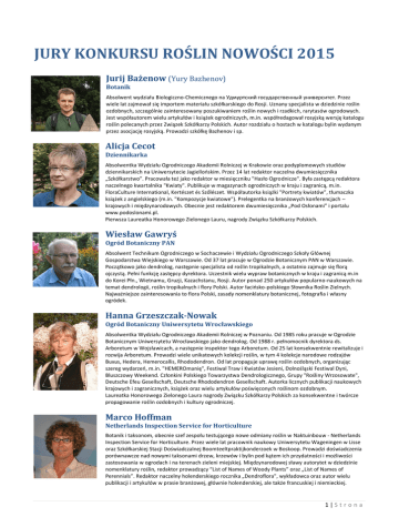 JURY KONKURSU ROŚLIN NOWOŚCI 2015 Jurij Bażenow (Yury Bazhenov) Botanik Absolwent wydziału Biologiczno-Chemicznego na Удмуртский государственный университет. Przez wiele lat zajmował się importem materiału szkółkarskiego do Rosji. Uznany specjalista w dziedzinie roślin ozdobnych, szczególnie zainteresowany poszukiwaniem roślin nowych i rzadkich, rarytasów ogrodowych. Jest współautorem wielu artykułów i książek ogrodniczych, m.in. współredagował rosyjską wersję katalogu roślin polecanych przez Związek Szkółkarzy Polskich. Autor rozdziału o hostach w katalogu bylin wydanym przez asocjację rosyjską. Prowadzi szkółkę Bazhenov i sp. Alicja Cecot Dziennikarka Absolwentka Wydziału Ogrodniczego Akademii Rolniczej w Krakowie oraz podyplomowych studiów dziennikarskich na Uniwersytecie Jagiellońskim. Przez 14 lat redaktor naczelna dwumiesięcznika „Szkółkarstwo”. Pracowała też jako redaktor w miesięczniku "Hasło Ogrodnicze". Była zastępcą redaktora naczelnego kwartalnika "Kwiaty". Publikuje w magazynach ogrodniczych w kraju i zagranicą, m.in. FloraCulture International, Kertészet és Szőlészet. Współautorka książki "Portrety kwiatów”, tłumaczka książek z angielskiego (m.in. "Kompozycje kwiatowe"). Prelegentka na branżowych konferencjach – krajowych i międzynarodowych. Obecnie jest redaktorem dwumiesięcznika „Pod Osłonami” i portalu www.podoslonami.pl. Pierwsza Laureatka Honorowego Zielonego Lauru, nagrody Związku Szkółkarzy Polskich. Wiesław Gawryś Ogród Botaniczny PAN Absolwent Technikum Ogrodniczego w Sochaczewie i Wydziału Ogrodniczego Szkoły Głównej Gospodarstwa Wiejskiego w Warszawie. Od 37 lat pracuje w Ogrodzie Botanicznym PAN w Warszawie. Początkowo jako dendrolog, następnie specjalista od roślin tropikalnych, a ostatnio zajmuje się florą ojczystą. Pełni funkcję zastępcy dyrektora. Uczestnik wielu wypraw botanicznych w kraju i zagranicą m.in do Korei Płn., Wietnamu, Gruzji, Kazachstanu, Rosji. Autor ponad 250 artykułów popularno-naukowych na temat dendrologii, roślin tropikalnych i flory Polski. Autor łacińsko-polskiego Słownika Roślin Zielnych. Najważniejsze zainteresowania to flora Polski, zasady nomenklatury botanicznej, fotografia i własny ogródek. Hanna Grzeszczak-Nowak Ogród Botaniczny Uniwersytetu Wrocławskiego Absolwentka Wydziału Ogrodniczego Akademii Rolniczej w Poznaniu. Od 1985 roku pracuje w Ogrodzie Botanicznym Uniwersytetu Wrocławskiego jako dendrolog. Od 1988 r. pełnomocnik dyrektora ds. Arboretum w Wojsławicach, a następnie inspektor tego Arboretum. Od 25 lat konsekwentnie rewitalizuje i rozwija Arboretum. Prowadzi wiele unikatowych kolekcji roślin, w tym 4 kolekcje narodowe rodzajów Buxus, Hedera, Hemerocallis, Rhododendron. Od lat propaguje uprawę roślin ozdobnych, organizując szereg wydarzeń, m.in. "HEMEROmanię", Festiwal Traw i Kwiatów Jesieni, Dolnośląski Festiwal Dyni, Bluszczowy Weekend. Członkini Polskiego Towarzystwa Dendrologicznego, Grupy "Rośliny Wrzosowate", Deutsche Efeu Gesellschaft, Deutsche Rhododendron Gesellschaft. Autorka licznych publikacji naukowych krajowych i zagranicznych, książek oraz wielu artykułów poświęconych roślinom ozdobnym. Laureatka Honorowego Zielonego Laura nagrody Związku Szkółkarzy Polskich za konsekwentne i twórcze propagowanie roślin ozdobnych i kultury ogrodniczej. Marco Hoffman Netherlands Inspection Service for Horticulture Botanik i taksonom, obecnie szef zespołu testującego nowe odmiany roślin w Naktuinbouw - Netherlands Inspection Service for Horticulture. Przez wiele lat pracownik naukowy Uniwersytetu Wageningen w Lisse oraz Szkółkarskiej Stacji Doświadczalnej Boomteeltpraktijkonderzoek w Boskoop. Prowadzi doświadczenia porównawcze nad nowymi taksonami drzew, krzewów i bylin pod kątem ich przydatności i możliwości zastosowania w ogrodach i na terenach zieleni miejskiej. Międzynarodowej sławy autorytet w dziedzinie nomenklatury roślin, redaktor prowadzący “List of Names of Woody Plants” oraz „List of Names of Perennials”. Redaktor naczelny holenderskiego rocznika „Dendroflora", wykładowca oraz autor wielu publikacji i artykułów w prasie branżowej, głównie holenderskiej, ale także francuskiej i niemieckiej. 1|S t r o n a Izabela Kaszuba Polskie Stowarzyszenie Centrów Ogrodniczych Absolwentka Wydziału Ogrodniczego SGGW. W latach 1977-1997 prowadziła wraz z mężem szklarniowe gospodarstwo ogrodnicze produkujące kwiaty cięte. Była jednym z pierwszych w kraju ogrodników prowadzącym na dużą skalę uprawę storczyków z rodzaju Phalenopsis i Cymbidium. Od 1993 prowadzi wspólnie z mężem i synami Centrum Ogrodnicze Flora Point Świat Roślin w Warszawie-Anin. Jest członkiem założycielem oraz aktywną działaczką Polskiego Stowarzyszenia Centrów Ogrodniczych. Uczestniczyła w nagraniach programów telewizyjnych poświęconych tematyce ogrodniczej. W 2014 roku została uhonorowana przez burmistrza dzielnicy Warszawa-Wawer nagrodą "Wawerczyk Roku" przyznawaną dla wyjątkowych osobowości pracujących na terenie dzielnicy. Jej hobby to własnych ogród oraz podróże ogrodnicze do najciekawszych przyrodniczo miejsc na świecie. Danuta Młoźniak Portal Ogrodowisko.pl Danuta Młoźniak - projektantka i ogrodniczka z wieloletnim stażem i ogromną pasją, którą zaraża ogrodników w Polsce, właścicielka pracowni Gardenarium i popularnego portalu Ogrodowisko, a także prywatnego ogrodu, który znalazł się wśród 100 najpiękniejszych ogrodów świata w książce Emmy Reuss w kategorii "mały ogród formalny". Prowadzi wszechstronną działalność jeśli chodzi o publikacje od 2006 roku (chronologicznie: Kwietnik, Ogrody, Twój Ogrodnik, Murator, Ładny Dom, Magnolia, Zieleń to Życie, Newsweek, Weranda i inne), udział w programach telewizyjnych i radiowych, ostatnio wydała własną książkę "Jak zaprojektowa