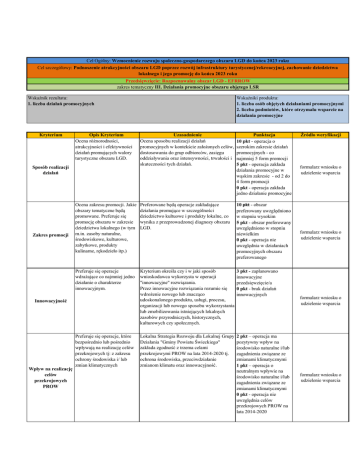 Cel Ogólny: Wzmocnienie rozwoju społeczno-gospodarczego obszaru LGD do końca 2023 roku Cel szczegółowy: Podnoszenie atrakcyjności obszaru LGD poprzez rozwój infrastruktury turystycznej/rekreacyjnej, zachowanie dziedzictwa lokalnego i jego promocję do końca 2023 roku Przedsięwzięcie: Rozpoznawalny obszar LGD - EFRROW zakres tematyczny III. Działania promocyjne obszaru objętego LSR Wskaźnik rezultatu: 1. liczba działań promocyjnych Kryterium Opis Kryterium Ocena różnorodności, atrakcyjności i efektywności działań promujących walory turystyczne obszaru LGD. Uzasadnienie Ocena sposobu realizacji działań promocyjnych w kontekście założonych celów, dostosowania do grup odbiorców, zasięgu oddziaływania oraz intensywności, trwałości i skuteczności tych działań. Punktacja 10 pkt - operacja o szerokim zakresie działań promocyjnych - co najmniej 5 form promocji 5 pkt - operacja zakłada działania promocyjne w wąskim zakresie - od 2 do 4 form promocji 0 pkt - operacja zakłada jedno działanie promocyjne Ocena zakresu promocji. Jakie obszary tematyczne będą promowane. Preferuje się promocję obszaru w zakresie dziedzictwa lokalnego (w tym m.in. zasoby naturalne, środowiskowe, kulturowe, zabytkowe, produkty kulinarne, rękodzieło itp.) Preferowane będą operacje zakładające działania promujące w szczególności dziedzictwo kultuowe i produkty lokalne, co wynika z przeprowadzonej diagnozy obszaru LGD. 10 pkt - obszar preferowany uwzględniono w stopniu wysokim 5 pkt - obszar preferowany uwzględniono w stopniu niewielkim 0 pkt - operacja nie uwzględnia w działaniach promocyjnych obszaru preferowanego Preferuje się operacje wdrażające co najmniej jedno działanie o charakterze innowacyjnym. Kryterium określa czy i w jaki sposób wnioskodawca wykorzysta w operacji "innowacyjne" rozwiązania. Przez innowacyjne rozwiązania rozumie się wdrożenie nowego lub znacząco udoskonalonego produktu, usługi, procesu, organizacji lub nowego sposobu wykorzystania lub zmobilizowania istniejących lokalnych zasobów przyrodniczych, historycznych, kulturowych czy społecznych. 3 pkt - zaplanowano innowacyjne przedsięwzięcie/a 0 pkt - brak działań innowacyjnych Lokalna Strategia Rozwoju dla Lokalnej Grupy Działania "Gminy Powiatu Świeckiego" zakłada zgodność z trzema celami przekrojowymi PROW na lata 2014-2020 tj. ochrona środowiska, przeciwdziałanie zmianom klimatu oraz innowacyjność. 2 pkt – operacja ma pozytywny wpływ na środowisko naturalne i/lub zagadnienia związane ze zmianami klimatycznymi 1 pkt – operacja o neutralnym wpływie na środowisko naturalne i/lub zagadnienia związane ze zmianami klimatycznymi 0 pkt - operacja nie uwzględnia celów przekrojowych PROW na lata 2014-2020 Sposób realizacji działań Zakres promocji Innowacyjność Wpływ na realizację celów przekrojowych PROW Wskaźniki produktu: 1. liczba osób objętych działaniami promocyjnymi 2. liczba podmiotów, które otrzymału wsparcie na działania promocyjne Preferuje się operacje, które bezpośrednio lub pośrednio wpływają na realizację celów przekrojowych tj: z zakresu ochrony środowiska i/ lub zmian klimatycznych Źródło weryfikacji formularz wniosku o udzielenie wsparcia formularz wniosku o udzielenie wsparcia formularz wniosku o udzielenie wsparcia formularz wniosku o udzielenie wsparcia Preferuje się operacje uwzględniające wytyczne w zakresie realizacji zasady równości szans i niedyskryminacji, w tym dostępności dla osób z Dostosowanie do niepełnosprawnościami oraz zasady równości szans kobiet i potrzeb osób niepełnosprawnych mężczyzn w ramach funduszy unijnych na lata 2014-2020 Osoby niepełnosprawne oraz osoby w podeszłym wieku mogą stanowić potencjalną grupę odbiorców działąń promocyjnych, tym bardziej, że stanowią coraz liczniejszą grupę sektora turystycznego. Aby osoby niepełnosprawne mogły być odbiorcą działań promocyjnych, należy stworzyć im odpowiednie do tego warunki. Kryterium polega na ocenie czy w ramach realizacji operacji zaplanowano usprawnienia dla osób niepełnosprawnych oraz w jaki sposób będzie to realizowane. 3 pkt - operacja zakłada rozwiązania dostosowane do potrzeb osób niepełnosprawnych 0 pkt - operacja nie zakłada dostosowań do potrzeb osób niepełnosprawnych Preferuje się wnioskodawców, którzy w zakresie przygotowania wniosku o udzielenie wsparcia korzystali ze wsparcia doradczego oferowanego przez LGD w formie bezpośredniej wizyty w biurze LGD. Korzystanie przez wnioskodawców z bezpośredniego doradztwa w biurze LGD ma na celu zapewnienie jak najwyższej jakości składanych wniosków oraz ma wpłynąć na prawidłową realizację działań i osiągnięcie założonych wskaźników. 5 pkt - wnioskodawca korzystał min. dwukrotnie z doradztwa LGD w zakresie przygotowania wniosku o udzielenie wsparcia, 2 pkt - wnioskodawca korzystał raz z doradztwa LGD w zakresie przygotowania wniosku o udzielenie wsparcia, 0 pkt - wnioskodawca nie korzystał z doradztwa LGD w zakresie przygotowania wniosku o udzielenie wsparcia Doradztwo LGD Preferowane są operacje wpływające na zwiększenie rozpoznawalności obszaru LGD i wskazujące źródła Wpływ na promocję finansowania działań. LGD i LSR Suma punktów: Promocja obszaru LGD i realizacji operacji w ramach LSR jest istotna z punktu widzenia zapewnienia wysokiej identyfikacji realizowanych działań w ramach LSR przez mieszkańców obszaru i turystów. 3 pkt - zaplanowano co najmniej dwie formy promowania LGD i LSR, 1 pkt - zaplanowano tylko jedną formę promocji LGD i LSR, 0 pkt - brak promocji LGD i LSR 36 pkt. - min. 22 pkt. formularz wniosku o udzielenie wsparcia formularz wniosku o udzielenie wsparcia formularz wniosku o udzielenie wsparcia
