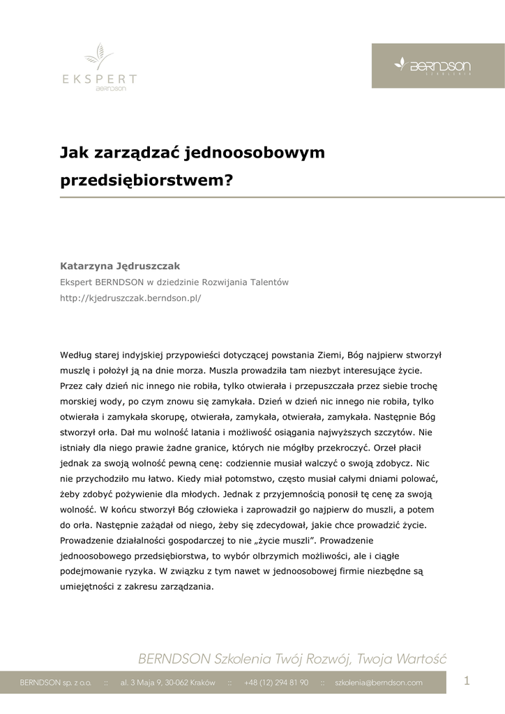 Jak zarządzać jednoosobowym przedsiębiorstwem? Katarzyna Jędruszczak Ekspert BERNDSON w dziedzinie Rozwijania Talentów http://kjedruszczak.berndson.pl/ Według starej indyjskiej przypowieści dotyczącej powstania Ziemi, Bóg najpierw stworzył muszlę i połoŜył ją na dnie morza. Muszla prowadziła tam niezbyt interesujące Ŝycie. Przez cały dzień nic innego nie robiła, tylko otwierała i przepuszczała przez siebie trochę morskiej wody, po czym znowu się zamykała. Dzień w dzień nic innego nie robiła, tylko otwierała i zamykała skorupę, otwierała, zamykała, otwierała, zamykała. Następnie Bóg stworzył orła. Dał mu wolność latania i moŜliwość osiągania najwyŜszych szczytów. Nie istniały dla niego prawie Ŝadne granice, których nie mógłby przekroczyć. Orzeł płacił jednak za swoją wolność pewną cenę: codziennie musiał walczyć o swoją zdobycz. Nic nie przychodziło mu łatwo. Kiedy miał potomstwo, często musiał całymi dniami polować, Ŝeby zdobyć poŜywienie dla młodych. Jednak z przyjemnością ponosił tę cenę za swoją wolność. W końcu stworzył Bóg człowieka i zaprowadził go najpierw do muszli, a potem do orła. Następnie zaŜądał od niego, Ŝeby się zdecydował, jakie chce prowadzić Ŝycie. Prowadzenie działalności gospodarczej to nie „Ŝycie muszli”. Prowadzenie jednoosobowego przedsiębiorstwa, to wybór olbrzymich moŜliwości, ale i ciągłe podejmowanie ryzyka. W związku z tym nawet w jednoosobowej firmie niezbędne są umiejętności z zakresu zarządzania. 1 Zarządzanie sobą w czasie Jednoosobowa firma jest testem naszych umiejętności organizacyjnych. Z jednej strony przedsiębiorca pozostaje niezaleŜny, z drugiej – to od niego zaleŜy jak efektywnie spoŜytkuje kaŜdą chwilę. Warto korzystać z pasującej do naszego stylu pracy metody planowania i organizacji czasu. Czy to będzie „zwykły” kalendarz czy elektroniczne narzędzie – pozostaje w gestii zainteresowanego. Niezmiennie sprawdza się jednak planowanie w oparciu o cele i priorytety: jakie mam zadania oraz jak przedstawia się ich waŜność i pilność. Moje obserwacje i doświadczenie podpowiadają, Ŝe w przypadku przedsiębiorców kluczowymi, elementami planowania powinny być poza pracą odpoczynek i czas wolny. Stephen R. Covey określił to jako „ostrzenie piły”, potocznie mówimy o „ładowaniu akumulatorów”. Nie moŜna być efektywnym pracując cały czas. W zarządzaniu czasem trzeba przede wszystkim pamiętać o sobie. Prawidłowo obchodź się ze stresem Stres to nieodłączny składnik Ŝycia. Nie unikniemy go, ale moŜemy nauczyć się coraz efektywniej sobie z nim radzić. Stres w odniesieniu do przedsiębiorców to w moim odczuciu nieustanne pragnienie osiągania coraz to większej wydajności lub frustracja wobec sytuacji pozostających poza naszym wpływem. Zamiast pisać o „złotych” środkach na stres zacytuje pewną przypowieść. Pewien mędrzec odznaczał się nieprawdopodobną wydajnością pracy, co zauwaŜali jego uczniowie. Spytali go więc, jak to moŜliwe, Ŝe tak cięŜko pracuje, a mimo to nigdy nie sprawia wraŜenia zestresowanego, zawsze jest spokojny i skupiony. Odpowiedź mędrca brzmiała: „ Kiedy stoję, wtedy stoję. Kiedy idę, wtedy idę. Kiedy biegnę, wtedy biegnę.” Uczniowie zaprotestowali: „To nie moŜe być pana tajemnicą, poniewaŜ my takŜe robimy to samo. Dlaczego jednak jesteśmy zestresowani, mimo Ŝe mamy o wiele mniej pracy?. Mędrzec odpowiedział: „Być moŜe powodem tego jest Ŝe: Kiedy stoicie, wtedy juŜ idziecie. Kiedy idziecie, wtedy juŜ biegniecie. Kiedy biegniecie, jesteście juŜ na miejscu docelowym”. Automotywacja Wyjątkowo istotnym elementem pracy „w pojedynkę” jest wytrwałość i umiejętność pozytywnego nastawiania się na realizację celów. Z drugiej strony wykonywanie kaŜdego 2 zawodu wiąŜe się z trudniejszymi okresami, z rozmaitymi zagroŜeniami, czasem momentami zwrotnymi i pytaniami o szanse na przetrwanie firmy. Efektywni przedsiębiorcy uczą się trudnej sztuki radzenia sobie z wyzwaniami jakie przynosi dzień. WaŜne, aby wcielali w Ŝycie zasadę, Ŝe „nie ma poraŜek, są tylko informacje zwrotne”. Do określenia samomotywacji uŜywam takŜe często pewnej metafory. OtóŜ gdybym połoŜyła na podłodze długą na dwa metry, szeroką na 40 cm i sowitą w grubości deskę, to czy znalazł by się śmiałek, aby po niej przejść? Pytanie nie jest podchwytliwe – zadanie przejścia po desce po prostu JEST trywialne. A teraz, ta sama deska, ale umieszczona na wysokości 20 metrów? Są chętni? Pewnie juŜ mniej zdecydowanych na ten wyczyn. Technicznie droga taka sama, ale ta wysokość, ta świadomość konsekwencji... Co to ma do automotywacji? OtóŜ, nie zawieszajmy sobie desek! Fakt, niektóre obiektywnie patrząc są wysoko, ale całe mnóstwo innych – naprawdę leŜy na ziemi! Ocena Kiedy pracujemy „dla” kogoś czy w ramach struktury jakiejś firmy, nieodłącznym elementem naszej pracy jest ocena (postępów, efektywności). W zarządzaniu jednoosobowym przedsiębiorstwem ocena stanowi takŜe jeden z istotniejszych składników pracy. Na pewno nie odbędziemy z nikim rozmowy oceniającej ani teŜ nie otrzymamy arkusza oceny rocznej, ale weryfikacja następuje niemal bez przerwy. Sztuką jest doskonalenie, optymalizacja tego, co robimy – dlatego tak cenna jest analiza sukcesów i poraŜek. PoniewaŜ, „jeśli będziesz postępować tak jak zawsze – otrzymasz to co zawsze”. Delegowanie Prowadząc nawet jednoosobową firmę często polega się na pracy innych. Najczęstszym przykładem delegowania są usługi księgowe. Korzystamy takŜe z porad prawników, zlecamy podwykonawstwo całości lub fragmentu pracy. Olbrzymią szansą jest poszukiwanie specjalisty czy konsultanta do spraw dotacji i pozyskiwania funduszy unijnych. Polscy przedsiębiorcy są w tym przypadku w naprawdę unikalnej syt