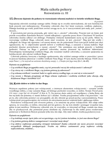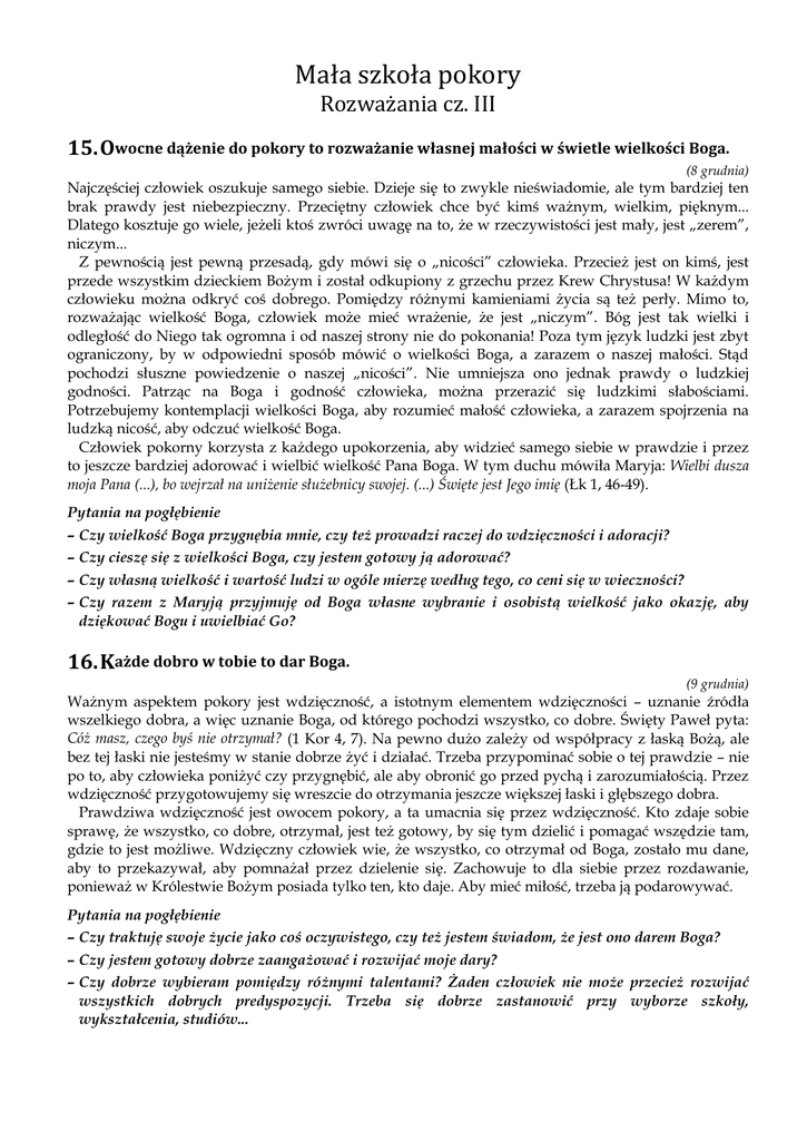 Mała szkoła pokory Rozważania cz. III 15. Owocne dążenie do pokory to rozważanie własnej małości w świetle wielkości Boga. (8 grudnia) Najczęściej człowiek oszukuje samego siebie. Dzieje się to zwykle nieświadomie, ale tym bardziej ten brak prawdy jest niebezpieczny. Przeciętny człowiek chce być kimś ważnym, wielkim, pięknym... Dlatego kosztuje go wiele, jeżeli ktoś zwróci uwagę na to, że w rzeczywistości jest mały, jest „zerem”, niczym... Z pewnością jest pewną przesadą, gdy mówi się o „nicości” człowieka. Przecież jest on kimś, jest przede wszystkim dzieckiem Bożym i został odkupiony z grzechu przez Krew Chrystusa! W każdym człowieku można odkryć coś dobrego. Pomiędzy różnymi kamieniami życia są też perły. Mimo to, rozważając wielkość Boga, człowiek może mieć wrażenie, że jest „niczym”. Bóg jest tak wielki i odległość do Niego tak ogromna i od naszej strony nie do pokonania! Poza tym język ludzki jest zbyt ograniczony, by w odpowiedni sposób mówić o wielkości Boga, a zarazem o naszej małości. Stąd pochodzi słuszne powiedzenie o naszej „nicości”. Nie umniejsza ono jednak prawdy o ludzkiej godności. Patrząc na Boga i godność człowieka, można przerazić się ludzkimi słabościami. Potrzebujemy kontemplacji wielkości Boga, aby rozumieć małość człowieka, a zarazem spojrzenia na ludzką nicość, aby odczuć wielkość Boga. Człowiek pokorny korzysta z każdego upokorzenia, aby widzieć samego siebie w prawdzie i przez to jeszcze bardziej adorować i wielbić wielkość Pana Boga. W tym duchu mówiła Maryja: Wielbi dusza moja Pana (...), bo wejrzał na uniżenie służebnicy swojej. (...) Święte jest Jego imię (Łk 1, 46-49). Pytania na pogłębienie – Czy wielkość Boga przygnębia mnie, czy też prowadzi raczej do wdzięczności i adoracji? – Czy cieszę się z wielkości Boga, czy jestem gotowy ją adorować? – Czy własną wielkość i wartość ludzi w ogóle mierzę według tego, co ceni się w wieczności? – Czy razem z Maryją przyjmuję od Boga własne wybranie i osobistą wielkość jako okazję, aby dziękować Bogu i uwielbiać Go? 16. Każde dobro w tobie to dar Boga. (9 grudnia) Ważnym aspektem pokory jest wdzięczność, a istotnym elementem wdzięczności – uznanie źródła wszelkiego dobra, a więc uznanie Boga, od którego pochodzi wszystko, co dobre. Święty Paweł pyta: Cóż masz, czego byś nie otrzymał? (1 Kor 4, 7). Na pewno dużo zależy od współpracy z łaską Bożą, ale bez tej łaski nie jesteśmy w stanie dobrze żyć i działać. Trzeba przypominać sobie o tej prawdzie – nie po to, aby człowieka poniżyć czy przygnębić, ale aby obronić go przed pychą i zarozumiałością. Przez wdzięczność przygotowujemy się wreszcie do otrzymania jeszcze większej łaski i głębszego dobra. Prawdziwa wdzięczność jest owocem pokory, a ta umacnia się przez wdzięczność. Kto zdaje sobie sprawę, że wszystko, co dobre, otrzymał, jest też gotowy, by się tym dzielić i pomagać wszędzie tam, gdzie to jest możliwe. Wdzięczny człowiek wie, że wszystko, co otrzymał od Boga, zostało mu dane, aby to przekazywał, aby pomnażał przez dzielenie się. Zachowuje to dla siebie przez rozdawanie, ponieważ w Królestwie Bożym posiada tylko ten, kto daje. Aby mieć miłość, trzeba ją podarowywać. Pytania na pogłębienie – Czy traktuję swoje życie jako coś oczywistego, czy też jestem świadom, że jest ono darem Boga? – Czy jestem gotowy dobrze zaangażować i rozwijać moje dary? – Czy dobrze wybieram pomiędzy różnymi talentami? Żaden człowiek nie może przecież rozwijać wszystkich dobrych predyspozycji. Trzeba się dobrze zastanowić przy wyborze szkoły, wykształcenia, studiów... – Czy z radością przyjmuję wszystko, co dobre, jako dar Boży? – Czy służę chętnie swoimi darami materialnymi i duchowymi, czy też traktuję je jako „prywatną własność”, aby wynosić się nad innych...? 17. Jak ośmielasz się liczyć na siebie, skoro wszystko otrzymałeś jako dar Boga? (10 grudnia) Jednym z największych niebezpieczeństw w życiu duchowym jest pewność siebie. Osoba pewna siebie jest podobna do kogoś, kto dopiero zrobił prawo jazdy: dopóki czuje się niepewny, jeździ ostrożnie i nie grożą mu wypadki. Sytuacja zmienia się, gdy poczuje się zbyt pewnie. Uważa może, że teraz nie przydarzy mu się nic złego, skoro przejechał bez trudności kilka tysięcy kilometrów... Także w relacjach międzyludzkich nie wolno za bardzo liczyć na własne siły, mądrość, doświadczenie... Nie znaczy to, że mamy popaść w drugą skrajność. Nieśmiałość też nie jest cnotą, a prawdziwa pokora nie prowadzi do kompleksu niższości. Chodzi raczej o dobrą miarę ostrożności oraz o umiejętność współpracy z łaską Bożą. Kto współdziała z Panem Bogiem, nie musi się bać, jakby wszystko zależało od jego własnych sił i zdolności. Współpraca z łaską Bożą zobowiązuje do tego, aby dawać z siebie wszystko – żeby Pan Bóg mógł dać jeszcze więcej. Prawdziwa pokora prowadzi do zaufania, daje odwagę oraz chroni przed lekkomyślnością i lenistwem. Pytania na pogłębienie – Czy uważam na właściwą równowagę między lekkomyślnością i rozwagą? – Czy także na co dzień mam świadomość, że „bez Boga ani do proga”? – Czy potrafię współpracować z łaską Bożą (to znaczy modlić się tak, jakby wszystko zależało od Boga, i pracować, jakby to zależało tylko od własnego zaangażowania)? – Czy ufam w pomoc Bożą, gdy piętrzą się trudności? – Czy jestem gotowy dać sobie pomóc? 18. Moje życie przemija, jestem jak popiół i dym, a jednak jest we mnie jeszcze tyle pychy i zarozumiałości. (11 grudnia) Życiowym zadaniem każdego człowieka jest jego ludzkie dojrzewanie. Powinien on być zdolny do udziału w miłości Boga w niebie i do od