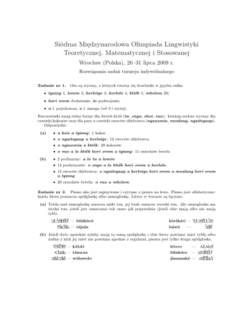 Siódma Międzynarodowa Olimpiada Lingwistyki Teoretycznej, Matematycznej i Stosowanej Wrocław (Polska), 26–31 lipca 2009 r. Rozwiązania zadań turnieju indywidualnego Zadanie nr 1. Oto są wyrazy, z których tworzy się liczebniki w języku sulka: • tgiang 1, lomin 2, korlotge 3, korlolo 4, ktiëk 5, mhelom 20; • hori orom dodawanie, lo podwojenie; • a l. pojedyncza, o l. mnoga (od 3 i wyżej). Rzeczowniki mają różne formy dla dwóch liczb (tu, sngu; vhoi , vuo). Istnieją osobne wyrazy dla czwórki kokosów oraz dla pary a czwórki owoców chlebowca (ngausmia, moulang , ngaitegaap). Odpowiedzi: (a) • a ksie a tgiang : 1 kokos • o ngaitegaap a korlotge: 12 owoców chlebowca • o ngausmia a ktiëk : 20 kokosów • o vuo a lo ktiëk hori orom a tgiang : 11 orzechów betelu (b) • 2 pochrzyny: a lo tu a lomin • 14 pochrzynów: o sngu a lo ktiëk hori orom a korlolo • 15 owoców chlebowca: o ngaitegaap a korlotge hori orom a moulang hori orom a tgiang • 20 orzechów betelu: o vuo a mhelom Zadanie nr 2. Pismo nko jest zapisywane i czytane z prawa na lewo. Pismo jest alfabetyczne: każda litera poznacza spółgłoskę albo samogłoskę. Litery w wyrazie są łączone. (a) Tylda nad samogłoską oznacza niski ton, jej brak oznacza wysoki ton. Ale samogłoska ma średni ton, jeżeli jest oznaczana tak samo jak poprzednia (jeżeli obie mają albo nie mają tyld). — bı̀lákòró kòrikóri — — tájula báwò — (b) Jeżeli dwie sąsiednie sylaby mają tę samą spółgłoskę i obie litery powinny mieć tyldę albo żadna z nich jej mieć nie powinna zgodnie z regułami, pisana jest tylko druga spółgłoska. — kÒlOlÓ lÉtErE — — támEnE bı̀lakóro — — wólowolo jàmanakÉ — 2 Siódma Międzynarodowa Olimpiada Lingwistyki (2009). Rozwiązania zadań turnieju indywidualnego Zadanie nr 3. Łatwo jest zauważyć, że imiona urodzonych w tym samym dniu tygodnia zaczynają się od podobnych głosek: • poniedziałek: kau6 myaP, khi6 le nwE, khai6 mi6 thu6, keþi thu6 • wtorek: zeiya cO, su myaP so, susu wi6, sha6 thu6, shu ma6 cO • środa: wi6 i mu6, lwi6 koko, wi6 cO au6, yadana u, yi6yi6 myi6 • czwartek: pa6 we, pyesou6 au6, mimi khai6, phou6 nai6 thu6, myo khi6 wi6 • sobota: thou6 u6, ne li6, ti6 mau6 laP, thEP au6, ti6 za mO Odpowiedzi: • Nwe si6þu — 13. 07. 2009 (poniedziałek); • so mo cO — 16. 06. 2009 (wtorek); • yE au6 nai6 — 24. 06. 2009 (środa), • daliya — 18. 07. 2009 (sobota), • e ti6 — 14. 06. 2009 (niedziela: urodzonych w niedziele w danych zabrakło, jak i imion, które zaczynają się od samogłosek), • phyuphyu wi6 — 09. 07. 2009 (czwartek). Zadanie nr 4. Jeśli zwarta spólgłoska we rdzeniu jest dźwięczna, jest bezdźwięczna, a samogłoska w sufiksie jest a, akcent jest na sufiksie. akcent jest na rdzeniu. a samogłoska w sufiksie jest i , akcent jest na rdzeniu. akcent jest na sufiksie. (a) Ta reguła działa, gdy we rdzeniu jest dokładnie jedna zwarta spólgłoska. Jeśli jest ich dwie (bhāg-a-, pad-a-, pat-i-) albo nie ma ani jednej (us-ri-), pozycji akcentu nie da się wyznaczyć. ´-mi-, ghar-má-, (b) mr.dh-rá-, phé-na-, stu-tí-, tan-tí-, bhār-á-, dū-tá-, sváp-na-, bhū abh-rá-, ghan-á-, ghŕ. s.-vi-. Siódma Międzynarodowa Olimpiada Lingwistyki (2009). Rozwiązania zadań turnieju indywidualnego 3 Zadanie nr 5. Zdania w języku nahuatl zaczynają się od orzeczenia. Podmiot i dopełnienie (albo dopełnienia) występują za nim w dowolnej kolejności, poprzedzone wyrazem in (rodzajnik określony). Czasownik otrzymuje następujące prefiksy: • podmiot: ni- 1 os. l.p., ti- 2 os. l.p., —— 3 os. l.p.; • dopełnienie: nēch- 1 os. l.p., mitz- 2 os. l.p., k- 3 os. l.p.; • kolejne dopełnienie: tē- ‘kogoś, komuś’, tla- ‘coś’. Oraz następujące sufiksy: • ‘powodować, że ...’: – ‹czasownik nieprzechodni›-tia (z wydłużaniem poprzedzającego i ), – ‹czasownik przechodni›-ltia; • ‘robić dla’: -lia (z przejściem poprzedzającego a na i ). Ta sama czynność z dopełnieniem i bez często jest wyrażana za pomocą różnych czasowników. Odpowiedzi: (a) (b) 18. 19. 20. 21. 22. 23. tiktlazohtlaltia in zihuātl in kuauhxı̄nki nēchtzāhtzı̄tia tikhuı̄teki nikēhuilia in kikatl in tı̄zı̄tl nikneki in ātōlli mitztlakāhualtia 24. 25. 26. 27. 28. on powoduje, że robię atole robisz wino dla kogoś znachor powoduje, że śpisz śpiewam coś przewracam się powodujesz, że kobieta kocha cieślę; powodujesz, że cieśla kocha kobietę on powoduje, że krzyczę bijesz go śpiewam pieśń dla znachora chcę atole on powoduje, że zostawiasz coś nēchchı̄hualtia in ātōlli tiktēchı̄huilia in oktli mitzkochı̄tia in tı̄zı̄tl nitlaēhua nihuetzi