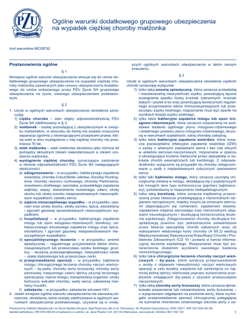 Ogólne warunki dodatkowego grupowego ubezpieczenia na wypadek ciężkiej choroby małżonka kod warunków MCGP32 Postanowienia ogólne §1 Niniejsze ogólne warunki ubezpieczenia stosuje się do umów dodatkowego grupowego ubezpieczenia na wypadek ciężkiej choroby małżonka zawieranych jako umowy ubezpieczenia dodatkowego do umów wskazanego przez PZU Życie SA grupowego ubezpieczenia na życie, zwanego ubezpieczeniem podstawowym. §2 1. Użyte w ogólnych warunkach ubezpieczenia określenia oznaczają: 1) ciężka choroba – stan objęty odpowiedzialnością PZU Życie SA zdefiniowany w § 3, 2) małżonek – osobę pozostającą z ubezpieczonym w związku małżeńskim, w stosunku do której nie została orzeczona separacja zgodnie z obowiązującymi przepisami prawa, której wiek w dniu wystąpienia u niej ciężkiej choroby nie przekracza 70 lat, 3) wiek małżonka – wiek małżonka określony jako różnica lat pomiędzy aktualnym rokiem kalendarzowym a rokiem urodzenia małżonka, 4) wystąpienie ciężkiej choroby, oznaczające zaistnienie w okresie odpowiedzialności PZU Życie SA następujących okoliczności: a) zdiagnozowania – w przypadku: bakteryjnego zapalenia wsierdzia; choroby Creutzfelda-Jakoba; choroby Huntingtona; choroby neuronu ruchowego; choroby Parkinsona; nowotworu złośliwego; oponiaka; przewlekłego zapalenia wątroby; sepsy; stwardnienia rozsianego; udaru; utraty słuchu lub utraty wzroku niespowodowanych nieszczęśliwym wypadkiem; zawału serca; b)zajścia nieszczęśliwego wypadku – w przypadku: oparzeń oraz utraty słuchu, utraty wzroku, tężca, wścieklizny i zgorzeli gazowej spowodowanych nieszczęśliwym wypadkiem; c) hospitalizacji – w przypadku: bakteryjnego zapalenia mózgu lub opon mózgowo-rdzeniowych; boreliozy; odkleszczowego wirusowego zapalenia mózgu oraz tężca, wścieklizny i zgorzeli gazowej niespowodowanych nieszczęśliwym wypadkiem; d)s pecjalistycznego leczenia – w przypadku: anemii aplastycznej – regularnego przyjmowania leków immunosupresyjnych lub przeszczepu szpiku kostnego; gruźlicy – leczenia przeciwprątkowego; niewydolności nerek – stałej dializoterapii lub przeszczepu nerki; e)przeprowadzenia operacji – w przypadku: bąblowca mózgu; chirurgicznego leczenia choroby naczyń wieńcowych – by-pass; choroby aorty brzusznej; choroby aorty piersiowej; masywnego zatoru tętnicy płucnej leczonego operacyjnie; ropnia mózgu; transplantacji organów; utraty kończyny wskutek choroby; wady serca; zakażonej martwicy trzustki; f) zakażenia – w przypadku: zakażenia wirusem HIV. 2. Jeżeli niniejsze ogólne warunki ubezpieczenia nie stanowią odmiennie, określenia, które zostały zdefiniowane w ogólnych warunkach ubezpieczenia podstawowego, używane są w niniej- szych ogólnych warunkach ubezpieczenia w takim samym znaczeniu. §3 Użyte w ogólnych warunkach ubezpieczenia określenia ciężkich chorób oznaczają wyłącznie: 1) tylko taką anemię aplastyczną, która oznacza przewlekłą i nieodwracalną niewydolność szpiku, powodującą łączne wystąpienie spadku liczby krwinek czerwonych, krwinek białych i płytek krwi oraz powodującą konieczność regularnego przyjmowania leków immunosupresyjnych lub przeszczepu szpiku kostnego; rozpoznanie musi być oparte na wynikach biopsji szpiku kostnego; 2) tylko takie bakteryjne zapalenie mózgu lub opon mózgowo-rdzeniowych, które oznacza rozpoznaną na podstawie badania ogólnego płynu mózgowo-rdzeniowego i dodatniego posiewu płynu mózgowo-rdzeniowego, leczoną w warunkach szpitalnych, ostrą chorobę zakaźną; 3) tylko takie bakteryjne zapalenia wsierdzia, które oznacza pozaszpitalne infekcyjne zapalenie wsierdzia (IZW) u osoby z własnymi zastawkami serca i bez ciał obcych w układzie sercowo-naczyniowym, rozpoznane w oparciu o obowiązujące kryteria medyczne przez specjalistę w zakresie chorób wewnętrznych lub kardiologii. Z odpowiedzialności wyłączone są przypadki tej choroby zdiagnozowane u osób z implantowanymi sztucznymi zastawkami serca; 4) tylko taki bąblowiec mózgu, który oznacza usuniętą chirurgicznie zmianę w mózgu, składającą się z pojedynczych lub mnogich larw typu echinococcus (pęcherz bąblowcowy), potwierdzoną w rozpoznaniu histopatologicznym; 5) tylko taką boreliozę, która oznacza krętkowicę przenoszoną przez kleszcze przebiegającą z różnorodnymi objawami narządowymi, między innymi ze zmianami skórnymi objawiającymi się rumieniem, zapaleniem stawów, zapaleniem mięśnia sercowego oraz różnorodnymi objawami neurologicznymi i skutkującą koniecznością leczenia szpitalnego. Zdiagnozowanie choroby skutkujące hospitalizacją powinno być jednoznacznie potwierdzone przez lekarza specjalistę chorób zakaźnych wraz ze wskazaniem właściwego kodu choroby (A 69.2) według Międzynarodowej Statystycznej Klasyfikacji Chorób i Problemów Zdrowotnych ICD 10 i podane w karcie informacyjnej leczenia szpitalnego. Rozpoznanie musi być potwierdzone dodatnim wynikiem swoistego badania immunologicznego; 6) tylko takie chirurgiczne leczenie choroby naczyń wieńcowych – by-pass, które oznacza przeprowadzenie u osoby z objawami niewydolności naczyń wieńcowych operacji w celu korekty zwężenia lub zamknięcia co najmniej jednej tętnicy wieńcowej poprzez wytworzenie przepływów omijających (by-pass) z użyciem przeszczepów naczyniowych; 7) tylko taką chorobę aorty brzusznej, która oznacza tętniakowate poszerzenie lub rozwarstwienie aorty brzusznej – z wyłączeniem odgałęzień na poziomie aorty, które wymagało przeprowadzenia operacji chirurgicznej polegającej na wymianie chorobowo zmienionego odcinka aorty z za- Powszechny Zakład Ubezpieczeń na Życie Spółka Akcyjna, Sąd Rejonowy dla m.st. Warszawy, XII Wydział Gospodarczy, KRS 30211, NIP 527-020-60-56, kapitał zakładowy: 295 000 000,00 zł wpłacony w całości, al. Jana Pawła II 24, 00-133 Warszawa, www.pzu.pl, 