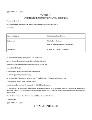 Sygn. akt III AUa 353/15 WYROK W IMIENIU RZECZYPOSPOLITEJ POLSKIEJ Dnia 17 maja 2016 r. Sąd Apelacyjny w Szczecinie - Wydział III Pracy i Ubezpieczeń Społecznych w składzie: Przewodniczący: SSA Romana Mrotek (spr.) Sędziowie: SSA Barbara Białecka SSO del. Anna Stasiewicz-Kokotowska Protokolant: St. sekr. sąd. Elżbieta Kamińska po rozpoznaniu w dniu 17 maja 2016 r. w Szczecinie sprawy (...) spółki z ograniczoną odpowiedzialnością w G. przeciwko Zakładowi Ubezpieczeń Społecznych Oddział w S. przy udziale M. R. (1) o ustalenie obowiązku ubezpieczenia społecznego na skutek apelacji organu rentowego od wyroku Sądu Okręgowego w Szczecinie VI Wydział Pracy i Ubezpieczeń Społecznych z dnia 5 lutego 2015 r. sygn. akt VI U 577/14 1. zmienia zaskarżony wyrok w punkcie I i II i oddala odwołanie, 2. zasądza od (...) spółki z ograniczoną odpowiedzialnością w G. na rzecz Zakładu Ubezpieczeń Społecznych Oddział w S. kwotę 120 zł (sto dwadzieścia złotych) tytułem zwrotu kosztów zastępstwa procesowego w postępowaniu apelacyjnym. SSA Barbara Białecka SSA Romana Mrotek SSO del. Anna Stasiewicz - Kokotowska Sygn. akt III AUa 353/15 UZASADNIENIE Decyzją z dnia 6 marca 2014 r., nr (...) Zakład Ubezpieczeń Społecznych Oddział w S. stwierdził, że M. R. (1), jako osoba wykonująca pracę na podstawie umowy zlecenia u płatnika składek (...) Sp. z o.o., podlega obowiązkowo ubezpieczeniom emerytalnemu, rentowym i wypadkowemu w okresach od 17 czerwca 2010 r. do 21 czerwca 2010 r., od 18 czerwca 2010 r. do 21 czerwca 2010 r., od 6 lipca 2010 r. do 8 lipca 2010 r., od 6 lipca 2010 r. do 8 lipca 2010 r., od 15 czerwca 2011 r. do 20 czerwca 2011 r., od 15 czerwca 2011 r. do 20 czerwca 2011 r., od 29 czerwca 2011 r. do 30 czerwca 2011 r., od 29 czerwca 2011 r. do 30 czerwca 2011 r., od 26 czerwca 2012 r. 27 czerwca 2012 r., od 26 czerwca 2012 r. 27 czerwca 2012 r., od 5 lipca 2012 r. do 10 lipca 2012 r. oraz od 5 lipca 2012 r. do 10 lipca 2012 r., określając zarazem wysokość podstawy wymiaru składek na te ubezpieczenia w miesiącach: czerwiec i lipiec 2010 r., czerwiec i lipiec 2011 r. oraz czerwiec i lipiec 2012 r. Jako podstawę do wydania takiej decyzji wskazano ustalenia postępowania kontrolnego przeprowadzonego u płatnik, z których wynika, że płatnik zawarł z M. R. (1) umowy o dzieło (na czas określony w decyzji), których przedmiotem było faktyczne świadczenie usług w ramach umowy zlecenia na rzecz płatnika polegających na wykonywaniu badań pomiarowo kontrolnych urządzeń elektrycznych. Organ rentowy podkreślił, że w zawartych przez strony umowach brak było indywidualnie oznaczonego rezultatu , a ponadto spółka nie wykazała trwałego, twórczego i niepowtarzalnego charakteru pracy wykonawcy. Odwołanie od powyższej decyzji złożyła spółka (...), zarzucając organowi rentowemu nieuzasadnione przyjęcie, że M. R. (1) powinien być objęty ubezpieczeniem społecznym jako zleceniobiorca, podczas gdy strony zawarły umowy o dzieło. W uzasadnieniu płatnik powołał się na orzecznictwo Sądu Najwyższego i poglądy doktryny, zwracając uwagę na indywidualny charakter pracy wykonywanych przez M. R. (1). Odwołujący się podkreślił, że zainteresowany, posiadając stosowne uprawnienia, dokonywał okresowych przeglądów urządzeń elektrycznych w zakresie bezpieczeństwa przeciwpożarowego i przeciwporażeniowego; w tym zakresie ubezpieczony wykonywał pomiary i sporządzał stosowną dokumentację potwierdzając sprawność urządzeń elektrycznych (maszyn, przewodów, gniazd zasilających) na danym obiekcie w postaci tzw. „protokołów zerowania”. Mając powyższe na względzie wniósł o zmianę zaskarżonej decyzji poprzez uznanie, że M. R. (1) nie podlega obowiązkowemu ubezpieczeniu emerytalno-rentowemu i wypadkowemu oraz zasądzenie na rzecz spółki (...) kosztów procesu, w tym kosztów zastępstwa procesowego według norm przepisanych. W odpowiedzi na odwołanie Zakład Ubezpieczeń Społecznych Oddział w S. wniósł o jego oddalenie w całości, z argumentacją jak w zaskarżonych decyzjach. Zgłosił również wniosek o zasądzenie na rzecz organu rentowego kosztów zastępstwa procesowego według norm przepisanych. Wyrokiem z dnia 5 lutego 2015 r. Sąd Okręgowy w Szczecinie VI Wydział Pracy i (...) zmienił zaskarżoną decyzję w ten sposób, iż ustalił, że zainteresowany M. R. (1) nie podlegał obowiązkowo ubezpieczeniom emerytalnemu i rentowym oraz wypadkowemu w okresach wskazanych w zaskarżonej decyzji oraz zasądził o Zakładu Ubezpieczeń Społecznych Oddziału w S. na rzecz płatnika (...) Sp. z o.o. kwotę 60 zł tytułem zwrotu kosztów zastępstwa procesowego. Sąd I instancji ustalił, że przedmiotem działalności płatnika (...) Sp. z o.o. z siedzibą w G. jest m.in. produkcja rolna w zakresie uprawy oraz zbytu zbóż i rzepaku. Działalność tę prowadzi wykorzystując m.in. kilka dzierżawionych od Agencji Nieruchomości Rolnych obiektów magazynowo-przetwórczych zorganizowanych w tzw. Zakłady Rolne. W obiektach tych prowadzone jest składkowanie, suszenie i przygotowanie ziarna do sprzedaży, do czego wykorzystuje się szereg urządzeń zasilanych energią elektryczną. Co roku przed rozpoczęciem żniw (w czerwcu i w lipcu) spółka w ramach przygotowań dokonuje badania sprzętu zasilanego energią elektryczną pod względem bezpieczeństwa przeciwpożarowego i przeciwporażeniowego. Pomiarów dokonuje się ze względu na utratę ważności poprzednich badań (po roku). Wykonanie tych prac w latach 2010-2012 powierzała do wykonania M. R. (1), posiadającemu uprawnienia zawodowe nadane przez Stowarzyszenie Elektryków (...). W dniu 17 czerwca 2010 r. (...) Sp. z o.o. z siedzibą w G., w imieniu której działał prezes zarządu W. G. oraz M. R. (1) zawarli pisemną umowę, zatytułowaną „umowa o dzieło”, zgodnie z którą zainteresowany miał wykonać – za wynagrodzeniem 