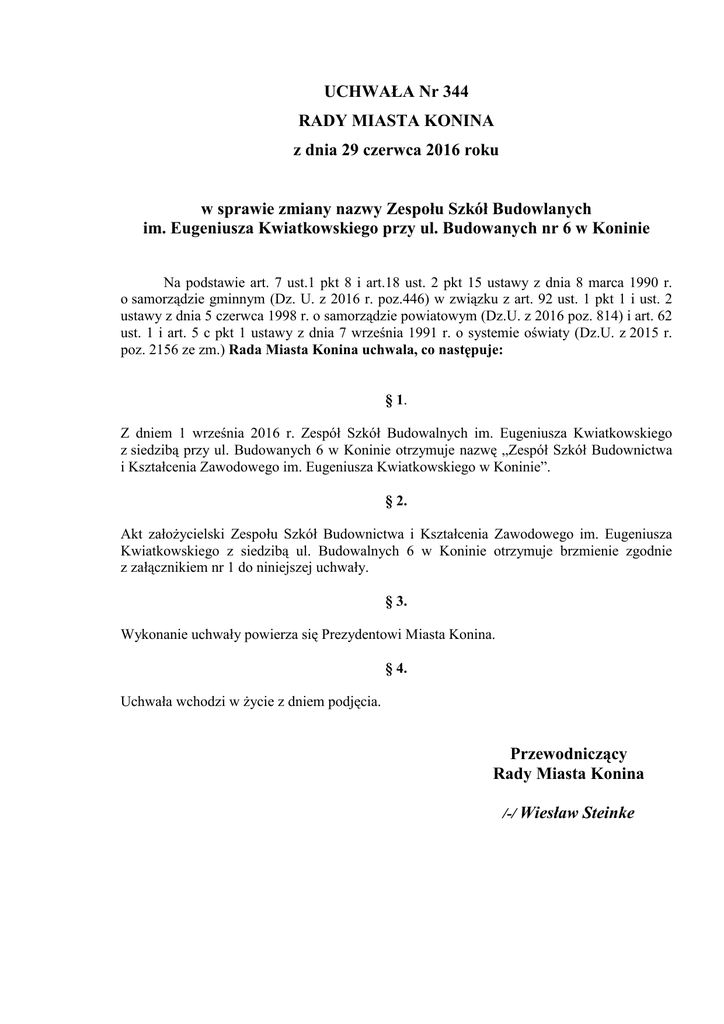 UCHWAŁA Nr 344 RADY MIASTA KONINA z dnia 29 czerwca 2016 roku w sprawie zmiany nazwy Zespołu Szkół Budowlanych im. Eugeniusza Kwiatkowskiego przy ul. Budowanych nr 6 w Koninie Na podstawie art. 7 ust.1 pkt 8 i art.18 ust. 2 pkt 15 ustawy z dnia 8 marca 1990 r. o samorządzie gminnym (Dz. U. z 2016 r. poz.446) w związku z art. 92 ust. 1 pkt 1 i ust. 2 ustawy z dnia 5 czerwca 1998 r. o samorządzie powiatowym (Dz.U. z 2016 poz. 814) i art. 62 ust. 1 i art. 5 c pkt 1 ustawy z dnia 7 września 1991 r. o systemie oświaty (Dz.U. z 2015 r. poz. 2156 ze zm.) Rada Miasta Konina uchwala, co następuje: § 1. Z dniem 1 września 2016 r. Zespół Szkół Budowalnych im. Eugeniusza Kwiatkowskiego z siedzibą przy ul. Budowanych 6 w Koninie otrzymuje nazwę „Zespół Szkół Budownictwa i Kształcenia Zawodowego im. Eugeniusza Kwiatkowskiego w Koninie”. § 2. Akt załoŜycielski Zespołu Szkół Budownictwa i Kształcenia Zawodowego im. Eugeniusza Kwiatkowskiego z siedzibą ul. Budowalnych 6 w Koninie otrzymuje brzmienie zgodnie z załącznikiem nr 1 do niniejszej uchwały. § 3. Wykonanie uchwały powierza się Prezydentowi Miasta Konina. § 4. Uchwała wchodzi w Ŝycie z dniem podjęcia. Przewodniczący Rady Miasta Konina /-/ Wiesław Steinke UZASADNIENIE do Uchwały Nr 344 Rady Miasta Konina z dnia 29 czerwca 2016 roku w sprawie zmiany nazwy Zespołu Szkół Budowlanych im. Eugeniusza Kwiatkowskiego przy ul. Budowanych nr 6 w Koninie Rada Pedagogiczna i dyrektor Zespołu Szkół Budowlanych im. Eugeniusza Kwiatkowskiego w Koninie zwrócili się z wnioskiem o dokonanie zmiany nazwy szkoły na Zespół Szkół Budownictwa i Kształcenia Zawodowego im. Eugeniusza Kwiatkowskiego w Koninie. Szkoła funkcjonuje na terenie miasta Konina od 1963 r. Początkowo prowadzone było kształcenie w zawodach budowlanych i pokrewnych. Stopniowo zgodnie z potrzebami rynku pracy oraz zainteresowaniami uczniów nastąpiło poszerzenie oferty edukacyjnej o zawody niezwiązane z budownictwem: kucharz, mechanik pojazdów samochodowych, stolarz, ślusarz, technik architektury krajobrazu, technik geodeta, technik hotelarstwa, technik logistyk, technik Ŝywienia i usług gastronomicznych. Obecna nazwa szkoły nie oddaje jej pełnego charakteru i sugeruje kształcenie wyłącznie w zawodach budowlanych . Istotnym argumentem dla zmiany nazwy jest fakt, Ŝe szkoła jest ośrodkiem egzaminacyjnym takŜe dla zawodów innych niŜ budowlane. Proponowana przez Radę Pedagogiczną nazwa oddaje właściwy i aktualny profil szkoły oraz uwzględnia róŜnorodność kształcenia. Wobec powyŜszego podjęcie niniejszej uchwały jest zasadne. Zastępca Prezydenta Miasta Konina /-/ Sławomir Lorek