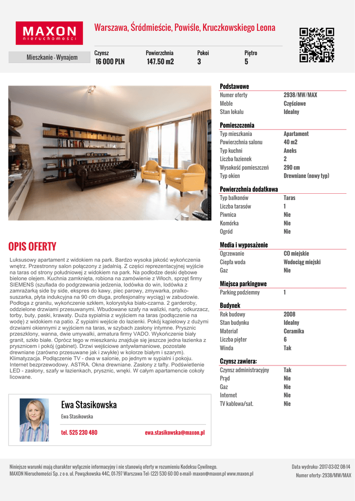 Warszawa, Śródmieście, Powiśle, Kruczkowskiego Leona Mieszkanie - Wynajem Czynsz 16 000 PLN Powierzchnia 147.50 m2 Pokoi Piętro 3 5 Podstawowe Numer oferty 2938/MW/MAX Meble Częściowe Stan lokalu Idealny Pomieszczenia Typ mieszkania Apartament Powierzchnia salonu 40 m2 Typ kuchni Aneks Liczba łazienek 2 Wysokość pomieszczeń 290 cm Typ okien Drewniane (nowy typ) Powierzchnia dodatkowa Typ balkonów Taras Liczba tarasów 1 Piwnica Nie Komórka Nie Ogród Nie OPIS OFERTY Media i wyposażenie Luksusowy apartament z widokiem na park. Bardzo wysoka jakość wykończenia wnętrz. Przestronny salon połączony z jadalnią. Z części reprezentacyjnej wyjście na taras od strony południowej z widokiem na park. Na podłodze deski dębowe bielone olejem. Kuchnia zamknięta, robiona na zamówienie z Włoch, sprzęt firmy SIEMENS (szuflada do podgrzewania jedzenia, lodówka do win, lodówka z zamrażarką side by side, ekspres do kawy, piec parowy, zmywarka, pralkosuszarka, płyta indukcyjna na 90 cm długa, profesjonalny wyciąg) w zabudowie. Podłoga z granitu, wykończenie szkłem, kolorystyka biało-czarna. 2 garderoby, oddzielone drzwiami przesuwanymi. Wbudowane szafy na walizki, narty, odkurzacz, torby, buty, paski, krawaty. Duża sypialnia z wyjściem na taras (podłączenie na wodę) z widokiem na patio. Z sypialni wejście do łazienki. Pokój kąpielowy z dużymi drzwiami okiennymi z wyjściem na taras, w szybach zasłony intymne. Prysznic przeszklony, wanna, dwie umywalki, armatura firmy VADO. Wykończenie biały granit, szkło białe. Oprócz tego w mieszkaniu znajduje się jeszcze jedna łazienka z prysznicem i pokój (gabinet). Drzwi wejściowe antywłamaniowe, pozostałe drewniane (zarówno przesuwane jak i zwykłe) w kolorze białym i szarym). Klimatyzacja. Podłączenie TV - dwa w salonie, po jednym w sypialni i pokoju. Internet bezprzewodowy. ASTRA. Okna drewniane. Zasłony z tafty. Podświetlenie LED - zasłony, szafy w łazienkach, prysznic, wnęki. W całym apartamencie cokoły licowane. Ogrzewanie CO miejskie Ciepła woda Wodociąg miejski Gaz Nie Ewa Stasikowska Miejsca parkingowe Parking podziemny 1 Budynek Rok budowy 2008 Stan budynku Idealny Materiał Ceramika Liczba pięter 6 Winda Tak Czynsz zawiera: Czynsz administracyjny Tak Prąd Nie Gaz Nie Internet Nie TV kablowa/sat. Nie Ewa Stasikowska tel. 525 230 480 [email protected] Niniejsze warunki mają charakter wyłącznie informacyjny i nie stanowią oferty w rozumieniu Kodeksu Cywilnego. MAXON Nieruchomości Sp. z o o. ul. Powązkowska 44C, 01-797 Warszawa Tel: (22) 530 60 00 e-mail: [email protected] www.maxon.pl Data wydruku: 2017-03-02 08:14 Numer oferty: 2938/MW/MAX