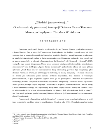Mu z y k a l i a IV · Zeszyt niemiecki 1 „Wiedział jeszcze więcej...” O załamaniu się pierwotnej koncepcji Doktora Fausta Tomasza Manna pod wpływem Theodora W. Adorno Karol Sauerland Powojenna publiczność literacka spodziewała się po Tomaszu Mannie powieści-rozrachunku z losem Niemiec. Gdy w roku 19471 oczekiwane dzieło ukazało się drukiem – mniej więcej od 1945 wiadomo było w kręgach literackich, że Mann pisze powieść o Fauście – na ogół panowało przekonanie, że należy je interpretować właśnie w duchu rozrachunkowym. Ostatecznie można się było powoływać na samego autora, który w odczycie „Deutschland und die Deutschen” („O Niemczech i Niemcach”, 1945) wystąpił z tego rodzaju interpretacją. Mowa tam o „tajemnej więzi psychiki niemieckiej z pierwiastkiem demonicznym”2 oraz diable jako „figurze bardzo niemieckiej”3; pada również zdanie tak często później cytowane: „Jeżeli Faust ma być reprezentantem duszy niemieckiej, powinien być muzykalny; gdyż stosunek Niemca do świata jest abstrakcyjny i mistyczny, to znaczy muzykalny – Niemiec odnosi się do świata jak natchniony przez demona profesor: nieporadnie, lecz zarazem z wzniosłym przeświadczeniem, że pod względem >głębić< świat go nie prześcignie”4. Wszystkie te wypowiedzi interpretują powieść, którą autor miał ukończyć dopiero dwa lata później. Oczywiście trafiają się również zdania tylko do pewnego stopnia dotyczące Leverkühna, na przykład: „Samotny myśliciel i badacz, teolog i filozof zamknięty w swojej celi, zaprzedający duszę diabłu z żądzy użycia i władzy nad światem – czyż to właściwa chwila, by w tym wizerunku objawiły się Niemcy, dziś, gdy dosłownie diabli je biorą?” 5. Ale i to zdanie podsuwa sposób interpretacji Doktora Faustusa, jeśli zaakcentować w nim samotność, diabła i los niemiecki. Przemówienie „Deutschland und die Deutschen” cytowane bywa w analizach Faustusa w myśl tego, co napisał o nim Hans Mayer w swej książce o Mannie z roku 1950: „Wypada je uznać za istotną 1 W 1946 r. ukazały się w Rundschau zapowiedzi książki (zob. Thomas Mann, Tagebücher 1944-1946, Frankfurt am Main 1986, notatka z 28. 09. 1946, s. 297). 2 Thomas Mann, Gesammelte Werke, Berlin 1956, t. XII, s.558. 3 Ibidem, s. 559. 4 Ibidem. 5 Ibidem. 1 Mu z y k a l i a IV · Zeszyt niemiecki 1 pomoc w deszyfracji powieści”6. Dopiero ostatnio zaznacza się tendencja, by pośrednie i bezpośrednie komentarze odautorskie oceniać bardziej krytycznie.7 Można by także cytować listy, w których Mann wspomina o pracy nad powieścią poświęconą losowi Niemiec. Na przykład w liście do Karola Kere’nyiego z dnia 3 grudnia 1945 roku stwierdza, że Faustus to zasadniczo powieść o Nietschem, w której jednak „chodzi istotnie o charakter i los niemiecki”8. Paradoksalna może wydać się reakcja Manna po ukazaniu się powieści. Jak donosi Eryce w liście z 6 listopada 1947 roku, irytowało go to, że „wszyscy tak nieznośnie akcentują n-i-e-m-i-e-c-k-ą alegorię. Sam temu jestem winien. Zdaję sobie z tego sprawę”9. Od początku pracy nad Doktorem Faustusem towarzyszy pisarzowi idea, że przekroczenie granic mieszczańskości (czy też humanizmu) w patologicznym upojeniu zawsze grozi triumfem sił faszystowskich. Wynika to bardzo wyraźnie z pierwszej notatki do Doktora Faustusa, sporządzonej w roku 1943: „Chodzi o chęć wyrwania się z tego, co mieszczańskie, umiarkowane, klasyczne, apolińskie, trzeźwe, pilne i wierne – i o tęsknotę za upojnym rozluźnieniem, za tym, co śmiałe, dionizyjskie, genialne, nadmieszczańskie, a nawet nadludzkie – przede wszystkim w odczuciu subiektywnym, jako przeżycie i nieprzytomne spotęgowanie samego siebie, bez względu na to, czy otoczenie zdolne jest w tym współuczestniczyć. Tak daleko idą – lub udają, że idą – tylko nieliczni miłośnicy i wyznawcy absolutnego ducha tudzież samotnej, anarchicznej jaźni (sprzeczność z tendencją kultową). Symbol przezwyciężenia mieszczańskości i wyzwolenia się z jego więzów sposobem demoniczno-patologicznym, poprzez zatrucie płci i egzaltację mózgową, prowadzącą do zidiocenia. Spotęgowanie, którego przyczyną jest rozkład. Najwyższe natężenie pozornej siły, subiektywnie łączone z triumfalnym poczuciem boskości, wywołane intoksykacją, która prowadzi do duchowej śmierci. Z początku – utalentowana normalność, dźwigająca swą konstytucję i dzieło do sfer lodowato–genialnych, samotnych – pośród cierpień, znoszonych mniej więcej taj, jak Syrenka znosiła ból w swoich ludzkich nóżkach. Cierpienie traktowane jako bóle rodzenia Nowego, nowej epoki w rozwoju. Stąd najgłębsza nostalgia za utraconym >krajem rodzinnym<. Rozsadzanie mieszczańskości metodą patologiczno–infekcyjną, dezintegrującą – jednocześnie destrukcja polityczna. Faszyzm intelektualno–psychiczny: odrzucenie humanizmu, chwytanie się przemocy, krwiożerczość, irracjonalizm, okrucieństwo, dionizyjskie odstępstwo od prawdy i prawa, oddanie się instynktowi i rozwiązłemu >życiu<, które w rzeczywistości jest śmiercią, zaś jako życie – sztuczką diabelską zrodzoną z trucizny. Faszyzm jako wskazane przez diabła wyjście poza mieszczańską formę życia, które poprzez przygodę upojonego potęgowania siebie aż po nad-wielkość doprowadza do zapaści mózgowej i śmierci ducha, a rychło i do śmierci cielesnej – trzeba uregulować rachunek”10. 6 Hans Mayer, Thomas Mann. Werk und Entwicklung, Berlin 1950, s. 335. Por. Herbert H. Lehnert, Hundert Jahre Thomas Mann I, w: Orbis Litterarum 2/1977 i Hansjörg Dörr, Thomas Mann und Adorno. Ein Beitrag zur Entsehung des „Doktor Faustus“, w: Literarwissenschaftliches Jahrbuch, im Auftrag der Görregesellschaft, red. H. Kunisch, 1970, s. 289. 8 Thomas Mann, Listy 1937-47, przeł. Wanda Jedlicka, Teresa Jętkiewicz, Wars