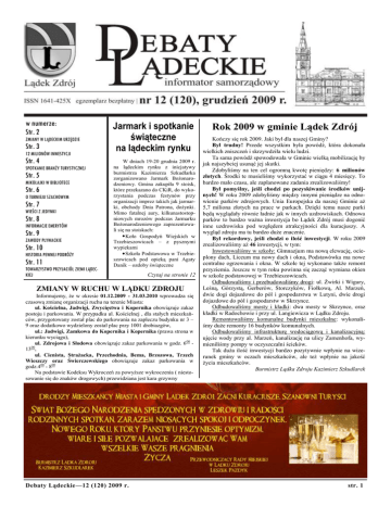 w numerze: Str. 2 ZMIANY W LĄDECKIM URZĘDZIE Str. 3 12 MILIONÓW INWESTYCJI Str. 4 SPOTKANIE BRANŻY TURYSTYCZNEJ Str. 5 MIKOŁAJKI W BIBLIOTECE Str. 6 O TURNIEJU SZACHOWYM Str. 7 WIEŚCI Z JEDYNKI Str. 8 INFORMACJE EMERYTÓW Str. 9 ZAWODY PŁYWACKIE Str. 10 HISTORIA PEWNEJ PODRÓŻY Str. 11 TOWARZYSTWO PRZYJACIÓŁ ZIEMI LĄDECKIEJ Jarmark i spotkanie świąteczne na lądeckim rynku W dniach 19-20 grudnia 2009 r. na lądeckim rynku z inicjatywy burmistrza Kazimierza Szkudlarka zorganizowano Jarmark Bożonarodzeniowy. Gmina zakupiła 9 stoisk, które przekazano do CKiR, do wykorzystania podczas festynów przy organizacji imprez takich jak jarmarki, obchody Dnia Patrona, dożynki. Mimo fatalnej aury, kilkunastostopniowych mrozów podczas Jarmarku Bożonarodzeniowego zaprezentowali się na stoiskach: Koło Gospodyń Wiejskich w Trzebieszowicach – z pysznymi wypiekami Szkoła Podstawowa w Trzebieszowicach pod opieką pani Agaty Danik – ozdoby świąteczne Czytaj na stronie 12 ZMIANY W RUCHU W LĄDKU ZDROJU Informujemy, że w okresie 01.12.2009 - 31.03.2010 wprowadza się czasową zmianę organizacji ruchu na terenie Miasta: ul. Kościelna, Jadwigi, Zwycięstwa i Kopernika obowiązuje zakaz postoju i parkowania. W przypadku ul. Kościelnej , dla stałych mieszkańców, przygotowany został plac do parkowania na zapleczu budynku nr 3 – 9 oraz dodatkowo wydzielony został plac przy 1001 drobiazgów, ul.: Jadwigi, Zamkowa do Kopernika i Kopernika (prawa strona w kierunku wyciągu), ul. Zdrojowa i Słodowa obowiązuje zakaz parkowania w godz. 600 1300, ul. Cienista, Strażacka, Przechodnia, Bema, Brzozowa, Trzech Wieszczy oraz Świerczewskiego obowiązuje zakaz parkowania w godz.400 - 800 Na podstawie Kodeksu Wykroczeń za powyższe wykroczenia ( niestosowanie się do znaków drogowych) przewidziana jest kara grzywny Debaty Lądeckie—12 (120) 2009 r. Rok 2009 w gminie Lądek Zdrój Kończy się rok 2009. Jaki był dla naszej Gminy? Był trudny! Przede wszystkim była powódź, która dokonała wielkich zniszczeń i skrzywdziła wielu ludzi. Ta sama powódź spowodowała w Gminie wielką mobilizację by jak najszybciej usunąć jej skutki. Zdobyliśmy na ten cel ogromną kwotę pieniędzy: 6 milionów złotych. Środki te musieliśmy wykorzystać w ciągu 4 miesięcy. To bardzo mało czasu, ale zaplanowane zadania zrealizowaliśmy! Był pomyślny, jeśli chodzi po pozyskiwanie środków unijnych! W roku 2009 zdobyliśmy między innymi pieniądze na odnowienie parków zdrojowych. Unia Europejska da naszej Gminie aż 5,7 miliona złotych na prace w parkach. Dzięki temu nasze parki będą wyglądały równie ładnie jak w innych uzdrowiskach. Odnowa parków to bardzo ważna inwestycja bo Lądek Zdrój musi dogonić inne uzdrowiska pod względem atrakcyjności dla kuracjuszy. A wygląd zdroju ma tu bardzo duże znacznie. Był rekordowy, jeśli chodzi o ilość inwestycji. W roku 2009 zrealizowaliśmy aż 46 inwestycji, w tym: Inwestowaliśmy w szkoły: Gimnazjum ma nową elewację, ocieplony dach, Liceum ma nowy dach i okna, Podstawówka ma nowe centralne ogrzewania i okna. W szkole tej wykonano także remont przyziemia. Jeszcze w tym roku powinna się zacząć wymiana okien w szkole podstawowej w Trzebieszowicach. Odbudowaliśmy i przebudowaliśmy drogi: ul. Żwirki i Wigury, Leśną, Górzystą, Gerberów, Storczyków, Fiołkową, Al. Marzeń, dwie dogi dojazdowe do pól i gospodarstwa w Lutyni, dwie drogi dojazdowe do pól i gospodarstw w Skrzynce. Odbudowaliśmy mosty i kładki: dwa mosty w Skrzynce, oraz kładki w Radochowie i przy ul. Langiewicza w Lądku Zdroju. Remontowaliśmy komunalne budynki mieszkalne: wykonaliśmy duże remonty 16 budynków komunalnych. Odbudowaliśmy infrastrukturę wodociągową i kanalizacyjną: ujęcie wody przy al. Marzeń, kanalizację na ulicy Zamenhofa, wymieniliśmy pompy w oczyszczalni ścieków. Tak duża ilość inwestycji bardzo pozytywnie wpłynie na wizerunek gminy w oczach mieszkańców, ale też wpłynie na jakość życia mieszkańców. Burmistrz Lądka Zdroju Kazimierz Szkudlarek str. 1 D informator samorządowy Debaty Lą deckie biuletyn informacyjny Miasta i Gminy Lą dek-Zdrój redaguje: M. Bednarek, T. Pawlęga, skład: T. Pawlęga druk: A. Rodak, Ł. Pokropek, nakład: 1500 egzemplarzy adres redakcji: Lą dek-Zdrój, pl. Staromły ński 5, tel. 074 814 65 62, e-mail : [email protected] BURMISTRZ DZIĘKUJE ZA WYROZUMIAŁOŚĆ Zmiany w Urzędzie Miasta i Gminy Z dniem 30 listopada zakończył pracę w UMiG pan Zbigniew Strzelecki. Przepracował w Urzę-dzie Miasta i Gminy w Lądku Zdroju ponad 26 lat. Na umowę o pracę zatrudniony został w stycz-niu 1985 roku i pracował aż do 30 listopada 2009 r. W okresie zatrudnienia pracował na następują-cych stanowiskach: 1. Inspektora ds. obrony cywilnej, 2. Inspektora ds. obronnych, nadzoru p.poż., spraw wojskowych i obrony cywilnej, 3. Inspektora ds. obronnych, OC i p.poż., 4. Inspekto- Pragnę serdecznie mieszkańcom miasta i gminy Lądek Zdrój, a także kuracjuszom i turystom za wyrozumiałość w związku z licznymi utrudnieniami jakie miały miejsce na terenie naszej Gminy. Utrudnienia te spowodowane były realizacją kilkudziesięciu zadań związanych z usuwaniem skutków czerwcowej klęski żywiołowej. Przeprowadzone inwestycje pozwoliły nie tylko na odbudowę zniszczonego mienia, ale także niejednokrotnie pozwolą na podniesienie jakości życia mieszkańców. Burmistrz Lądka Zdroju Kazimierz Szkudlarek ra ds. zarządzania kryzysowego, a od lutego 2004 r. do końca listopada 2009 r. na stanowisku Kierownika Referatu Zarządzania Kryzysowego i Spraw Obronnych. Przed zatrudnieniem w UMiG w Lądku Zdroju pracował na umowę zlecenie jako Komendant Oddziału Obrony Cywilnej Miasta i Gminy Lądek Zdrój. Od 1991 roku Pan Zbigniew Strzelecki jest w zarządzie Oddziału MiejskoG m i n n e go Z wi ą s z ku Ochotniczych Straży Pożarnych w Lądku Zdroju a od 2006 roku pełni funkcję