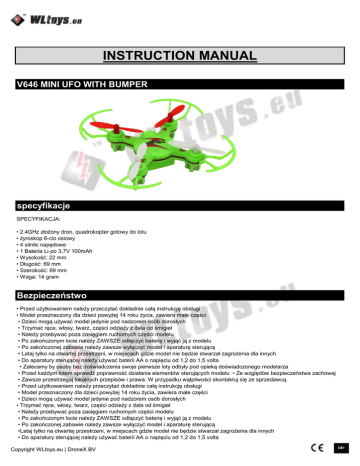 INSTRUCTION MANUAL V646 MINI UFO WITH BUMPER specyfikacje SPECYFIKACJA: • 2.4GHz złożony dron, quadrokopter gotowy do lotu • żyroskop 6-cio osiowy • 4 silniki napędowe • 1 Bateria Li-po 3,7V 100mAh • Wysokość: 22 mm • Długość: 69 mm • Szerokość: 69 mm • Waga: 14 gram Bezpieczeństwo • Przed użytkowaniem należy przeczytać dokładnie całą instrukcję obsługi • Model przeznaczony dla dzieci powyżej 14 roku życia, zawiera małe części • Dzieci mogą używać model jedynie pod nadzorem osób dorosłych • Trzymać ręce, włosy, twarz, części odzieży z dala od śmigieł • Należy przebywać poza zasięgiem ruchomych części modelu • Po zakończonym locie należy ZAWSZE odłączyć baterię i wyjąć ją z modelu • Po zakończonej zabawie należy zawsze wyłączyć model i aparaturę sterującą • Lataj tylko na otwartej przestrzeni, w miejscach gdzie model nie będzie stwarzał zagrożenia dla innych • Do aparatury sterującej należy używać baterii AA o napięciu od 1,2 do 1,5 volta • Zalecamy by osoby bez doświadczenia swoje pierwsze loty odbyły pod opieką doświadczonego modelarza • Przed każdym lotem sprawdź poprawność działania elementów sterujących modelu • Ze względów bezpieczeństwa zachowaj • Zawsze przestrzegaj lokalnych przepisów i prawa. W przypadku wątpliwości skontaktuj się ze sprzedawcą. • Przed użytkowaniem należy przeczytać dokładnie całą instrukcję obsługi • Model przeznaczony dla dzieci powyżej 14 roku życia, zawiera małe części • Dzieci mogą używać model jedynie pod nadzorem osób dorosłych • Trzymać ręce, włosy, twarz, części odzieży z dala od śmigieł • Należy przebywać poza zasięgiem ruchomych części modelu • Po zakończonym locie należy ZAWSZE odłączyć baterię i wyjąć ją z modelu • Po zakończonej zabawie należy zawsze wyłączyć model i aparaturę sterującą •Lataj tylko na otwartej przestrzeni, w miejscach gdzie model nie będzie stwarzał zagrożenia dla innych • Do aparatury sterującej należy używać baterii AA o napięciu od 1,2 do 1,5 volta Copyright WLtoys.eu | DroneX BV • Zalecamy by osoby bez doświadczenia swoje pierwsze loty odbyły pod opieką doświadczonego modelarza • Przed każdym lotem sprawdź poprawność działania elementów sterujących modelu • Ze względów bezpieczeństwa zachowaj • Zawsze przestrzegaj lokalnych przepisów i prawa. W przypadku wątpliwości skontaktuj się ze sprzedawcą. • Przed użytkowaniem należy przeczytać dokładnie całą instrukcję obsługi • Model przeznaczony dla dzieci powyżej 14 roku życia, zawiera małe części • Dzieci mogą używać model jedynie pod nadzorem osób dorosłych • Trzymać ręce, włosy, twarz, części odzieży z dala od śmigieł • Należy przebywać poza zasięgiem ruchomych części modelu • Po • Po zakończonej zabawie należy zawsze wyłączyć model i aparaturę sterującą •Lataj tylko na otwartej przestrzeni, w miejscach • Do aparatury sterującej należy używać baterii AA o napięciu od 1,2 do 1,5 volta • Zalecamy by osoby bez doświadczenia swoje pierwsze loty odbyły pod opieką doświadczonego modelarza • Przed każdym lotem sprawdź poprawność działania elementów sterujących modelu • Ze względów bezpieczeństwa zachowaj • Zawsze przestrzegaj lokalnych przepisów i prawa. W przypadku wątpliwości skontaktuj się ze sprzedawcą. NIE WOLNO LATAĆ: - obok ludzi lub zwierząt - ponad dużymi grupami ludzi - przy ograniczonej widoczności lub po zmroku - przy wietrze przekraczającym 2 stopnie Beauforta - przy liniach wysokiego napięcia i innych liniach kablowych - podczas burz i opadów deszczu, przy dużej wilgotności. Model nie jest wodoodporny. Porady ponownie baterii Mając na uwadze obowiązujące przepisy, odpowiedzialne i racjonalne zachowanie, ochronę i poprawę jakości środowiska naturalnego, ochronę zdrowia ludzkiego oraz ochronę zasobów naturalnych, zużyty lub zniszczony produkt należy przekazać do odpowiedniej jednostki zajmującej się selektywną zbiórką odpadów. Symbol przekreślonego kontenera oznacza, że produkt należy poddać recyklingowi. UWAGA!!! Produktu nie należy wyrzucać do pojemników przeznaczonych na odpady komunalne. Mając na uwadze obowiązujące przepisy, odpowiedzialne i racjonalne zachowanie, ochronę i poprawę jakości środowiska naturalnego, ochronę zdrowia ludzkiego oraz ochronę zasobów naturalnych, zużyty lub zniszczony produkt należy przekazać do odpowiedniej jednostki zajmującej się selektywną zbiórką odpadów. Symbol przekreślonego kontenera oznacza, że produkt należy poddać recyklingowi. UWAGA!!! Produktu nie należy wyrzucać do pojemników przeznaczonych na odpady komunalne.. Użytkownik jest odpowiedzialny za utylizację zużytych baterii i akumulatorów. Zabronione jest wyrzucanie ich do pojemników z odpadami komunalnymi. Baterie/akumulatory zawierające substancje niebezpieczne dla środowiska są oznaczone symbolem przekreślonego kosza na śmieci. Należy je poddać recyklingowi. Ogniwa mogą zawierać niebezpieczne substancje chemiczne takie jak kadm (Cd), rtęć (Hg) czy ołów (Pb). Zużyte ogniwa należy przekazać do punktu selektywnej zbiórki odpadów. Użytkownik jest prawnie zobowiązany do odpowiedniego postępowania z odpadami i działań zapewniających bezpieczeństwo środowiska naturalnego. ładowanie akumulatora Copyright WLtoys.eu | DroneX BV Podłącz kabel USB do gniazda a następnie podłącz helikopter do ładowarki. Baterię z przewodem ładowania można podłączyć tylko w jeden sposób. Czerwony LED włączony = bateria naładowana Czerwony LED wyłączony = ładowanie baterii Controller 1.Kontrolka zasilania 2.Ogranicznik prędkości 3.Przepustnica 4.Włącznik 5.Obrót 6.Drążek kierunku (pochylenie/przechylenie) 7.Trymer przód/tył 8.Trymer lewo/prawo Śrubokrętem wykręć wkręt (1) m