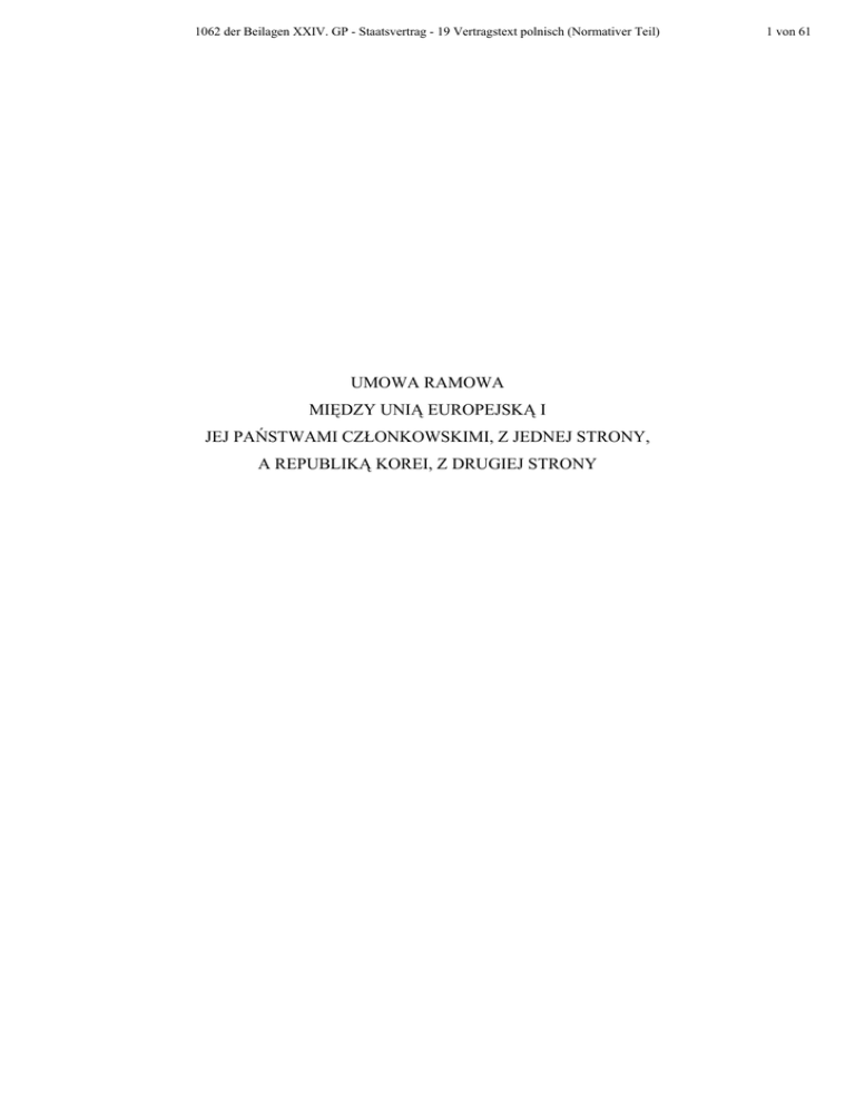 1062 der Beilagen XXIV. GP - Staatsvertrag - 19 Vertragstext polnisch (Normativer Teil) UMOWA RAMOWA MIĘDZY UNIĄ EUROPEJSKĄ I JEJ PAŃSTWAMI CZŁONKOWSKIMI, Z JEDNEJ STRONY, A REPUBLIKĄ KOREI, Z DRUGIEJ STRONY 1 von 61 2 von 61 1062 der Beilagen XXIV. GP - Staatsvertrag - 19 Vertragstext polnisch (Normativer Teil) UNIA EUROPEJSKA, zwana dalej „Unią”, oraz KRÓLESTWO BELGII, REPUBLIKA BUŁGARII, REPUBLIKA CZESKA, KRÓLESTWO DANII, REPUBLIKA FEDERALNA NIEMIEC, REPUBLIKA ESTOŃSKA, IRLANDIA, REPUBLIKA GRECKA, KRÓLESTWO HISZPANII, REPUBLIKA FRANCUSKA, REPUBLIKA WŁOSKA, REPUBLIKA CYPRYJSKA, 1062 der Beilagen XXIV. GP - Staatsvertrag - 19 Vertragstext polnisch (Normativer Teil) REPUBLIKA ŁOTEWSKA, REPUBLIKA LITEWSKA, WIELKIE KSIĘSTWO LUKSEMBURGA, REPUBLIKA WĘGIERSKA, MALTA, KRÓLESTWO NIDERLANDÓW, REPUBLIKA AUSTRII, RZECZPOSPOLITA POLSKA, REPUBLIKA PORTUGALSKA, RUMUNIA, REPUBLIKA SŁOWENII, REPUBLIKA SŁOWACKA, REPUBLIKA FINLANDII, KRÓLESTWO SZWECJI, ZJEDNOCZONE KRÓLESTWO WIELKIEJ BRYTANII I IRLANDII PÓŁNOCNEJ, 3 von 61 4 von 61 1062 der Beilagen XXIV. GP - Staatsvertrag - 19 Vertragstext polnisch (Normativer Teil) Umawiające się Strony Traktatu o Unii Europejskiej oraz Traktatu o funkcjonowaniu Unii Europejskiej, zwane dalej „państwami członkowskimi”, z jednej strony, oraz REPUBLIKA KOREI, z drugiej strony, zwane dalej wspólnie „Stronami”, ZWAŻYWSZY na tradycyjną przyjaźń oraz łączące je więzi historyczne, polityczne i gospodarcze, PRZYPOMINAJĄC Umowę ramową o handlu i współpracy między Wspólnotą Europejską i jej państwami członkowskimi, z jednej strony, a Republiką Korei, z drugiej strony, która została podpisana w Luksemburgu w dniu 28 października 1996 r. i która weszła w życie w dniu 1 kwietnia 2001r., MAJĄC NA UWADZE przyspieszony proces nabywania przez Unię Europejską własnej tożsamości w polityce zagranicznej oraz w dziedzinie bezpieczeństwa i sprawiedliwości, MAJĄC ŚWIADOMOŚĆ wzrastającej roli i odpowiedzialności, jakie przyjmuje na siebie Republika Korei we wspólnocie międzynarodowej, 1062 der Beilagen XXIV. GP - Staatsvertrag - 19 Vertragstext polnisch (Normativer Teil) 5 von 61 PODKREŚLAJĄC wszechstronny charakter swoich stosunków i znaczenie ciągłych wysiłków na rzecz utrzymania ogólnej spójności, POTWIERDZAJĄC dążenie do utrzymania i rozwijania regularnego dialogu politycznego, który opiera się na wspólnych wartościach i aspiracjach, WYRAŻAJĄC wspólną chęć do przeniesienia stosunków na poziom wzmocnionego partnerstwa, m.in. w kwestiach politycznych, gospodarczych, społecznych i kulturalnych, DĄŻĄC w tym zakresie do umocnienia, pogłębienia i zróżnicowania stosunków w dziedzinach będących przedmiotem wspólnego zainteresowania na szczeblu dwustronnym, regionalnym i globalnym oraz na podstawie zasad równości, poszanowania suwerenności, niedyskryminacji oraz obopólnej korzyści, POTWIERDZAJĄC silne przywiązanie Stron do zasad demokracji i praw człowieka, ustanowionych w Powszechnej deklaracji praw człowieka i innych istotnych międzynarodowych aktach prawnych dotyczących praw człowieka, jak również zasad praworządności i dobrych rządów, POTWIERDZAJĄC swoją determinację w zwalczaniu poważnej przestępczości, która wzbudza niepokój międzynarodowy, oraz przekonanie, że należy zapewnić skuteczne ściganie szczególnie poważnej przestępczości, która wzbudza niepokój międzynarodowy, przez podjęcie środków na poziomie krajowym i przez zacieśnienie współpracy międzynarodowej, 6 von 61 1062 der Beilagen XXIV. GP - Staatsvertrag - 19 Vertragstext polnisch (Normativer Teil) UZNAJĄC terroryzm za zagrożenie dla bezpieczeństwa globalnego i pragnąc zintensyfikować dialog i współpracę w zakresie walki z terroryzmem, zgodnie z odpowiednimi międzynarodowymi instrumentami, w szczególności rezolucją Rady Bezpieczeństwa ONZ nr 1373, a także potwierdzając, że poszanowanie praw człowieka i zasad praworządności stanowi podstawowy warunek walki z terroryzmem, PODZIELAJĄC pogląd, że rozprzestrzenianie broni masowego rażenia i środków jej przenoszenia stwarza poważne zagrożenie dla bezpieczeństwa międzynarodowego, uznając zaangażowanie społeczności międzynarodowej w walkę z rozprzestrzenianiem tej broni, czego odzwierciedleniem jest przyjęcie odpowiednich konwencji międzynarodowych oraz rezolucji Rady Bezpieczeństwa ONZ, w szczególności rezolucji nr 1540, a także pragnąc wzmocnić dialog i współpracę w tej dziedzinie; UZNAJĄC potrzebę zacieśnienia współpracy w dziedzinie sprawiedliwości, wolności i bezpieczeństwa, PRZYPOMINAJĄC w tym względzie, że postanowienia niniejszej umowy, które wchodzą w zakres części III tytuł V Traktatu o funkcjonowaniu Unii Europejskiej, są wiążące dla Zjednoczonego Królestwa i Irlandii jako oddzielnych Umawiających się Stron, a nie jako części Unii Europejskiej, dopóki Unia Europejska nie powiadomi Republiki Korei, że którekolwiek z tych państw zostało objęte tymi postanowieniami jako część Unii Europejskiej, zgodnie z Protokołem w sprawie stanowiska Zjednoczonego Królestwa i Irlandii, załączonym do Traktatu o Unii Europejskiej i Traktatu o funkcjonowaniu Unii Europejskiej; to samo ma zastosowanie do Danii, zgodnie z odpowiednim Protokołem załączonym do tych traktatów, 1062 der Beilagen XXIV. GP - Staatsvertrag - 19 Vertragstext polnisch (Normativer Teil) 7 von 61 UZNAJĄC swoje dążenie do wspierania zrównoważonego rozwoju w aspekcie gospodarczym, społecznym i środowiskowym, WYRAŻAJĄC swoje zaangażowanie w zapewnienie wysokiego poziomu ochrony środowiska i determinację w dążeniu do współpracy na rzecz przeciwdziałania zmianie klimatu, PRZYPOMINAJĄC o swoim poparciu dla idei sprawiedliwej globalizacji oraz realizacji celów pełnego i wydajnego zatrudnienia oraz godnej pracy dla wszystkich, UZNAJĄC fakt, że dobrze rozwija się przep