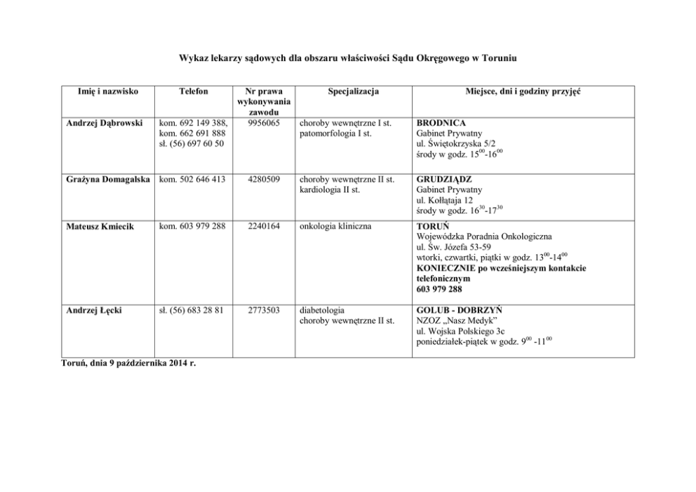 Wykaz lekarzy sądowych dla obszaru właściwości Sądu Okręgowego w Toruniu Imię i nazwisko Andrzej Dąbrowski Telefon kom. 692 149 388, kom. 662 691 888 sł. (56) 697 60 50 Nr prawa Specjalizacja wykonywania zawodu 9956065 choroby wewnętrzne I st. patomorfologia I st. Miejsce, dni i godziny przyjęć BRODNICA Gabinet Prywatny ul. Świętokrzyska 5/2 środy w godz. 1500-1600 Grażyna Domagalska kom. 502 646 413 4280509 choroby wewnętrzne II st. kardiologia II st. GRUDZIĄDZ Gabinet Prywatny ul. Kołłątaja 12 środy w godz. 1630-1730 Mateusz Kmiecik kom. 603 979 288 2240164 onkologia kliniczna TORUŃ Wojewódzka Poradnia Onkologiczna ul. Św. Józefa 53-59 wtorki, czwartki, piątki w godz. 1300-1400 KONIECZNIE po wcześniejszym kontakcie telefonicznym 603 979 288 Andrzej Łęcki sł. (56) 683 28 81 2773503 diabetologia choroby wewnętrzne II st. GOLUB - DOBRZYŃ NZOZ „Nasz Medyk” ul. Wojska Polskiego 3c poniedziałek-piątek w godz. 900 -1100 Toruń, dnia 9 października 2014 r.
