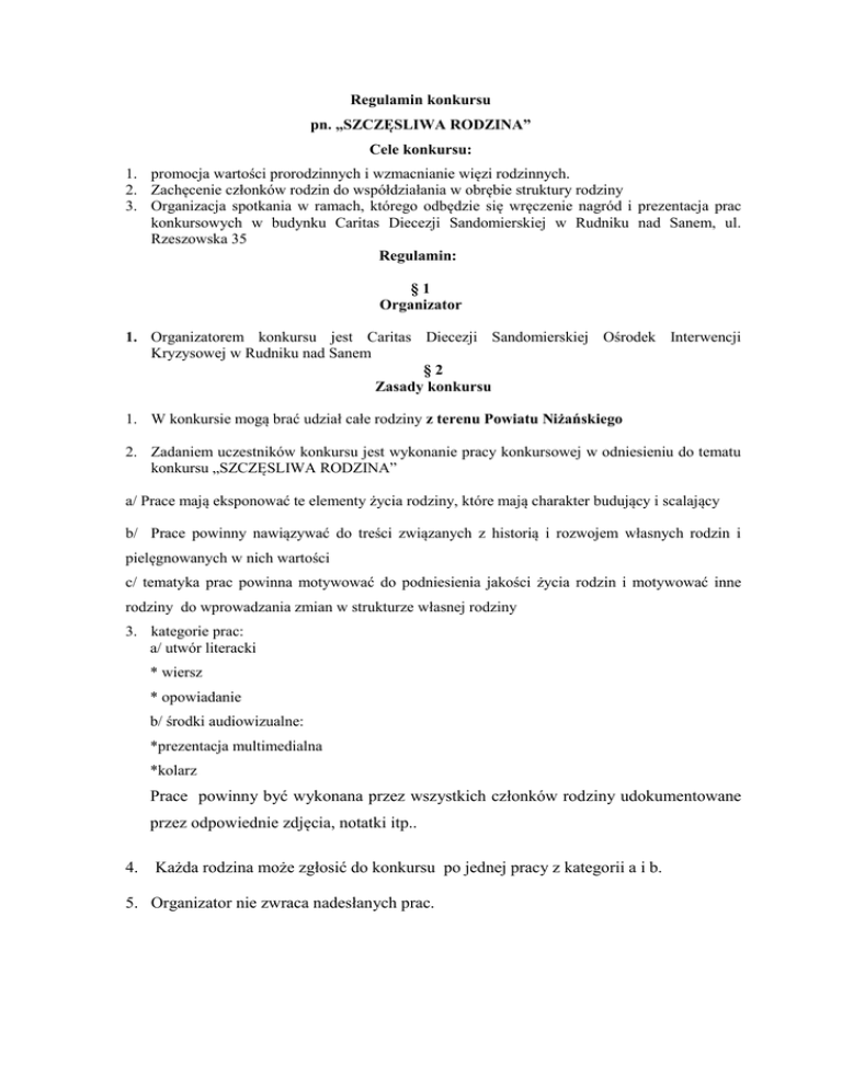 Regulamin konkursu pn. „SZCZĘSLIWA RODZINA” Cele konkursu: 1. promocja wartości prorodzinnych i wzmacnianie więzi rodzinnych. 2. Zachęcenie członków rodzin do współdziałania w obrębie struktury rodziny 3. Organizacja spotkania w ramach, którego odbędzie się wręczenie nagród i prezentacja prac konkursowych w budynku Caritas Diecezji Sandomierskiej w Rudniku nad Sanem, ul. Rzeszowska 35 Regulamin: §1 Organizator 1. Organizatorem konkursu jest Caritas Diecezji Sandomierskiej Ośrodek Interwencji Kryzysowej w Rudniku nad Sanem §2 Zasady konkursu 1. W konkursie mogą brać udział całe rodziny z terenu Powiatu Niżańskiego 2. Zadaniem uczestników konkursu jest wykonanie pracy konkursowej w odniesieniu do tematu konkursu „SZCZĘSLIWA RODZINA” a/ Prace mają eksponować te elementy życia rodziny, które mają charakter budujący i scalający b/ Prace powinny nawiązywać do treści związanych z historią i rozwojem własnych rodzin i pielęgnowanych w nich wartości c/ tematyka prac powinna motywować do podniesienia jakości życia rodzin i motywować inne rodziny do wprowadzania zmian w strukturze własnej rodziny 3. kategorie prac: a/ utwór literacki * wiersz * opowiadanie b/ środki audiowizualne: *prezentacja multimedialna *kolarz Prace powinny być wykonana przez wszystkich członków rodziny udokumentowane przez odpowiednie zdjęcia, notatki itp.. 4. Każda rodzina może zgłosić do konkursu po jednej pracy z kategorii a i b. 5. Organizator nie zwraca nadesłanych prac. 6. Warunkiem uczestnictwa w konkursie jest udzielenie zgodny na upublicznienie danych uczestników w postaci imion, nazwisk, wieku, wizerunku i wypełnienie formularza zgłoszeniowego (w załączniku). 7. Regulamin wraz z formularzem zgłoszeniowym zamieszczony jest na stronie internetowej organizatora. www.sandomierz.caritas.pl §3 Terminy 1. Prace konkursowe należy przesłać do 15 listopada br. (decyduje data wpływu) z dopiskiem na kopercie: konkurs pn. „Szczęśliwa rodzina” 2. prace, wraz z formularzem zgłoszeniowym należy przesłać (na koszt nadsyłającego) na adres: Caritas Diecezji Sandomierskiej, Ośrodek Interwencji Kryzysowej, ul. Rzeszowska 35; 37-420 Rudnik nad Sanem lub złożyć osobiście w biurze Ośrodka. 3. Wyniki konkursu zostaną ogłoszone na stronie internetowej Caritas Diecezji Sandomierskiej do 30 listopada 2015 r. i przekazane do mediów. §4 Ocena prac i zasady przyznawania nagród 1. Nadesłane prace zostaną ocenione przez komisję w składzie wyznaczonym przez kierownika Ośrodka Interwencji Kryzysowej w Rudniku nad Sanem 2. Zwycięzcy konkursu otrzymają nagrody rzeczowe i pamiątkowe dyplomy, 3. Organizator zastrzega sobie prawo do przyznania wyróżnień. 4. Autorzy nagrodzonych prac zostaną poinformowani o wynikach konkursu i zaproszeni na uroczyste wręczenie nagród 5. Rozdanie nagród nastąpi 30 LISTOPADA o godz. 10:00 w budynku Caritas Diecezji Sandomierskiej , ul. Rzeszowska 35, Rudnik nad Sanem. §5 Postanowienia końcowe 1. Udział w konkursie jest jednoznaczny z akceptacją niniejszego regulaminu oraz zgodą na publikację prac konkursowych, w tym wizerunku fotografowanych osób. 2. Organizator zastrzega sobie prawo do reprodukowania prac konkursowych na stronie internetowej Caritas Diecezji Sandomierskiej, w mediach, na organizowanych wystawach. 3. Wszelkich informacji na temat konkursu udziela Ośrodek Interwencji Kryzysowej w Rudniku nad Sanem: tel. 15 649-21-86; e-mail: [email protected] Program „Więzi rodzinne” współfinansowany ze środków Regionalnego Ośrodka Polityki Społecznej w Rzeszowie ZGŁOSZENIE PRACY NA KONKURS pn. „Szczęśliwa rodzina” zgłaszam prace na konkurs pn.„Szczęśliwa rodzina” Dane osobowe Imiona i nazwisko; wiek uczestników Telefon kontaktowy; email Adres (ulica kod miejscowość) Dane dotyczące pracy kategoria tytuł/temat pracy Wyrażam zgodę na upublicznienie danych uczestnika konkursu w postaci imienia i nazwiska, wieku, wizerunku. Przekazując prace na konkurs, nieodpłatnie przenoszę na organizatora wszelkie prawa autorskie do nich (w zakresie publikacji prac na stronie internetowej organizatora, w mediach oraz organizowanych wystawach). ………………………………………………. …………………………………………….. Miejscowość , data podpisy członków rodziny Dziękujemy za wypełnienie zgłoszenia TERMIN ZGŁOSZENIA DO: 15 listopada 2015r. Prosimy o wypełnienie zgłoszenia drukowanymi literami i przesłanie - e-mailem: [email protected] - pocztą na adres: Ośrodek Interwencji Kryzysowej, ul. Rzeszowska 35, 37-420 Rudnik nad Sanem - kontakt telefoniczny pod numer: (015) 64 92 186 lub 607 302 198 Wręczenie nagród odbędzie się w poniedziałek 30 listopada 2015 r. o godz.10:00 w budynku Caritas Diecezji Sandomierskiej przy ul. Rzeszowskiej 35 w Rudniku nad Sanem Program „Więzi rodzinne” współfinansowany ze środków Regionalnego ośrodka Polityki Społecznej w Rzeszowie