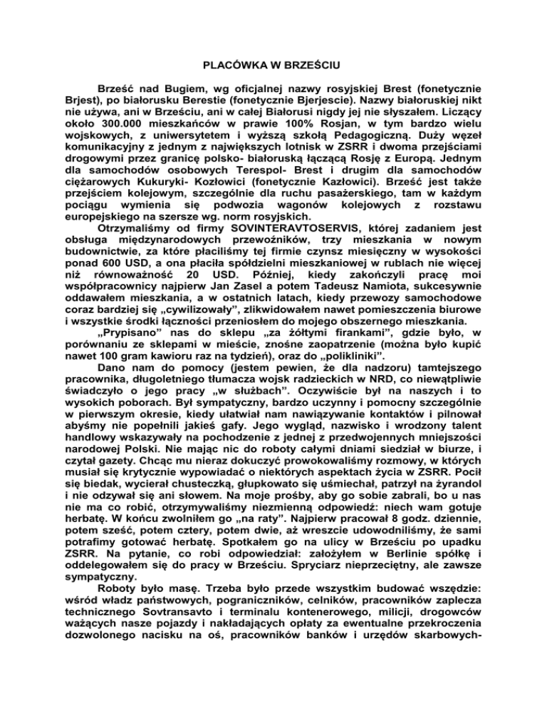 PLACÓWKA W BRZEŚCIU Brześć nad Bugiem, wg oficjalnej nazwy rosyjskiej Brest (fonetycznie Brjest), po białorusku Berestie (fonetycznie Bjerjescie). Nazwy białoruskiej nikt nie używa, ani w Brześciu, ani w całej Białorusi nigdy jej nie słyszałem. Liczący około 300.000 mieszkańców w prawie 100% Rosjan, w tym bardzo wielu wojskowych, z uniwersytetem i wyższą szkołą Pedagogiczną. Duży węzeł komunikacyjny z jednym z największych lotnisk w ZSRR i dwoma przejściami drogowymi przez granicę polsko- białoruską łączącą Rosję z Europą. Jednym dla samochodów osobowych Terespol- Brest i drugim dla samochodów ciężarowych Kukuryki- Kozłowici (fonetycznie Kazłowici). Brześć jest także przejściem kolejowym, szczególnie dla ruchu pasażerskiego, tam w każdym pociągu wymienia się podwozia wagonów kolejowych z rozstawu europejskiego na szersze wg. norm rosyjskich. Otrzymaliśmy od firmy SOVINTERAVTOSERVIS, której zadaniem jest obsługa międzynarodowych przewoźników, trzy mieszkania w nowym budownictwie, za które płaciliśmy tej firmie czynsz miesięczny w wysokości ponad 600 USD, a ona płaciła spółdzielni mieszkaniowej w rublach nie więcej niż równoważność 20 USD. Później, kiedy zakończyli pracę moi współpracownicy najpierw Jan Zasel a potem Tadeusz Namiota, sukcesywnie oddawałem mieszkania, a w ostatnich latach, kiedy przewozy samochodowe coraz bardziej się „cywilizowały”, zlikwidowałem nawet pomieszczenia biurowe i wszystkie środki łączności przeniosłem do mojego obszernego mieszkania. „Prypisano” nas do sklepu „za żółtymi firankami”, gdzie było, w porównaniu ze sklepami w mieście, znośne zaopatrzenie (można było kupić nawet 100 gram kawioru raz na tydzień), oraz do „polikliniki”. Dano nam do pomocy (jestem pewien, że dla nadzoru) tamtejszego pracownika, długoletniego tłumacza wojsk radzieckich w NRD, co niewątpliwie świadczyło o jego pracy „w służbach”. Oczywiście był na naszych i to wysokich poborach. Był sympatyczny, bardzo uczynny i pomocny szczególnie w pierwszym okresie, kiedy ułatwiał nam nawiązywanie kontaktów i pilnował abyśmy nie popełnili jakieś gafy. Jego wygląd, nazwisko i wrodzony talent handlowy wskazywały na pochodzenie z jednej z przedwojennych mniejszości narodowej Polski. Nie mając nic do roboty całymi dniami siedział w biurze, i czytał gazety. Chcąc mu nieraz dokuczyć prowokowaliśmy rozmowy, w których musiał się krytycznie wypowiadać o niektórych aspektach życia w ZSRR. Pocił się biedak, wycierał chusteczką, głupkowato się uśmiechał, patrzył na żyrandol i nie odzywał się ani słowem. Na moje prośby, aby go sobie zabrali, bo u nas nie ma co robić, otrzymywaliśmy niezmienną odpowiedź: niech wam gotuje herbatę. W końcu zwolniłem go „na raty”. Najpierw pracował 8 godz. dziennie, potem sześć, potem cztery, potem dwie, aż wreszcie udowodniliśmy, że sami potrafimy gotować herbatę. Spotkałem go na ulicy w Brześciu po upadku ZSRR. Na pytanie, co robi odpowiedział: założyłem w Berlinie spółkę i oddelegowałem się do pracy w Brześciu. Spryciarz nieprzeciętny, ale zawsze sympatyczny. Roboty było masę. Trzeba było przede wszystkim budować wszędzie: wśród władz państwowych, pograniczników, celników, pracowników zaplecza technicznego Sovtransavto i terminalu kontenerowego, milicji, drogowców ważących nasze pojazdy i nakładających opłaty za ewentualne przekroczenia dozwolonego nacisku na oś, pracowników banków i urzędów skarbowych- słowem wszędzie i u wszystkich przyjazne stosunki. Rosjanie i Białorusini to, szczególnie pojedynczo, przyjaźni, uczynni i dobrzy ludzie. Muszą się tylko przekonać, że się nie wywyższasz, nie traktujesz ich z góry, jak robi to zdecydowana większość Polaków, że jesteś ich przyjacielem, wtedy pomogą i załatwią wszystko i wszędzie. Jedną z dużych trudności w początkowym okresie mojej pracy było ograniczenie dróg, jakimi mogłem się poruszać. Otrzymana od odpowiednich władz d/s cudzoziemców (jakaś komórka KGB) przepustka, pozwalała mi na poruszanie się po drodze Brest(Brześć)-Minsk(Mińsk)-Maskwa(Moskwa), oraz Brest-Kowjel(Kowel)-Łuck-Rowno (Równe)-Kijów. Z Równego także do Lwowa. Było to bezwzględnie przestrzegane przez GAI (Gosudarskaja Awtomobilnaja Inspekcja- Państwowa Inspekcja Samochodowa), przy czym GAI jak wszystkie jednostki policyjne w państwach totalitarnych miała taką władze i budziła taki strach, że miejscowi na wszystko, co mówił milicjant mogli odpowiadać tylko: tak jest. Polak, który coś kwestionował słyszał: przaprzak (pogardliwa nazwa Polaka- słowo pochodzi od przaprzyczącej w uszach Rosjanina mowy polskiej), jak ci się nie podoba to uciekaj do swojej „Polszy”. Kiedyś nasz kierowca poszkodowany w wypadku drogowym został przewieziony do szpitala w Baranowiczach, gdzie zamarł. Pojechałem tam i pomimo tego, że pierwsze zabudowania Baranowicz leżą 200 m od autostrady (tzw. olimpijki wybudowanej w związku z Olimpiadą w Moskwie w 1980 r.) Brześć- Moskwa nie zostałem tam wpuszczony, gdyż nie miałem przepustki do Baranowicz. Później uzyskałem samochód z numerami dyplomatycznymi wraz z uprawnieniami, co pozwoliło mi na poruszanie się bez przeszkód. Po upadku ZSRR i lawinowym narastaniu ruchu zagranicznych samochodów sytuacja radykalnie się zmieniła- nie potrzebne były już żadne przepustki. Najgorsze było ukaranie mandatem, bowiem mandat trzeba było zapłacić w banku, po czym wrócić do milicjanta i okazać bankowy kwit. Oczywiście samochód zostawał w tym czasie na placówce milicyjnej. Dobrze, gdy działo się to mieście gdzie był bank. Ale jeżeli stało się to np. na trasie Brześć— Moskwa, gdzie, co kilkanaście, czy trochę więcej kilometrów stała budka z 2—3 urzędującymi tam milicjantami, dostanie się do banku w najbliższym mieście, przy b