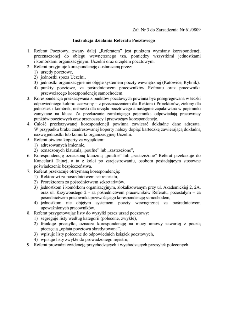 Zał. Nr 3 do Zarządzenia Nr 61/0809 Instrukcja działania Referatu Pocztowego 1. Referat Pocztowy, zwany dalej „Referatem” jest punktem wymiany korespondencji przeznaczonej do obiegu wewnętrznego tzn. pomiędzy wszystkimi jednostkami i komórkami organizacyjnymi Uczelni oraz urzędem pocztowym. 2. Referat przyjmuje korespondencję dostarczaną przez: 1) urzędy pocztowe, 2) jednostki spoza Uczelni, 3) jednostki organizacyjne nie objęte systemem poczty wewnętrznej (Katowice, Rybnik). 4) punkty pocztowe, za pośrednictwem pracowników Referatu oraz pracownika przewożącego korespondencję samochodem. 3. Korespondencja przekazywana z punktów pocztowych powinna być posegregowana w teczki odpowiedniego koloru: czerwony – z przeznaczeniem dla Rektora i Prorektorów, zielony dla jednostek i komórek, niebieski dla urzędu pocztowego a następnie zapakowana w pojemniki zamykane na klucz. Za przekazanie zamkniętego pojemnika odpowiadają pracownicy punktów pocztowych oraz przenoszący i przewożący korespondencję. 4. Całość przekazywanej korespondencji powinna zawierać dokładne dane adresata. W przypadku braku zaadresowanej koperty należy dopiąć karteczkę zawierającą dokładną nazwę jednostki lub komórki organizacyjnej Uczelni. 5. Referat otwiera koperty za wyjątkiem: 1) adresowanych imiennie, 2) oznaczonych klauzulą „poufne” lub „zastrzeżone”, 6. Korespondencję oznaczoną klauzulą „poufne” lub „zastrzeżone” Referat przekazuje do Kancelarii Tajnej, a ta z kolei po zarejestrowaniu, osobom posiadającym stosowne poświadczenie bezpieczeństwa. 7. Referat przekazuje otrzymaną korespondencję: 1) Rektorowi za pośrednictwem sekretariatu, 2) Prorektorom za pośrednictwem sekretariatów, 3) jednostkom i komórkom organizacyjnym, zlokalizowanym przy ul. Akademickiej 2, 2A, oraz ul. Krzywoustego 2 - za pośrednictwem pracowników Referatu, pozostałym – za pośrednictwem pracownika przewożącego korespondencję samochodem, 4) jednostkom nie objętym systemem poczty wewnętrznej za pośrednictwem upoważnionych pracowników. 8. Referat przygotowując listy do wysyłki przez urząd pocztowy: 1) segreguje listy według kategorii (polecone, zwykłe), 2) frankuje przesyłki, oznacza korespondencję na mocy umowy zawartej z pocztą pieczęcią „opłata pocztowa skredytowana”, 3) wpisuje listy polecone do odpowiednich książek pocztowych, 4) wpisuje listy zwykłe do prowadzonego rejestru, 9. Referat prowadzi ewidencję przychodzących i wychodzących przesyłek poleconych. Zał. Nr 4 do Zarządzenia Nr 61/0809 Instrukcja działania punktów pocztowych 1. Wymiana korespondencji pomiędzy Referatem Pocztowym, a jednostkami i komórkami organizacyjnymi mieszczącymi się w różnych budynkach prowadzona jest za pośrednictwem tzw. punktów pocztowych, z zastrzeżeniem ust. 2. 2. W szczególnych przypadkach korespondencję wymagającą natychmiastowego doręczenia lub potwierdzenia odbioru jednostki i komórki organizacyjne przekazują bezpośrednio przez swoich pracowników. 3. Jednostki i komórki organizacyjne przekazują całość korespondencji do punków pocztowych, gdzie osoby odpowiedzialne, wymienione w Zał. Nr 1 segregują korespondencję w teczki odpowiedniego koloru tj. czerwonego - z przeznaczeniem dla Rektora i Prorektorów, zielonego - z przeznaczeniem dla innych jednostek i komórek organizacyjnych Uczelni, niebieskiego - z przeznaczeniem dla urzędu pocztowego, a następnie pakują w pojemniki zamykane na klucz. Za przekazanie zamkniętego pojemnika odpowiadają pracownicy punków pocztowych oraz przenoszący i przewożący korespondencję. 4. Przekazywana korespondencja powinna zawierać dokładne dane adresata. W przypadku braku zaadresowanej koperty należy dopiąć karteczkę zawierającą dokładną nazwę jednostki lub komórki organizacyjnej Uczelni 5. Korespondencja kierowana do urzędu pocztowego powinna być ujęta w odpowiednim wykazie, stanowiącym Zał. Nr 1 i Nr 2 do niniejszej Instrukcji, z tym że w Zał. Nr 1 wypełnia się wyłącznie kolumnę 1,2 i 3. 6. Koperta powinna być zaadresowana (imię i nazwisko, adres) i ostemplowana pieczęcią firmową właściwej jednostki lub komórki, zgodnie ze wzorem stanowiącym Zał. Nr 3 do niniejszej Instrukcji. Ponadto koperta powinna zawierać oznaczenie, wskazujące kategorię przesyłki: P – polecony, PO – potwierdzenie odbioru, PR – priorytet, ZW – zwykły, a koperta z oznaczeniem PO dodatkowo wypełniony formularz pocztowy tzw. „zwrotkę” (do pobrania w Referacie). 7. Pracownicy punktów pocztowych sprawdzają przed wysłaniem poprawność przygotowanej do wysyłki korespondencji, zgodnie z ust. 5 i 6. Załącznik nr 1 do Instrukcji działania punktów pocztowych Imię i nazwisko (nazwa) oraz adres nadawcy ............................................................................................................................................................................ Lp. ADRESAT (imię i nazwisko lub nazwa) Dokładne miejsce doręczenia Wartość Kwota Masa zł kg gr Nr nadawczy Uwagi Opłata zł gr Kwota pobrania gr zł gr Opłata za pobranie zł 1 2 3 Z przeniesienia 4 5 6 7 Z przeniesienia 8 9 gr 10 Zał. Nr 2 do Instrukcji działania punktów pocztowych Wykaz listów zwykłych Lp. ADRESAT MIEJSCOWOŚĆ Załącznik Nr 3 do Instrukcji działania punktów pocztowych Wzór prawidłowo adresowanej przesyłki listowej w obrocie krajowym (z uwzględnieniem nadruku dotyczącego przesyłki reklamowej) → Anna Kowalska ul. Lipowa 3 m 110 87-036 TORUŃ TO MIEJSCE POWINNO ZOSTAĆ PUSTE UZUPEŁNIANE JEST PRZEZ REFERAT POCZTOWY ← Pole znaczkowe Pole nadawcy → PRZESYŁKA REKLAMOWA Wyróżnik przesyłki reklamowej Sz. P. Janina Nowak ul. Cicha 132 m 16 ← Pole adresowe 62-200 GNIEZNO STREFA KODOWA NIE UMIESZCZAĆ ŻADNYCH NAPISÓW ↕ min. 15 mm Wyróżniki kategorii – PRIORYTET, POLECONY, ZA POTWIERDZENIEM ODBIORU Wyróżnik kategorii w postaci nalepki na