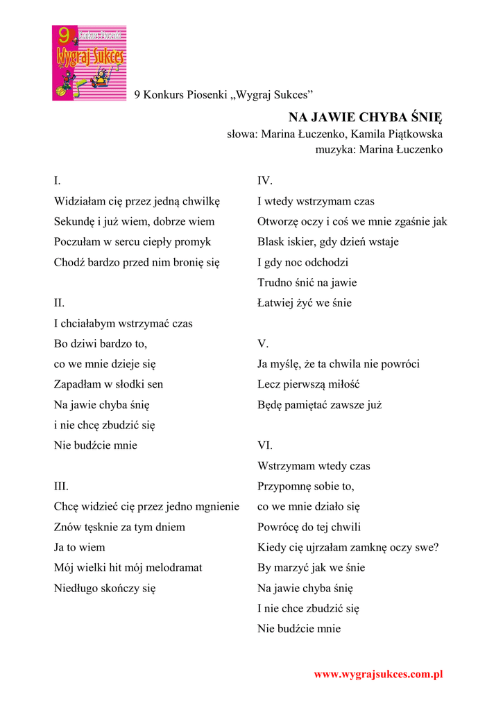 9 Konkurs Piosenki „Wygraj Sukces” NA JAWIE CHYBA ŚNIĘ słowa: Marina Łuczenko, Kamila Piątkowska muzyka: Marina Łuczenko I. IV. Widziałam cię przez jedną chwilkę I wtedy wstrzymam czas Sekundę i już wiem, dobrze wiem Otworzę oczy i coś we mnie zgaśnie jak Poczułam w sercu ciepły promyk Blask iskier, gdy dzień wstaje Chodź bardzo przed nim bronię się I gdy noc odchodzi Trudno śnić na jawie II. Łatwiej żyć we śnie I chciałabym wstrzymać czas Bo dziwi bardzo to, V. co we mnie dzieje się Ja myślę, że ta chwila nie powróci Zapadłam w słodki sen Lecz pierwszą miłość Na jawie chyba śnię Będę pamiętać zawsze już i nie chcę zbudzić się Nie budźcie mnie VI. Wstrzymam wtedy czas III. Przypomnę sobie to, Chcę widzieć cię przez jedno mgnienie co we mnie działo się Znów tęsknie za tym dniem Powrócę do tej chwili Ja to wiem Kiedy cię ujrzałam zamknę oczy swe? Mój wielki hit mój melodramat By marzyć jak we śnie Niedługo skończy się Na jawie chyba śnię I nie chce zbudzić się Nie budźcie mnie www.wygrajsukces.com.pl