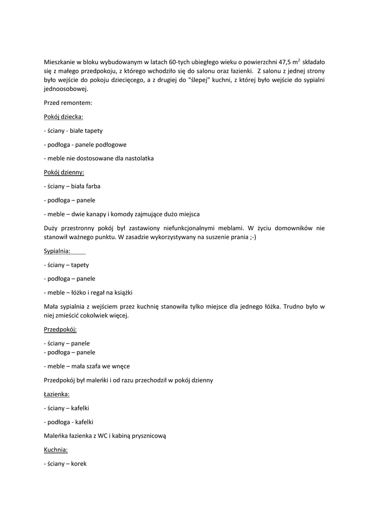 Mieszkanie w bloku wybudowanym w latach 60-tych ubiegłego wieku o powierzchni 47,5 m2 składało się z małego przedpokoju, z którego wchodziło się do salonu oraz łazienki. Z salonu z jednej strony było wejście do pokoju dziecięcego, a z drugiej do "ślepej" kuchni, z której było wejście do sypialni jednoosobowej. Przed remontem: Pokój dziecka: - ściany - białe tapety - podłoga - panele podłogowe - meble nie dostosowane dla nastolatka Pokój dzienny: - ściany – biała farba - podłoga – panele - meble – dwie kanapy i komody zajmujące dużo miejsca Duży przestronny pokój był zastawiony niefunkcjonalnymi meblami. W życiu domowników nie stanowił ważnego punktu. W zasadzie wykorzystywany na suszenie prania ;-) Sypialnia: - ściany – tapety - podłoga – panele - meble – łóżko i regał na książki Mała sypialnia z wejściem przez kuchnię stanowiła tylko miejsce dla jednego łóżka. Trudno było w niej zmieścić cokolwiek więcej. Przedpokój: - ściany – panele - podłoga – panele - meble – mała szafa we wnęce Przedpokój był maleńki i od razu przechodził w pokój dzienny Łazienka: - ściany – kafelki - podłoga - kafelki Maleńka łazienka z WC i kabiną prysznicową Kuchnia: - ściany – korek - podłoga – kafelki W zasadzie aneks kuchenny stanowiący przejście pomiędzy dużym pokojem a sypialnią. Bez dostępu do okna. W kuchni mieściła się również pralka. Układ mebli nie pozwalał już na zaplanowanie stołu. Domownicy spożywali posiłki przy maleńkim rozkładanym stoliku nad pralką. Mieszkanie wymagało generalnego remontu. Stara instalacja elektryczna (kable ciągnięte w korytkach pomiędzy pokojami) wymagała wymiany na nową. Właścicielce mieszkania marzyła się duża słoneczna kuchnia oraz nowa łazienka z wanną. Rodzice właścicielki pomogli zaprojektować nowy wariant mieszkania. W czasie remontu wyburzono ścianę pomiędzy sypialnią i kuchnią. Postawiono ścianę tworząc sypialnię w miejscu pokoju dziennego. W czasie remontu okazało się, że ściany wymagają „zerwania” wszystkiego aż do gołych tynków. Wszystkie ściany zostały wyrównane i pomalowane na biało. W kuchni pomiędzy szafkami oraz na ścianach w łazience ułożono białe płytki ceramiczne. Duże różnice poziomów pomiędzy pomieszczeniami wymagały wykonania nowych wylewek na podłogach. W pomieszczeniu nowej sypialni ułożono panele podłogowe. Podłogi w pozostałych pomieszczeniach wyłożono płytkami ceramicznymi. Ze względu na mały metraż zarówno w kuchni, jak i w łazience wykorzystano te same jasno szare płytki. Wykonano całkowicie nową instalacje elektryczną oraz instalacje wodno-kanalizacyjne. Wymieniono stare żeliwne kaloryfery na nowe grzejniki panelowe. Dzięki zupełnie nowej aranżacji przestrzeni zyskano zupełnie nowe, słoneczne mieszkanie. Jasna tonacja w jakiej utrzymano nowy wystrój (białe ściany, jasno szare podłogi) dodatkowo rozświetliła to małe mieszkanie. Nowa kuchnia zyskała miejsce na stół jadalny. Stała się jaśniejsza dzięki dostępowi do okna. Meble kuchenne zaaranżowano tak, że jest dużo miejsca na przygotowywanie posiłków. W kuchni oprócz zmywarki i pralki wreszcie zmieścił się duży piekarnik, którego bardzo brakowało gospodyni. Biała płyta gazowa świetnie współgra ze zlewem, również wykonanym z białego szkła. Na jednej ze ścian wykorzystano szarą farbę tablicową – ta część kuchni służy do komunikacji za pomocą krótkich tekstów pisanych kredą. Miejsce przy oknie zostało przewidziane na mały pokój dzienny. W planach zakup 2 małych foteli i stoliczka. Mieszkanie zyskało spory przedpokój. Na ścianie przylegającej do łazienki wykonano dużą szafę z drzwiami przesuwnymi, w której oprócz ubrań mieszczą się duże sprzęty typu odkurzacz, deska do prasowania, drabina. Lustra z których wykonano drzwi szafy optycznie powiększają mieszkanie. Na jednej ze ścian napis „Życie jest za krótkie…” przypomina lokatorom o ważnych w życiu sprawach ;-) Dzięki postawieniu nowej ściany, w miejscu dziennego pokoju powstała przestronna sypialnia. W sypialni oprócz wygodnego łóżka znalazło się miejsce na duży blat, który właścicielce służy jako biurko lub toaletka. By zasłonić rury z centralnego ogrzewania tuż przy oknie wykonano półki, które stanowią świetną biblioteczkę. Podłogę w sypialni pokrywają jasno szare panele współgrające z szarymi kaflami, którymi pokryte są podłogi w pozostałych pomieszczeniach. Ze względu na ograniczone fundusze, póki co, w pokoju nastolatka pozostawiono stare panele podłogowe i tapety na ścianach. Ściany zostały odświeżone i pokryte żywymi kolorami (pomarańcz i jasna zieleń). Pozostawiono dużą szafę z przesuwanymi drzwiami w lewej części pokoju. Wykonano meble na zmówienie. Duże biurko zaraz przy oknie stanowi miejsce na komputer i konsolę do gier. Na półkach po obu stronach okna mieszczą się książki i gry planszowe. Nastolatek chciał tez mieć drugie biuro, które stanowi jego miejsce do nauki i odrabiania lekcji. Po przeciwnej stronie znalazło się wygodne łóżko. Łazienka została zupełnie od nowa zaaranżowana. Dzięki przeniesieniu toalety w inne miejsce zyskano przestrzeń na niewielka wannę. Dzięki zainstalowaniu panela prysznicowego oraz szklanego panela nawannowego wanna pełni też funkcje prysznica. Aranżacja mebli wykonanych na zamówienie sprawia, że mimo małej przestrzeni łazienka pomieści wiele kosmetyków i środków czystości (szafka nad toaletą, duże szuflady pod umywalką i płytka szafa z lustrem na ścianie vis a vi umywalki).