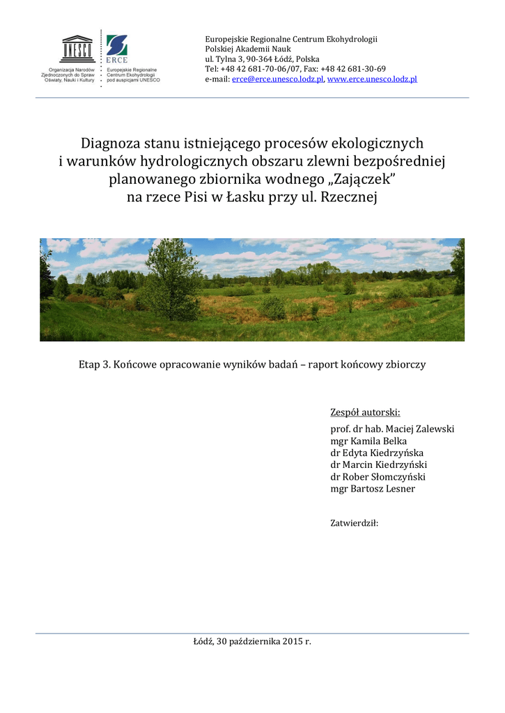 Europejskie Regionalne Centrum Ekohydrologii Polskiej Akademii Nauk ul. Tylna 3, 90-364 Łódź, Polska Tel: +48 42 681-70-06/07, Fax: +48 42 681-30-69 e-mail: [email protected], www.erce.unesco.lodz.pl Diagnoza stanu istniejącego procesów ekologicznych i warunków hydrologicznych obszaru zlewni bezpośredniej planowanego zbiornika wodnego „Zajączek” na rzece Pisi w Łasku przy ul. Rzecznej Etap 3. Końcowe opracowanie wyników badań – raport końcowy zbiorczy Zespół autorski: prof. dr hab. Maciej Zalewski mgr Kamila Belka dr Edyta Kiedrzyńska dr Marcin Kiedrzyński dr Rober Słomczyński mgr Bartosz Lesner Zatwierdził: Łódź, 30 października 2015 r. Europejskie Regionalne Polskiej Akademii Nauk Centrum Ekohydrologii Spis treści 1. Przedmiot opracowania ................................................................................................................... 4 2. Cel opracowania .............................................................................................................................. 5 3. Wprowadzenie ................................................................................................................................. 6 4. Ekohydrologia jako nauka zintegrowana ........................................................................................ 9 5. Obszar objęty opracowaniem ........................................................................................................ 13 6. Ogólna charakterystyka terenu ...................................................................................................... 14 6.1. Położenie na tle podziału administracyjnego kraju ............................................................... 14 6.2. Charakterystyka fizycznogeograficzna ................................................................................. 15 6.3. Warunki klimatyczne ............................................................................................................ 16 6.4. Warunki hydrologiczne ......................................................................................................... 18 6.4.1. Sieć hydrograficzna i zasięg zlewni planowanego zbiornika ........................................ 18 6.4.2. Przepływy i stany charakterystyczne............................................................................. 21 6.4.3. Warunki hydrograficzne obszaru opracowania ............................................................. 23 6.5. Charakterystyka geologiczna................................................................................................. 23 6.6. Charakterystyka wrażliwości wód podziemnych na zanieczyszczenia ................................. 24 6.7. Charakterystyka glebowo-rolnicza ........................................................................................ 25 6.8. Struktura użytkowania terenu ................................................................................................ 26 6.8.1. Struktura użytkowania zlewni Grabi do profilu projektowanego zbiornika ................. 26 6.8.2. Struktura użytkowania zlewni bezpośredniej projektowanego zbiornika ..................... 28 6.9. Istniejące formy ochrony przyrody w obrębie oraz w bezpośrednim sąsiedztwie planowanego zbiornika...................................................................................................................... 30 6.9.1. Obszar Natura 2000 PLH100021 Grabia ...................................................................... 30 6.9.2. Zespół Przyrodniczo-Krajobrazowy Dolina Grabi ........................................................ 33 6.9.3. Użytek ekologiczny Rzeka Grabia ................................................................................ 34 Potencjalne i istniejące źródła zanieczyszczeń wód powierzchniowych i podziemnych .. 36 6.10. 7. Materiały i metody ........................................................................................................................ 39 7.1. Terminologia stosowana w opracowaniu .............................................................................. 39 7.2. Charakterystyka stanowisk badawczych ............................................................................... 39 7.3. Analiza jakości wód powierzchniowych i gruntowych ......................................................... 41 7.3.1. Parametry fizyczne wody .............................................................................................. 41 7.3.2. Stężenie zawiesiny ........................................................................................................ 41 7.3.3. Formy rozpuszczone pierwiastków ............................................................................... 41 7.3.4. Fosfor całkowity (TP) i fosfor całkowity rozpuszczony (DP) ...................................... 42 1|Strona Europejskie Regionalne Polskiej Akademii Nauk 7.3.5. Centrum Ekohydrologii Azot całkowity (TN) i azot rozpuszczony (DN) ........................................................... 42 7.4. Metodyka analizy parametrów fizykochemicznych osadów rzecznych ................................ 43 7.5. Metodyka badań i waloryzacji szaty roślinnej ...................................................................... 45 7.6. Wstępna ocena faunistyczna.................................................................................................. 46 8. Analiza aktualnych warunków meteorologicznych i hydrologicznych oraz procesów biogeochemicznych ............................................................................................................................... 48 9. 8.1. Warunki meteorologiczne w okresie badawczym ................................................................. 48 8.2. Warunki hydrologiczne w okresie badawczym ..................................................................... 48 8.3. Pomiary własne przepływów ...............................................