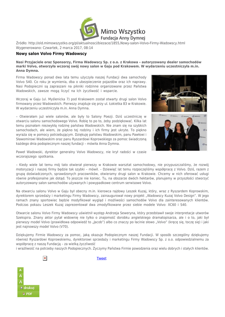 Źródło: http://old.mimowszystko.org/pl/aktualnosci/biezace/1855,Nowy-salon-Volvo-Firmy-Wadowscy.html Wygenerowano: Czwartek, 2 marca 2017, 08:14 Nowy salon Volvo Firmy Wadowscy Nasi Przyjaciele oraz Sponsorzy, Firma Wadowscy Sp. z o.o. z Krakowa – autoryzowany dealer samochodów marki Volvo, otworzyła wczoraj swój nowy salon w Gaju pod Krakowem. W wydarzeniu uczestniczyła m.in. Anna Dymna. Firma Wadowscy ponad dwa lata temu użyczyła naszej Fundacji dwa samochody Volvo S40. Co roku je wymienia, dba o ubezpieczenie pojazdów oraz ich naprawy. Nasi Podopieczni są zapraszani na pikniki rodzinne organizowane przez Państwa Wadowskich, zawsze mogą liczyć na Ich życzliwość i wsparcie. Wczoraj w Gaju (ul. Myślenicka 7) pod Krakowem został otwarty drugi salon Volvo firmowany przez Wadowskich. Pierwszy znajduje się przy ul. Łokietka 83 w Krakowie. W wydarzeniu uczestniczyła m.in. Anna Dymna. – Otwierałam już wiele salonów, ale były to Salony Poezji. Dziś uczestniczę w otwarciu salonu samochodowego Volvo. Robię to po to, żeby podziękować. Kilka lat temu poznałam niezwykłą rodzinę państwa Wadowskich. Nie znam się na szybkich samochodach, ale wiem, że piękno tej rodziny i ich firmy jest ukryte. To piękno wyraża się w pomocy potrzebującym. Dziękuję państwu Wadowskim, panu Pawłowi i Sławomirowi Wadowskim oraz panu Ryszardowi Koprowskiego za pomoc świadczoną każdego dnia podopiecznym naszej fundacji – mówiła Anna Dymna. Paweł Wadowski, dyrektor generalny Volvo Wadowscy, nie krył radości w czasie wczorajszego spotkania. – Kiedy wiele lat temu mój tato otwierał pierwszy w Krakowie warsztat samochodowy, nie przypuszczaliśmy, że rozwój motoryzacji i naszej firmy będzie tak szybki – mówił. – Dziewięć lat temu rozpoczęliśmy współpracę z Volvo. Dziś, razem z grupą doświadczonych, sprawdzonych pracowników, otwieramy drugi salon w Krakowie. Chcemy w nich oferować usługi równie profesjonalne jak dotąd. To jeszcze nie koniec. Tu, na obszarze dwóch hektarów, planujemy w przyszłości stworzyć autoryzowany salon samochodów używanych i powypadkowe centrum serwisowe Volvo. Na otwarciu salonu Volvo w Gaju był obecny m.in. kierowca rajdowy Leszek Kuzaj, który, wraz z Ryszardem Koprowskim, dyrektorem sprzedaży i marketingu Firmy Wadowscy, zainaugurował nowy projekt „Wadowscy Kuzaj Volvo Design”. W jego ramach znany sportowiec będzie modyfikował wygląd i możliwości samochodów Volvo dla zainteresowanych klientów. Podczas pokazu Leszek Kuzaj zaprezentował dwa zmodyfikowane przez siebie modele Volvo: XC60 i S40. Otwarcie salonu Volvo Firmy Wadowscy uświetnił występ Andrzeja Seweryna, który przedstawił swoje interpretacje utworów Szekspira. Znany aktor pytał widownię nie tylko o znajomość dorobku angielskiego dramatopisarza, ale i o to, jaki był pierwszy model Volvo (prawidłowa odpowiedź to „Jacob”) albo co znaczy po łacinie słowo „Volvo” (kręcę się, toczę się) i jaki jest najnowszy model Volvo (V70). Dziękujemy Firmie Wadowscy za pomoc, jaką okazuje Podopiecznym naszej Fundacji. W sposób szczególny dziękujemy również Ryszardowi Koprowskiemu, dyrektorowi sprzedaży i marketingu Firmy Wadowscy Sp. z o.o. odpowiedzialnemu za współpracę z naszą Fundacją – za wielką życzliwość i wrażliwość na potrzeby naszych Podopiecznych. Życzymy Państwa Firmie powodzenia oraz wielu dobrych i stałych klientów. Tweet