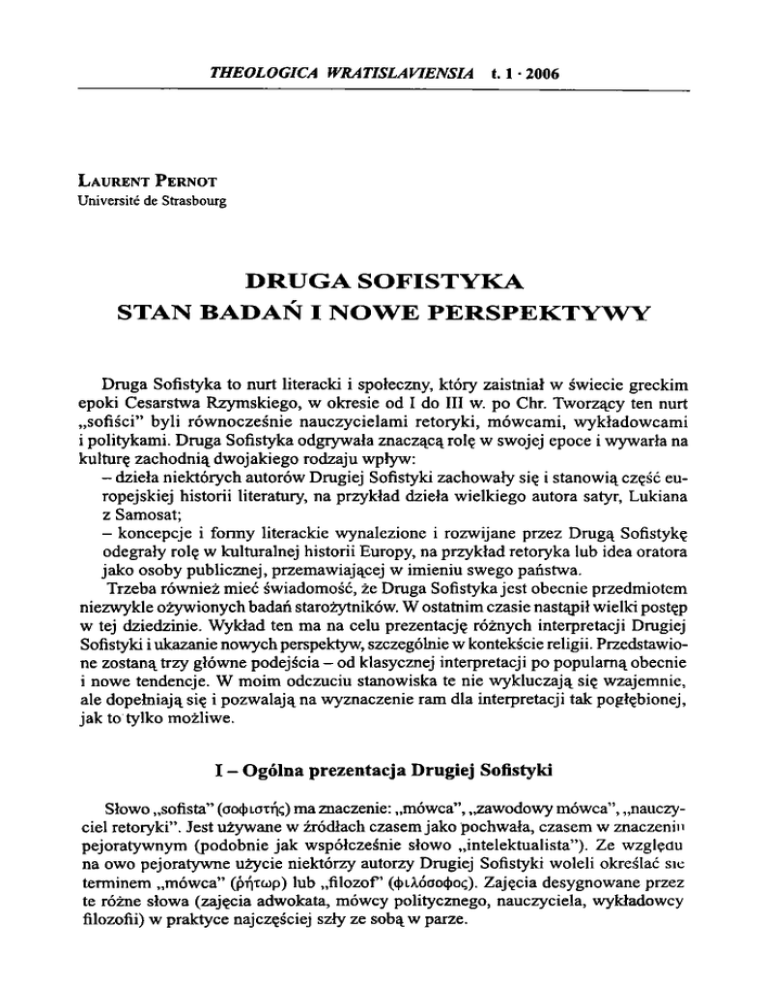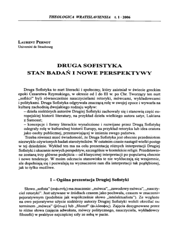 THEOLOGICA WRA TISLA VIENSIA 1.1 • 2006 L aurent P ernot Université de Strasbourg DRUGA SOFISTYKA STAN BADAŃ I NOWE PERSPEKTYWY Druga Sofistyka to nurt literacki i społeczny, który zaistniał w świecie greckim epoki Cesarstwa Rzymskiego, w okresie od I do III w. po Chr. Tworzący ten nurt „sofiści” byli rów nocześnie nauczycielam i retoryki, m ówcam i, w ykładowcam i i politykami. Druga Sofistyka odgrywała znaczącą rolę w swojej epoce i wywarła na kulturę zachodnią dwojakiego rodzaju wpływ: - dzieła niektórych autorów Drugiej Sofistyki zachowały się i stanowią część eu ropejskiej historii literatury, na przykład dzieła wielkiego autora satyr, Lukiana z Samosat; - koncepcje i formy literackie wynalezione i rozwijane przez Drugą Sofistykę odegrały rolę w kulturalnej historii Europy, na przykład retoryka lub idea oratora jako osoby publicznej, przemawiającej w imieniu swego państwa. Trzeba również mieć świadomość, że Druga Sofistyka jest obecnie przedmiotem niezwykle ożywionych badań starożytników. W ostatnim czasie nastąpił wielki postęp w tej dziedzinie. W ykład ten ma na celu prezentację różnych interpretacji Drugiej Sofistyki i ukazanie nowych perspektyw, szczególnie w kontekście religii. Przedstawio ne zostaną trzy główne podejścia - od klasycznej interpretacji po popularną obecnie i nowe tendencje. W moim odczuciu stanowiska te nie wykluczają się wzajemnie, ale dopełniają się i pozwalają na wyznaczenie ram dla interpretacji tak pogłębionej, jak to tylko możliwe. I - Ogólna prezentacja Drugiej Sofistyki Słowo „sofista” (ao())ioTr|ę) ma znaczenie: „mówca”, „zawodowy mówca”, „nauczy ciel retoryki”. Jest używane w źródłach czasem jako pochwała, czasem w znaczeniu pejoratywnym (podobnie jak współcześnie słowo „intelektualista”). Ze względu na owo pejoratywne użycie niektórzy autorzy Drugiej Sofistyki woleli określać sic terminem „mówca” (piyccjp) lub „filozof’ ((J>Uóao<t>oę). Zajęcia desygnowane przez te różne słowa (zajęcia adwokata, mówcy politycznego, nauczyciela, wykładowcy filozofii) w praktyce najczęściej szły ze sobą w parze. 20 Laurent Pemot Wyrażenie „Druga Sofistyka” należy rozumieć w odniesieniu do Pierwszej Sofi styki z V-IV w. przed Chr., która była reprezentowana przez Gorgiasza, Protagorasa, Hippiasza i stanowiła przedmiot krytyki Platona. Jak w V-IV w. przed Chr. świat grecki poznał wybitnych sofistów, tak w pierwszych trzech wiekach cesarstwa po jawiło się wiele osób o podobnych kwalifikacjach. Dla określenia tych ostatnich, w odróżnieniu od „dawnych sofistów”, używano wyrażeń: „nowi sofiści”, „Nowa Sofistyka”, „Druga Sofistyka” . Było to zgodne ze zwyczajami w epoce cesarstwa, kiedy to chętnie definiowano teraźniejszość w relacji do przeszłości i widziano aktu alne zjawiska jako kontynuację dawnych osiągnięć. Druga Sofistyka nie była ruchem zorganizowanym, ale składało się na nią wiele podejść indywidualnych, powiązanych ze sobą pewnym wspólnym stanem ducha, dzieloną praktyką instytucji edukacyjnych i intelektualnych oraz licznymi kontakta mi osobistymi. Nie istnieje zatem oficjalna lista sofistów Drugiej Sofistyki; zjawisko to ma różne oblicza. Najlepszy opis Drugiej Sofistyki został podany w Żywotach sofistów Filostrata, napisanych ok. 230 r. po Chr. Zawierają one około czterdziestu biografii sofistów z okresu cesarstwa. Dzieła niewielu jednak spośród tych czterdziestu sofistów zacho wały się w całości lub w części1. Druga Sofistyka rozwinęła się w obrębie Cesarstwa Rzymskiego, które zdomi nowało cały basen Morza Śródziemnego, to znaczy zarówno prowincje zachodnie, gdzie posługiwano się łaciną, jak i prowincje wschodnie, gdzie mówiono po grecku. Była to ogromna scentralizowana struktura polityczna, solidnie ukonstytuowana i akceptowana przez znakom itą większość poddanych. Sytuacja w cesarstwie była bardzo korzystna dla aktywności sofistów. - Sytuacja polityczna i materialna. Po okresie wojen domowych, ustanowienie cesarstwa przyniosło pokój (słynny „pokój rzymski”) i stabilność polityczną. Szcze gólnie II wiek był okresem rozkwitu imperium, okresem prosperity, prestiżu, bez pieczeństwa i łatwości komunikacji. Wszystkie te elementy sprzyjały rozwojowi kulturalnemu, a szczególnie aktywności sofistów, którzy potrzebowali stabilnych instytucji i możliwości podróżowania (sofiści byli wędrownymi nauczycielami). - Sytuacja kulturalna. II wiek to epoka cesarzy filhellenów (Hadrian, Antonin, Marek Aureliusz), to znaczy cesarzy, którzy znakomicie znali język i kulturę grec ką, szanowali grecką cywilizację i wspierali rozwój prowincji hellenofońskich, nadając im przywileje ekonomiczne i honorowe.1 1 Wybór tekstów źródłowych autorów Drugiej Sofistyki lub im współczesnych, m ówców i znaw ców retoryki w Collection des Universités de France (éd. Les Belles Lettres, Paris): Aelius Théon, Progymnasmata; Apsines; Lucien (ukazały się 3 t.); Pseudo-Aelius Aristide; - w Loeb Classical Library: Eliusz Arystydes (t. 1, jedyny opublikowany); Dion z Prusy, zwany Złotoustym; Lukian; Filostratos (jego Żywoty sofistów ); poza tym: Menander Retor, Oxford 1981; Eloges grecs de Rome, Paris 1997. Studia poświęcone Drugiej Sofistyce: G. Anderson, The Second Sophistic. A Cultural Phenomenon in the Roman Empire, Londres 1993; G. A. Kennedy, The Art ofRhetoric in the Roman World, 300 B.C. - A.D. 300, Princeton 1972; L. Pemot, La rhétorique dans l ’Antiquité, Paris 2000, rozdz.. VI (przekład amerykański - Washington, 2005). Druga sofistyka. Stan badań i nowe perspektywy 21 Sofiści byli przede wszystkim nauczycielami retoryki. W epoce cesarstwa naucza nie obejmowało trzy poziomy: nauczanie początkowe, prowadzone przez wychowawcę w domu lub przez nauczyciela - w jego trakcie dzieci uczono głównie pi