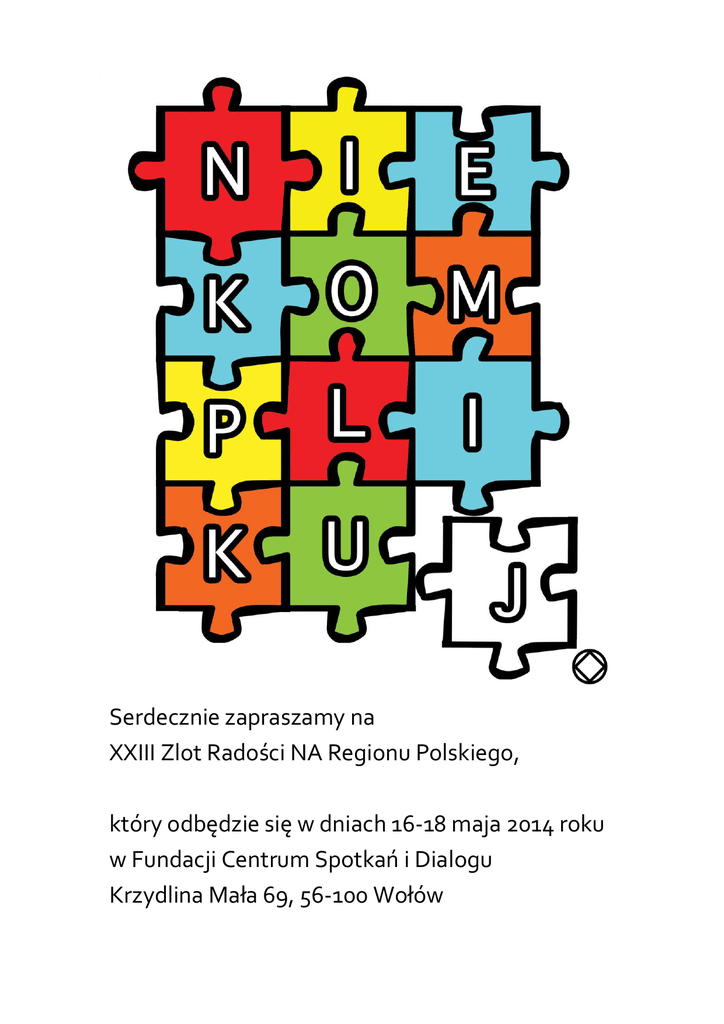 Serdecznie zapraszamy na XXIII Zlot Radości NA Regionu Polskiego, który odbędzie się w dniach 16-18 maja 2014 roku w Fundacji Centrum Spotkań i Dialogu Krzydlina Mała 69, 56-100 Wołów Zlot Radości w Krzydlinie PIĄTEK 15.00 16.00 18.00 – 19.00 20.00 22.00 Otwarcie recepcji Miting Rozgrzewkowy Kolacja Ognisko Miting Nocny SOBOTA 8.00- 9.00 9.30 - 11:00 Śniadanie Miting Otwierający Zlot Temat: Nie Komplikuj 11.30 -13.00 Bieg Zdrowienia na 1 mile Krzydlińską Sprzedaż literatury przez Biuro Literatury 13.00 -14.00 Obiad 14.30 -16.00 Miting Damski i Męski Temat: Sfera męskości/ kobiecości w aspekcie zdrowienia 16.30 - 18.00 Warsztat H&I Prowadzący: Delegat Norwegii – Bill, Delegat Izraela - Dror 18.00 - 19.00 Kolacja 19.30 - 20.30 Licytacja 20.30 - 22.30 Dyskoteka część I 22.30- 23.30 Koncert 23.30 - ????? Dyskotek część II 22.00 – do rana Miting nocny (po koncercie) NIEDZIELA 8.00 – 9.00 9.30 – 11.00 11.00 – 11.30 11.30 – 13.30 13.30 – 14.30 Śniadanie Miting Spikerski Przerwa na kawę Miting kończący zlot Obiad W czasie zlotu działać będzie: Hurtownia Gadżetów oraz Księgarnia Zlotu Radości Zakwaterowanie CAŁY POBYT (dwa noclegi + pełne wyżywienie) - pokoje z łazienkami – 160,00 zł - pokoje z umywalkami – 150,00 zł - pokoje wieloosobowe – 140,00 zł - materace + własny śpiwór – 120,00 zł - namiot + własny śpiwór – 110,00 zł NOCLEGI DOKUPOWANE ODDZIELNIE: - pokoje z łazienkami – 40,00 zł/doba/osoba - pokoje z umywalkami – 35,00 zł/doba/osoba - pokoje 6-10 osobowe – 30,00 zł/doba/osoba - materace + własny śpiwór – 20,00 zł/doba/osoba - namiot + własny śpiwór – 10,00 zł/doba/osoba WYŻYWIENIE DOKUPOWANE ODDZIELNIE: - śniadanie – 15,00 zł/os. - obiad – 20,00 zł/os. - kolacja – 15,00zł/os. Osoby które chcą korzystać z wyżywienia wegetariańskiego, proszone są kontakt i poinformowanie o tym organizatorów. Wkład dla „Naszego wspólnego dobra” Akredytacja 35 zł. Rodzice którzy są zainteresowani opieką nad dziećmi (cała sobota) proszone są o potwierdzenie takiej potrzeby najpóźniej do 05.05.2014r organizatorom (Janka lub Marta). W przypadku braku zgłoszeń lub małej ilości zgłoszeń opieka nie będzie dostępna. Zachęcamy do dokonywania przedpłat! Przedpłata gwarantuje: 1. Zabezpieczenie rezerwacji- masz pewność, że Twój pokój nie zostanie zajęty przez kogoś innego, 2. Preferencyjne warunki pobytu- gwarantujemy Ci najlepszy z dostępnych pokoi; dysponujemy pokojami o różnym standardzie (decyduje kolejność przedpłat) 3. Twoje pieniądze z przedpłat umożliwią zrealizowanie tego zlotu, 4. Oszczędzasz czas potrzebny do formalnej rejestracji Procedura dokonywania przedpłat: 1. Podejmij decyzję o przyjeździe na zlot. 2. Wybierz interesujący Cię standard pokoju. 3. Zastanów się, w jakim zakresie chcesz korzystać z wyżywienia na miejscu. 4. Dokonaj przelewu w kwocie odpowiadającej powyższym kryteriom. 5. W tytule przelewu umieść swoje imię, nazwę grupy i miasto z którego przyjeżdżasz, nazwę interesującego Cię pokoju a także charakterystykę wyżywienia: (np. Bronek-„Razem”-Warszawa-pok. z łazienką, 2 śniad.,2ob.,2kol.) (np. Zosia- „Wspólnie”- Wrocław -pok. wielosobwy, 1śniad.,1ob.,1kol.) Zgłoszenia rezerwacji pokoju i wyżywienia prosimy dokonywać na mail: [email protected] Numer konta na które trzeba dokonywać przedpłaty zostanie podany w mailu zwrotnym po dokonaniu rezerwacji. Prosimy o przybycie na zlot z wydrukowanym potwierdzeniem przelewu. Dojazd Krzydlina Mała 69, 56-100 Wołów Fundacja Centrum Spotkań i Dialogu Misjonarze Klaretynki www.krzydlina.eu dojazd autem namiary gps GPS: N 52*17’48.04” E 16*32’29.43” -dojazd PKP i PKS do Wołowa a następnie dalej „Transport NA” -Ze stacji kolejowej PKP w Wołowie lub dworca PKS na miejsce zlotu będzie odwoził wszystkich uczestników „Transport NA” (kontakt Sebek, Sylwek) Zapraszamy serdecznie Kontakt do organizatorów: (prosimy dzwonić pomiędzy 19.00 a 22.00 !!!) Organizacja Janka 687 185 893 Marta 696 635 981 Rezerwacja Krysia 728 927 941 Transport Sebek 883 839 907 Sylwek 505 638 721 Serdecznie zachęcamy do przywiezienia ze sobą NA-owskich zapasów gadżetów, które będziecie mogli przekazać na poczet licytacji i loterii. Mile widziane wypieki cukiernicze na sprzedaż. Chcę być odpowiedzialnym przyjacielem. Będę dążyć do tego, by nie komplikować swoich zadośćuczynień. (Medytacja 18.05)