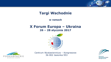 Targi Wschodnie w ramach X Forum Europa – Ukraina 26 – 28 stycznia 2017 Centrum Wystawienniczo – Kongresowe 36-002 Jasionka 953 X Forum Europa-Ukraina Największa w Polsce międzynarodowa konferencja poświęcona kluczowym zagadnieniom modernizacji i rozwoju Ukrainy • Ok. 600 gości z Ukrainy, Polski i pozostałych krajów Europy, przedstawicieli sektorów m.in.: energetycznego, turystycznego, transportu, infrastruktury, outsourcingu, edukacji • 3 Sesje plenarne: kluczowi decydenci będą rozmawiać o współpracy gospodarczej i politycznej Ukrainy i krajów europejskich • 40 paneli dyskusyjnych poświęconych szeroko pojętym zagadnieniom ekonomicznym, społecznym i politycznym • Prezentacje ukraińskich regionów, wybranych sektorów gospodarki etc. Dlaczego warto wziąć udział w Targach Wschodnich • 2200m² przestrzeni wystawienniczej • Udział w największym wydarzeniu dedykowanemu zagadnieniom Polski, Ukrainy i innych krajów europejskich • Relacje z konferencji w głównych mediach Polski i Ukrainy • 3-dniowe targi wystawców z Europy i Ukrainy • Przedstawienie flagowych produktów i projektów oraz umocnienie pozycji na rynku • Okazja do nawiązania kontaktów handlowych i wymiany doświadczeń • Stoisko informacyjne dla biznesu (możliwość uzyskania informacji i porad odnośnie inwestowania i prowadzenia działalności, zatrudniania pracowników) Prezentacja regionów Możliwość przestawienia informacji o: • • możliwościach inwestycyjnych współpracy międzynarodowej • • potencjale turystycznym kulturze regionu Informacje organizacyjne Możliwe wymiary powierzchni: • 6 m² • 12 m² • do ustalenia- według zapotrzebowania rejestracja 1 osoby z firmy wystawcy 100 zł+VAT rejestracja 1 osoby do obsługi technicznej stoiska 50zł+VAT koszt powierzchni do zabudowy własnej bezpłatnie koszt zabudowy do zarezerwowanej powierzchni firma wystawca • • • Zgłoszenia firm przyjmowane są mailowo do 20 grudnia 2016 O przyznaniu miejsca wystawienniczego decyduje kolejność zgłoszeń Przedstawiona oferta ważna do 20 grudnia 2016 Kontakt dla firm z Polski: Kontakt dla regionów z Polski: Magdalena Trzaskowska Tel. 22 583 11 49 E-mail: [email protected] Marta Bruczuk Tel. 22 583 11 26 E-mail: [email protected] Wszystkich uczestników zobowiązuje rejestracja na stronie: www.forum-ekonomiczne.pl/x-forum-europa-ukraina