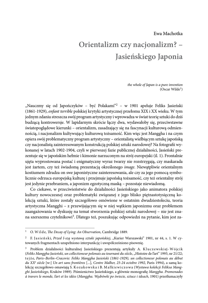 Ewa Machotka Orientalizm czy nacjonalizm? – Jasieńskiego Japonia the whole of Japan is a pure invention (Oscar Wilde1) „Nauczmy się od Japończyków – być Polakami”2 – w 1901 apeluje Feliks Jasieński (1861‑1929), enfant terrible polskiej krytyki artystycznej przełomu XIX i XX wieku. W tym jednym zdaniu streszcza swój program artystyczny i wprowadza w świat teorię sztuki do dziś budzącą kontrowersje. W lapidarnym skrócie łączy dwa, wydawałoby się, przeciwstawne światopoglądowe kierunki – orientalizm, zasadzający się na fascynacji kulturową odmien‑ nością, i nacjonalizm kultywujący kulturową tożsamość. Kim więc jest Manggha i na czym opiera swój problematyczny program artystyczny – orientalistą wielbiącym sztukę japońską czy nacjonalistą zainteresowanym konstrukcją polskiej sztuki narodowej? Na fotografii wy‑ konanej w latach 1902‑1904, czyli w pierwszej fazie publicznej działalności, Jasieński pre‑ zentuje się w japońskim hełmie i kimonie narzuconym na strój europejski (il. 1). Frontalnie ujęta wyprostowana postać i enigmatyczny wyraz twarzy nie rozstrzygają, czy maskarada jest żartem, czy też świadomą prezentacją określonego image. Niewątpliwie orientalnym kostiumem zdradza on swe japonistyczne zainteresowania, ale czy za jego pomocą symbo‑ licznie odrzuca europejską kulturę i przejmuje japońską tożsamość, czy też orientalny strój jest jedynie przebraniem, a japonizm egzotyczną maską – pozostaje niewiadomą. Co ciekawe, w przeciwieństwie do działalności Jasieńskiego jako animatora polskiej kultury nowoczesnej oraz problematyki związanej z jego blisko piętnastotysięczną ko‑ lekcją sztuki, które zostały szczegółowo omówione w ostatnim dwudziestoleciu, teoria artystyczna Mangghi – z przewijającym się w niej wątkiem japonizmu oraz problemem zaangażowania w dyskusję na temat stworzenia polskiej sztuki narodowej – nie jest zna‑ na szerszemu czytelnikowi3. Dlatego też, poszukując odpowiedzi na pytanie, kim jest za‑ 1 O. W i l d e, The Decay of Lying: An Observation, Cambridge 1889. 2 F. J a s i e ń s k i, Przed I-szą wystawą sztuki japońskiej, „Kurier Warszawski” 1901, nr 44, s. 1. W cy‑ towanych fragmentach uzupełniono interpunkcję i uwspółcześniono pisownię. 3 Problem działalności kulturalnej Jasieńskiego prezentują artykuły A. K l u c z e w s k i ej ‑ W ó jc i k (Feliks Manggha Jasieński, un collectioneur polonais au tournant du siècle, „Histoire de l’art” 1993, nr 21/22; t e j ż e, Paris–Berlin–Cracovie: Feliks Manggha Jasieński (1861‑1929), un collectioneur polonais au début du XXe siècle [w:] Un art sans frontières [...], Centre Malher, 23‑24 octobre 1992, Paris 1994), a samą ko‑ lekcję szczegółowo omawiają S. K o z a k o w s k a i B. M a ł k i e w i c z o w a (Wystawa kolekcji Feliksa Mangghi Jasieńskiego, Kraków 1989). Piśmienictwo Jasieńskiego, a głównie monografię Manggha. Promenades à travers le monde, l’art et les idées (Manggha. Wędrówki po świecie, sztuce i ideach, 1901) przetłumaczyły 88 Ewa Machotka 1. Feliks Jasieński w hełmie japońskim i kimonie na bal‑ konie swego mieszkania, fo‑ tografia arch. ok. 1902‑1904, MNK‑NGI‑3411 gadkowy człowiek w kimonie nawołujący Polaków do wzorowania się na Japończykach, działalność Jasieńskiego odnieść należałoby przede wszystkim do licznie publikowanych „manifestów”, osadzając je w kontekście rozwijających się w końcu wieku XIX ideologii związanych z dwoma wykluczającymi się kierunkami myślowymi – orientalizmem i na‑ cjonalizmem. Jasieński pojawia się w świadomości zbiorowej jako polemista i animator polskiego ży‑ cia kulturalnego w przełomowym roku 19014. Wraz z wydaniem tomu Manggha. Promenades à travers le monde, l’art et les idées (Manggha. Wędrówki po świecie, sztuce i ideach) – który ukazuje się w Paryżu i w Warszawie, będąc rodzajem literackiej podróży estetycznej po Europie i Bliskim Wschodzie – oraz publikacją w czasopiśmie „Chimera” krytycznego pośmiertnego wspomnienia o Wojciechu Gersonie (1831‑1901)5, a także wraz z pierwszą prezentacją zbiorów japonistycznych w Towarzystwie Zachęty Sztuk Pięknych w Warsza‑ i przeanalizowały E. M i o d o ń s k a ‑ B r o o k s i M. C i e ś l a ‑ K o r y t o w s k a (Feliks Jasieński i jego Manggha, Kraków 1992). Koncepcji sztuki narodowej stworzonej przez Jasieńskiego autorka niniejszego opra‑ cowania poświęciła niepublikowaną rozprawę magisterską (Koncepcja polskiej sztuki narodowej Feliksa Mangghi Jasieńskiego: rola sztuki japońskiej. Od idei do realizacji, Instytut Historii Sztuki UJ, 1998). 4 W związku z charakterem niniejszej monografii szczegółowa biografia Jasieńskiego pozostaje poza zakresem prezentowanych rozważań. 5 F. J a s i e ń s k i, W kwestii drobnego nieporozumienia, „Chimera” 1901, t. I, z. 2, s. 354‑356. Orientalizm czy nacjonalizm? – Jasieńskiego Japonia wie, Jasieński wkracza w domenę życia publicznego, której pozostanie aktywnym uczest‑ nikiem przez blisko trzy następne dekady. Jakkolwiek francuskojęzyczna Manggha... nigdy nie trafiła w gusta i zainteresowania szerszego czytelnika i pozostała publikacją o charakterze elitarnym, to dwa pozostałe zdarzenia pociągnęły za sobą lawinę wydarzeń, brzemienną w skutki dla polskiego ży‑ cia kulturalnego przełomu wieków i samego Jasieńskiego. Po pierwsze, publiczność nie przyzwyczajona do wschodnich środków ekspresji artystycznej, nie oceniła należycie po‑ kazu sztuki japońskiej. W gazetach pojawiły się nieprzychylne recenzje, a sam organiza‑ tor wystawy otrzymał od zwiedzających serię grubiańskich listów o treści mniej więcej jednakowej: „zbieraj swoje brzydactwa z wystawy, wynoś się, skądeś przybył – kształć smak Papuasów, ale nie warszawiaków”6. Jasieńskiego nazwan