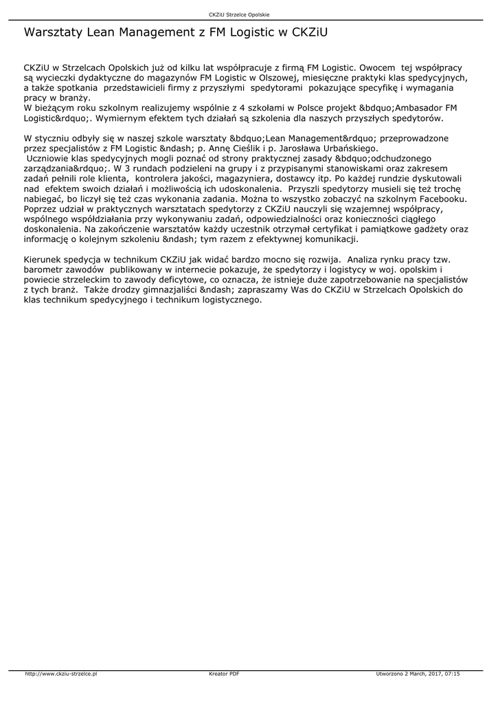 CKZiU Strzelce Opolskie Warsztaty Lean Management z FM Logistic w CKZiU CKZiU w Strzelcach Opolskich już od kilku lat współpracuje z firmą FM Logistic. Owocem tej współpracy są wycieczki dydaktyczne do magazynów FM Logistic w Olszowej, miesięczne praktyki klas spedycyjnych, a także spotkania przedstawicieli firmy z przyszłymi spedytorami pokazujące specyfikę i wymagania pracy w branży. W bieżącym roku szkolnym realizujemy wspólnie z 4 szkołami w Polsce projekt „Ambasador FM Logistic”. Wymiernym efektem tych działań są szkolenia dla naszych przyszłych spedytorów. W styczniu odbyły się w naszej szkole warsztaty „Lean Management” przeprowadzone przez specjalistów z FM Logistic – p. Annę Cieślik i p. Jarosława Urbańskiego. Uczniowie klas spedycyjnych mogli poznać od strony praktycznej zasady „odchudzonego zarządzania”. W 3 rundach podzieleni na grupy i z przypisanymi stanowiskami oraz zakresem zadań pełnili role klienta, kontrolera jakości, magazyniera, dostawcy itp. Po każdej rundzie dyskutowali nad efektem swoich działań i możliwością ich udoskonalenia. Przyszli spedytorzy musieli się też trochę nabiegać, bo liczył się też czas wykonania zadania. Można to wszystko zobaczyć na szkolnym Facebooku. Poprzez udział w praktycznych warsztatach spedytorzy z CKZiU nauczyli się wzajemnej współpracy, wspólnego współdziałania przy wykonywaniu zadań, odpowiedzialności oraz konieczności ciągłego doskonalenia. Na zakończenie warsztatów każdy uczestnik otrzymał certyfikat i pamiątkowe gadżety oraz informację o kolejnym szkoleniu – tym razem z efektywnej komunikacji. Kierunek spedycja w technikum CKZiU jak widać bardzo mocno się rozwija. Analiza rynku pracy tzw. barometr zawodów publikowany w internecie pokazuje, że spedytorzy i logistycy w woj. opolskim i powiecie strzeleckim to zawody deficytowe, co oznacza, że istnieje duże zapotrzebowanie na specjalistów z tych branż. Także drodzy gimnazjaliści – zapraszamy Was do CKZiU w Strzelcach Opolskich do klas technikum spedycyjnego i technikum logistycznego. http://www.ckziu-strzelce.pl Kreator PDF Utworzono 2 March, 2017, 07:15