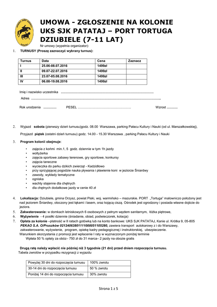 UMOWA - ZGŁOSZENIE NA KOLONIE UKS SJK PATATAJ – PORT TORTUGA DZIUBIELE (7-11 LAT) Nr umowy (wypełnia organizator): 1. TURNUSY (Proszę zaznaczyć wybrany turnus): Turnus Data Cena I 25.06-08.07.2016 1499zł II 09.07-22.07.2016 1499zł III 23.07-05.08.2016 1499zł IV 06.08-19.08.2016 1499zł Zaznacz Imię i nazwisko uczestnika …………………………………………………………………………. Adres ……………………………………………………………………………………………………….. Rok urodzenia ………… 2. PESEL …………………………………………. Wzrost ………. Wyjazd sobota (pierwszy dzień turnusu)godz. 08.00 Warszawa, parking Pałacu Kultury i Nauki (od ul. Marszałkowskiej), Przyjazd piątek (ostatni dzień turnusu) godz. 14.00 - 15.30 Warszawa , parking Pałacu Kultury i Nauki 3. Program kolonii obejmuje: • • • • • • • • • • zajęcia z końmi min.1, 5 godz. dziennie w tym 1h jazdy woltyżerka zajęcia sportowe zabawy terenowe, gry sportowe, konkursy zajęcia taneczne wycieczka do parku dzikich zwierząt - Kadzidłowo przy sprzyjającej pogodzie nauka pływania i pławienie koni w jeziorze Śniardwy zawody, wykłady tematyczne ogniska wachty stajenne dla chętnych dla chętnych dodatkowe jazdy w cenie 40 zł 4. Lokalizacja: Dziubiele, gmina Orzysz, powiat Piski, woj. warmińsko – mazurskie. PORT „Tortuga” malowniczo położony jest nad jeziorem Śniardwy, otoczony jest łąkami i lasem, oraz kojącą ciszą. Ośrodek jest ogrodzony i posiada własne dojście do jeziora. 5. 6. 7. Zakwaterowanie: w domkach letniskowych 6 osobowych z pełnym węzłem sanitarnym, łóżka piętrowe, Wyżywienie - 4 posiłki dziennie (śniadanie, obiad, podwieczorek, kolacja) Opłata za kolonie –płatność w II ratach gotówką lub na konto bankowe: UKS SJK PATATAJ, Kanie ul. Krótka 9, 05-805 PEKAO S.A. O/Pruszków 02124063801111000051105280, zawiera transport autokarowy z i do Warszawy, zakwaterowanie, wyżywienie, program, opiekę kadry pedagogicznej i instruktorskiej, ubezpieczenie. Warunkiem skorzystania z promocji jest wpłacenie I raty w wyznaczonym poniżej terminie Wpłata 50 % opłaty za obóz– 750 zł do 31 marca– 2 jazdy na obozie gratis Drugą ratę należy wpłacić nie później niż 3 tygodnie (21 dni) przed dniem rozpoczęcia turnusu. Tabela zwrotów w przypadku rezygnacji z wyjazdu Powyżej 30 dni do rozpoczęcia turnusu 100% zwrotu 30-14 dni do rozpoczęcia turnusu 50 % zwrotu Poniżej 14 dni do rozpoczęcia turnusu 30% zwrotu Strona 1 z 5 8. Należy zabrać ze sobą: kubek, menażka, niezbędnik ( naczynia turystyczne), śpiwór, latarka, strój do jazdy konnej – obowiązkowy kask (jeździecki lub rowerowy), bacik (palcat), długie spodnie bez sztywnych szwów (dresowe, legginsy),kryte buty bez wystających elementów (kalosze, sznurowane adidasy), strój kąpielowy (buty ochronne wodne ), strój przeciwdeszczowy, wygodne buty do tańca, ew. instrument i dobry humor, niewskazane zabieranie radia, tabletów, laptopów, gier elektronicznych 9. Osoby bez wypełnionych, podpisanych i oddanych dokumentów( umowa-zgłoszenie, karta kwalifikacyjna uczestnika wypoczynku, deklaracja członkowska klubu ) nie mogą brać udziału w koloniach!. 10. Samodzielność dzieci na koloniach Czynności samoobsługowe: - dziecko powinno wiedzieć co ma w walizce/ torbie/ plecaku! (warto podpisać rzeczy) - musi być w stanie unieść własny bagaż, i wnieść go do domku!!! - dziecko musi umieć się samodzielnie wykąpać, umyć zęby, zadbać o codzienną zmianę bielizny. - dziecko musi się samodzielnie ubierać i rozbierać oraz wiązać buty na sznurówki. 11. Ewentualne odwiedziny rodziców przewidziane są w drugą niedzielę turnusu. Możliwość zwolnienia dziecka z zajęć w danym dniu i zabrania na cały dzień. W przypadku odwiedzin osób niebędących prawnymi opiekunami dziecka, wymagane są wcześniejsze informacje osobowe, przekazane kadrze kolonii w dniu wyjazdu. [imię i nazwisko osoby odwiedzającej, PESEL, nr dowodu, adres zameldowania]. 12. Dane osoby zgłaszającej dziecko na kolonie (rodzic/opiekun) : Imię i nazwisko …………………………………………… 13. Wysyłając dziecko na kolonie przyjmuję do wiadomości, że: a) b) c) d) e) Uczestnik kolonii zobowiązany jest stosować się do wszystkich regulaminów obowiązujących na kolonii oraz poleceń kadry, w tym kierownika, wychowawców i instruktorów. Ze względu na zajęcia z końmi obowiązuje bezwzględne i natychmiastowe wypełnianie poleceń kadry Organizator nie ponosi odpowiedzialności za zniszczenia lub zaginięcia wartościowych przedmiotów, które dzieci zabierają ze sobą na wyjazd (np. telefon komórkowy, aparat fotograficzny) Uczestników obowiązuje bezwzględny zakaz posiadania, spożywania i używania tytoniu, alkoholu, narkotyków oraz środków odurzających. Rodzice (opiekunowie) są odpowiedzialni materialnie za szkody wyrządzone przez dziecko i z tego tytułu przyjmują na siebie pełną odpowiedzialność cywilnoprawną. W przypadku drastycznego naruszenia regulaminu lub rażącego postępowania Uczestnika, może zostać podjęta decyzja o usunięciu go z kolonii i odwiezieniu do domu na koszt rodziców (opiekunów). 14. Niniejszym wyrażam zgodę na udział dziecka w kolonii, w szczególności na branie czynnego udziału w takich zajęciach rekreacji ruchowej jak m.in.: taniec, wycieczki, jazda konna, pływanie. 15. W przypadku podejrzenia spożywania alkoholu, narkotyków lub środków odurzających wyrażam zgodę na badanie dziecka alkomatem lub testami narkotykowymi. 16. Oświadczam, że zapoznałem się z wszystkimi informacjami zawartymi w umowie-zgłoszeniu i karcie kwalifikacyjnej i wyrażam zgodę na uczestnictwo mojego dziecka w kolonii, organizowanej przez UKS SJK PA TA TAJ , łącznie z jazdami konnymi oraz zapoznałem się i akceptuję regulamin UKS SJK PATATA