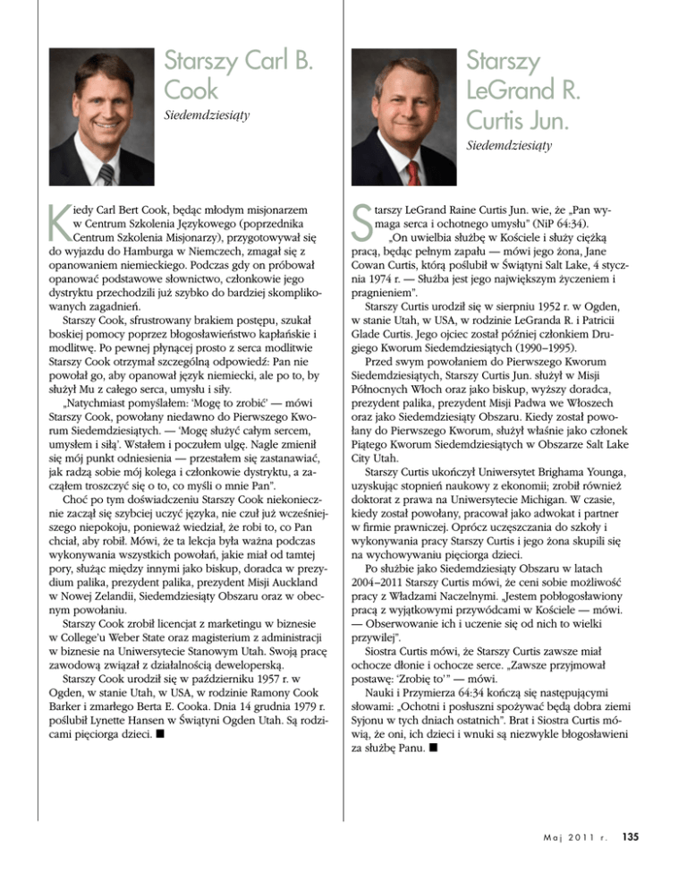 Starszy Carl B. Cook Starszy LeGrand R. Curtis Jun. Siedemdziesiąty Siedemdziesiąty K iedy Carl Bert Cook, będąc młodym misjonarzem w Centrum Szkolenia Językowego (poprzednika Centrum Szkolenia Misjonarzy), przygotowywał się do wyjazdu do Hamburga w Niemczech, zmagał się z opanowaniem niemieckiego. Podczas gdy on próbował opanować podstawowe słownictwo, członkowie jego dystryktu przechodzili już szybko do bardziej skomplikowanych zagadnień. Starszy Cook, sfrustrowany brakiem postępu, szukał boskiej pomocy poprzez błogosławieństwo kapłańskie i modlitwę. Po pewnej płynącej prosto z serca modlitwie Starszy Cook otrzymał szczególną odpowiedź: Pan nie powołał go, aby opanował język niemiecki, ale po to, by służył Mu z całego serca, umysłu i siły. „Natychmiast pomyślałem: ‘Mogę to zrobić’ — mówi Starszy Cook, powołany niedawno do Pierwszego Kworum Siedemdziesiątych. — ‘Mogę służyć całym sercem, umysłem i siłą’. Wstałem i poczułem ulgę. Nagle zmienił się mój punkt odniesienia — przestałem się zastanawiać, jak radzą sobie mój kolega i członkowie dystryktu, a zacząłem troszczyć się o to, co myśli o mnie Pan”. Choć po tym doświadczeniu Starszy Cook niekoniecznie zaczął się szybciej uczyć języka, nie czuł już wcześniejszego niepokoju, ponieważ wiedział, że robi to, co Pan chciał, aby robił. Mówi, że ta lekcja była ważna podczas wykonywania wszystkich powołań, jakie miał od tamtej pory, służąc między innymi jako biskup, doradca w prezydium palika, prezydent palika, prezydent Misji Auckland w Nowej Zelandii, Siedemdziesiąty Obszaru oraz w obecnym powołaniu. Starszy Cook zrobił licencjat z marketingu w biznesie w College’u Weber State oraz magisterium z administracji w biznesie na Uniwersytecie Stanowym Utah. Swoją pracę zawodową związał z działalnością deweloperską. Starszy Cook urodził się w październiku 1957 r. w Ogden, w stanie Utah, w USA, w rodzinie Ramony Cook Barker i zmarłego Berta E. Cooka. Dnia 14 grudnia 1979 r. poślubił Lynette Hansen w Świątyni Ogden Utah. Są rodzicami pięciorga dzieci. ◼ S tarszy LeGrand Raine Curtis Jun. wie, że „Pan wymaga serca i ochotnego umysłu” (NiP 64:34). „On uwielbia służbę w Kościele i służy ciężką pracą, będąc pełnym zapału — mówi jego żona, Jane Cowan Curtis, którą poślubił w Świątyni Salt Lake, 4 stycznia 1974 r. — Służba jest jego największym życzeniem i pragnieniem”. Starszy Curtis urodził się w sierpniu 1952 r. w Ogden, w stanie Utah, w USA, w rodzinie LeGranda R. i Patricii Glade Curtis. Jego ojciec został później członkiem Drugiego Kworum Siedemdziesiątych (1990–1995). Przed swym powołaniem do Pierwszego Kworum Siedemdziesiątych, Starszy Curtis Jun. służył w Misji Północnych Włoch oraz jako biskup, wyższy doradca, prezydent palika, prezydent Misji Padwa we Włoszech oraz jako Siedemdziesiąty Obszaru. Kiedy został powołany do Pierwszego Kworum, służył właśnie jako członek Piątego Kworum Siedemdziesiątych w Obszarze Salt Lake City Utah. Starszy Curtis ukończył Uniwersytet Brighama Younga, uzyskując stopnień naukowy z ekonomii; zrobił również doktorat z prawa na Uniwersytecie Michigan. W czasie, kiedy został powołany, pracował jako adwokat i partner w firmie prawniczej. Oprócz uczęszczania do szkoły i wykonywania pracy Starszy Curtis i jego żona skupili się na wychowywaniu pięciorga dzieci. Po służbie jako Siedemdziesiąty Obszaru w latach 2004–2011 Starszy Curtis mówi, że ceni sobie możliwość pracy z Władzami Naczelnymi. „Jestem pobłogosławiony pracą z wyjątkowymi przywódcami w Kościele — mówi. — Obserwowanie ich i uczenie się od nich to wielki przywilej”. Siostra Curtis mówi, że Starszy Curtis zawsze miał ochocze dłonie i ochocze serce. „Zawsze przyjmował postawę: ‘Zrobię to’” — mówi. Nauki i Przymierza 64:34 kończą się następującymi słowami: „Ochotni i posłuszni spożywać będą dobra ziemi Syjonu w tych dniach ostatnich”. Brat i Siostra Curtis mówią, że oni, ich dzieci i wnuki są niezwykle błogosławieni za służbę Panu. ◼ M a j 2 0 1 1 r. 135