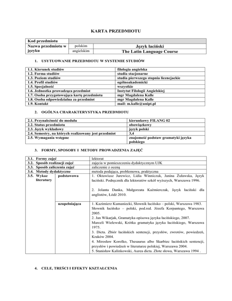 KARTA PRZEDMIOTU Kod przedmiotu Nazwa przedmiotu w języku Język łaciński The Latin Language Course polskim angielskim 1. USYTUOWANIE PRZEDMIOTU W SYSTEMIE STUDIÓW 1.1. Kierunek studiów 1.2. Forma studiów 1.3. Poziom studiów 1.4. Profil studiów 1.5. Specjalność 1.6. Jednostka prowadząca przedmiot 1.7. Osoba przygotowująca kartę przedmiotu 1.8. Osoba odpowiedzialna za przedmiot 1.9. Kontakt filologia angielska studia stacjonarne studia pierwszego stopnia licencjackie ogólnoakademicki wszystkie Instytut Filologii Angielskiej mgr Magdalena Kalle mgr Magdalena Kalle mail: [email protected] 2. OGÓLNA CHARAKTERYSTYKA PRZEDMIOTU 2.1. Przynależność do modułu 2.2. Status przedmiotu 2.3. Język wykładowy 2.4. Semestry, na których realizowany jest przedmiot 2.5. Wymagania wstępne kierunkowy FILANG 02 obowiązkowy język polski 3,4 znajomość podstaw gramatyki języka polskiego 3. FORMY, SPOSOBY I METODY PROWADZENIA ZAJĘĆ 3.1. 3.2. 3.3. 3.4. 3.5. Formy zajęć Sposób realizacji zajęć Sposób zaliczenia zajęć Metody dydaktyczne Wykaz podstawowa literatury lektorat zajęcia w pomieszczeniu dydaktycznym UJK zaliczenie z oceną metoda podająca, problemowa, praktyczna 1. Oktawiusz Jurewicz, Lidia Winniczuk, Janina Żuławska, Język łaciński. Podręcznik dla lektoratów szkół wyższych, Warszawa 1996. 2. Jolanta Danka, Małgorzata Kaźmierczak, Język łaciński dla anglistów, Łódź 2010. uzupełniająca 1. Kazimierz Kumaniecki, Słownik łacińsko – polski, Warszawa 1983. Słownik łacińsko – polski, pod.red. Józefa Korpantego, Warszawa 2005. 2. Jan Wikarjak, Gramatyka opisowa języka łacińskiego, 2007. Marceli Wielewski, Krótka gramatyka języka łacińskiego, Warszawa 1975. 3. Dicta. Zbiór łacińskich sentencji, przysłów, zwrotów, powiedzeń, Kraków 2004. 4. Mirosław Korolko, Thesaurus albo Skarbiec łacińskich sentencji, przysłów i powiedzeń w literaturze polskiej, Warszawa 2004. 5. Stanisław Kalinkowski, Aurea dicta. Złote słowa, Warszawa 1994 . 4. CELE, TREŚCI I EFEKTY KSZTAŁCENIA 4.1. Cele przedmiotu C1- zapoznanie z regułami gramatycznymi języka łacińskiego w stopniu umożliwiającym przekład tekstów oraz rozumienie często cytowanych zwrotów i sentencji łacińskich. C2- przyswojenie zasobu leksykalnego przyczyniającego się do wyjaśnienia etymologii wyrazów funkcjonujących w języku polskim i językach obcych, a także nomenklaturze naukowej. C3- zapoznanie z wybranymi zagadnieniami literatury, historii i kultury antycznej na podstawie tłumaczonych tekstów oraz wskazanie śladów kultury antycznej w kulturze współczesnej. 4.2. Treści programowe Fleksja: rzeczowniki deklinacji I - V; przymiotniki deklinacji I - III (stopniowanie przymiotników, tworzenie i stopniowanie przysłówków; przymiotniki o odmianie zaimkowej); zaimki osobowe, dzierżawcze, wskazujące, względne, pytające, zwrotne; liczebniki główne i porządkowe ; czasowniki czterech koniugacji w następujących formach: - indicativus praesentis, imperfecti, perfecti, plusquamperfecti, futuri I, futuri exacti activi i passivi; infinitivus praesentis, perfecti, futuri activi i passivi; - imperativus praesentis activi i passivi; - coniunctivus praesentis , imperfecti activi i passivi; - participium praesentis activi, participium perfecti passivi, participium futuri activi i passivi; - Gerundium; - Supinum; - czasownik „ esse” i jego złożenia; Składnia: szyk zdania pojedynczego; zdania złożone podrzędnie (celowe, dopełnieniowe, czasowe, przyczynowe, warunkowe); dopełnienie po przeczeniu; Accusativus duplex; Nominativus duplex; Dativus possessivus; Accusativus cum infinitivo,; Nominativus cum infinitivo; Ablativus absolutus; Coniugatio periphrastica passiva; coniunctivus w zdaniu głównym (hortativus, optatativus. iusssivus); składnia nazw miast; Ablativus comparationis; Ablativus temporis, Ablativus loci, Ablativus separationis; rząd przyimków. Tłumaczenie tekstów adaptowanych i fragmentów utworów autorów starożytnych ( Cezara, Cycerona, Seneki, Katullusa, Wergiliusza, Horacego, Owidiusza) kod 4.3. Efekty kształcenia W01 W02 W03 U01 U02 U03 U04 U05 U06 K01 K02 Student, który zaliczył przedmiot Odniesienie do efektów kształcenia w zakresie WIEDZY: dla kierunku zna podstawy fleksji i składni łacińskiej, technikę tłumaczenia FILANG1_ W08 tekstów, zna popularne zwroty i sentencje, jest świadomy wpływu języka łacińskiego na kształtowanie się większości języków europejskich (w tym języka polskiego) potrafi analizować i interpretować dzieła literackie, uwzględniać FILANG1_W02 topikę antyczną w tekstach FILPLANG1_W 06 posiada elementarną wiedzę o związkach językowych FILANG1_W04 i kulturowych z antykiem grecko-rzymskim w zakresie UMIEJĘTNOŚCI: klasyfikuje poznane zagadnienia gramatyczne, dokonuje analizy FILANG1_U06 leksykalnej i gramatycznej tekstów FILANG1_U08 tłumaczy teksty adaptowane i prostsze teksty oryginalne FILANG1_U08 wykazuje umiejętność logicznego myślenia FILANG1_U01 posługuje się dostępnymi pomocami naukowymi FILANG1_U01 FILANG1_U02 potrafi samodzielnie dotrzeć do różnego typu źródeł wiedzy FILANG1_U01 wzbogaca zasób swego słownictwa, rozumie słowa oraz terminy FILANG1_U07 naukowe pochodzące z języka łacińskiego i używa ich w odpowiednim kontekście i znaczeniu w zakresie KOMPETENCJI SPOŁECZNYCH: odczuwa potrzebę ustawicznego kształcenia i wzbogacania swej FILANG1_K01 wiedzy potrafi współdziałać i pracować w grupie FILANG1_K02 dla obszaru H1A _ W09 H1A_W02 H1A_W07 H1A_W04 H1A_U04 H1A_U05 H1A_U05 H1A_U01 H1A_U01 H1A_U01 H1A_U04 H1A_K01 H1A_K02 K03 ma świadomość dziedzictwa kulturowego Europy oraz wpływu FILANG1_K05 języka łacińskiego na kształtowanie się języków europejskich H1A_K05 K04 jest wrażliwy na piękno języka ojczystego i języków obcych H1A _K05 FILANG1_K05 4.4. Kryteria oceny osiągniętych efektów kształcenia - obecność na zajęciach 