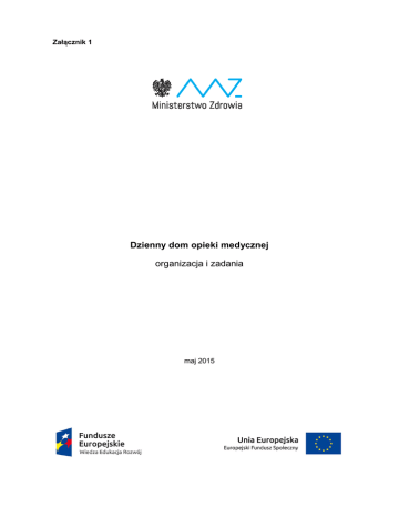 Załącznik 1 Dzienny dom opieki medycznej organizacja i zadania maj 2015 Słownik: 1) Deinstytucjonalizacja opieki zdrowotnej - są to wszelkie działania podejmowane na rzecz tworzenia różnych form świadczeń zdrowotnych w środowisku lokalnym mających na celu zapewnienie właściwej opieki oraz wydłużenia okresu sprawności psychofizycznej i możliwości pełnienia ról społecznych, zawodowych osobom z chorobami przewlekłymi, osobom niepełnosprawnym, osobom w podeszłym wieku, dzieciom i młodzieży; 2) Dzienny dom opieki medycznej (DDOM) - jest jedną z form deinstytucjonalizacji opieki nad osobami zależnymi. DDOM jest wyodrębnioną strukturalnie częścią podmiotu leczniczego (podmiotu leczniczego realizującego świadczenia z zakresu podstawowej opieki zdrowotnej, leczenia szpitalnego lub ambulatoryjnej opieki specjalistycznej, w tym np. poradni geriatrycznej lub opieki długoterminowej). W dziennym domu opieki medycznej zapewnia się opiekę medyczną w warunkach zbliżonych do domowych; 3) Indywidualny plan wsparcia –- plan pracy terapeutycznej z uczestnikiem, tworzony na podstawie sporządzonej diagnozy potrzeb oraz diagnozy możliwości psychofizycznych uczestnika i wspólnie z nim realizowany; 4) Całościowa Ocena Geriatryczna (COG) – wielowymiarowy, interdyscyplinarny i zintegrowany proces diagnostyczny służący do określenia problemów zdrowotnych i funkcjonalnych (medycznych, fizycznych, psychicznych, socjalnych i społecznych) starszego pacjenta celem oszacowania obszarów deficytów funkcyjnych i ustalenia priorytetów leczniczo-rehabilitacyjnych; 5) Osoba korzystająca ze wsparcia – osoba bezpośrednio korzystająca ze świadczeń zdrowotnych oraz innych usług (wyżywienie, transport) w ramach dziennego domu opieki medycznej; 6) Koszt pobytu – wszystkie koszty związane z objęciem opieką osób zakwalifikowanych do pobytu w dziennym domu opieki medycznej; 7) Pobyt w dziennym domu opieki medycznej – korzystanie ze świadczeń zdrowotnych oraz innych usług (wyżywienie, transport) świadczonych w dziennym domu opieki medycznej; 8) Rodzina – osoby spokrewnione lub niespokrewnione pozostające w faktycznym związku, wspólnie zamieszkujące i gospodarujące lub wskazane przez osobę zakwalifikowaną do dziennego domu opieki medycznej; 9) Zespół terapeutyczny – zespół powoływany do kompleksowej opieki nad osobami zakwalifikowanymi do dziennego domu opieki medycznej. 2 Wstęp Zgodnie z postanowieniami zatwierdzonego w dniu 17 grudnia 2014 r. przez Komisję Europejską Programu Operacyjnego Wiedza Edukacja Rozwój (PO WER) istnieje możliwość podejmowania działań ukierunkowanych na wsparcie deinstytucjonalizacji opieki nad osobami zależnymi poprzez rozwój alternatywnych form opieki nad osobami niesamodzielnymi (w tym osobami starszymi). PO WER jest programem, który z jednej strony odpowiada na potrzeby reform w obszarach zatrudnienia, wykluczenia społecznego, edukacji, szkolnictwa wyższego, zdrowia i dobrego rządzenia, z drugiej zaś oferuje wsparcie bezpośrednie w obszarach, których wsparcie z poziomu krajowego jest uzasadnione obiektywnymi przesłankami. Program daje możliwość przygotowania, przetestowania i wdrożenia innowacyjnych rozwiązań organizacyjnych poprawiających funkcjonowanie systemu ochrony zdrowia w Polsce. Wsparcie sektora ochrony zdrowia w ramach Programu nastąpi poprzez realizację Osi V Wsparcie dla obszaru zdrowia. Zgodnie z założeniami, standard dziennego domu opieki medycznej zostanie pilotażowo przetestowany w ramach PO WER, a następnie upowszechniony z wykorzystaniem środków Regionalnych Programów Operacyjnych w ramach perspektywy finansowej na lata 2014-2020. Równolegle do działań finansowanych ze środków Europejskiego Funduszu Społecznego podejmowane będą działania zmierzające do uzupełnienia wykazu świadczeń gwarantowanych tak, aby po zakończeniu pilotażu, na podstawie uzyskanych wyników w ramach przeprowadzonej ewaluacji, została opracowana karta problemu zdrowotnego, której sporządzenie jest pierwszym etapem prac nad zakwalifikowaniem danego świadczenia jako świadczenia gwarantowanego. 3 I. Cele Główny cel: Wsparcie deinstytucjonalizacji opieki nad osobami zależnymi, poprzez rozwój systemu świadczeń zdrowotnych dla osób niesamodzielnych, w tym osób starszych. Zaplanowane działanie ma na celu poprawę jakości funkcjonowania systemu ochrony zdrowia w zakresie opieki nad osobami niesamodzielnymi, w szczególności osobami starszymi, poprzez przygotowanie i wdrożenie rozwiązań organizacyjnych umożliwiających rozwój form świadczeń zdrowotnych. Projektowane rozwiązanie stanowi realizację działań na rzecz osób starszych i niesamodzielnych, określonych w dokumencie pn.: „Założenia długofalowej polityki senioralnej w Polsce na lata 2014-2020”, przyjętym Uchwałą Nr 238 Rady Ministrów z dnia 24 grudnia 2013 r. w sprawie przyjęcia dokumentu Założenia Długofalowej Polityki Senioralnej w Polsce na lata 2014-2020 (M.P. z 2014 r., poz. 118). Główne zidentyfikowane wyzwania dla polityki senioralnej, wokół których wypracowano kierunki interwencji, to m.in. wydłużenie okresu aktywności zawodowej, wykorzystanie potencjału osób starszych w obszarze aktywności społecznej i obywatelskiej, zapotrzebowanie na rozwiązania pozwalające na godzenie życia zawodowego z rodzinnym osób pracujących w wieku 50+ (konieczność sprawowania opieki nad rodzicami lub innymi osobami zależnymi). Jednocześnie należy zaznaczyć, iż kwestie związane z koniecznością podjęcia działań na rzecz osób starszych w obszarze zabezpieczenia potrzeb zdrowotnych zostały ujęte w rozdziale 2 pn.: „Zdrowie i samodzielność”, w szczególności w podrozdziale 2.1.1 Priorytet 1. pn.: „Stworzenie systemowych rozwiązań, które pozwolą na rozwój usług medycznych dla osób starszych” oraz w podrozdziale 2.1.3 Priorytet 3. pn.: „Rozwój usług spo
