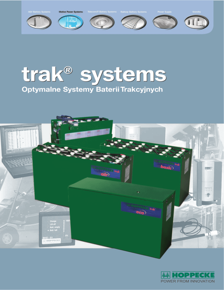 trak systems ® Optymalne Systemy Baterii Trakcyjnych trak ® HOPPECKE Systemy Baterii Trakcyjnych Bez energii nie ma ruchu. Ładunki muszą być transportowane z punktu A do punktu B. Rynek wymaga szybkich procesów produkcyjnych, potrzebuje mocy i ruchu przez całą dobę. Umożliwiają to systemy zasilania firmy HOPPECKE. Serwis HOPPECKE Chcą Państwo możliwie w jak najmniejszym stopniu zaprzątać sobie głowę swoimi systemami zasilania? To nie problem, nasz serwis zapewnia opiekę począwszy od Baterie trakcyjne stosuje się we wszystkich elektrycznie montażu, przez konserwację a skończywszy na wymianie napędzanych wózkach widłowych, wózkach podnośnikowych, całych systemów baterii. Na życzenie, mogą Państwo układarkach regałowych i pojazdach napędzanych wynająć u nas kompletny system. W ramach kontraktów elektrycznie, wykorzystywanych w logistyce firma HOPPECKE zapewnia zaopatrzenie w energię, od wewnątrzzakładowej oraz gospodarce magazynowej. Dla dostawy aż do rozliczenia zgodnego z jej zużyciem wszystkich tych zastosowań oferujemy odpowiedni system. Systemy Baterii Trakcyjnych System Baterii Trakcyjnych obejmuje dostawę baterii, inteligentne technologie ładowania baterii, systemy zarządzania bateriami oraz serwis, recykling i usługi doradcze we wszystkich sprawach związanych z bateriami trakcyjnymi. Ciągłe badania i prace rozwojowe oraz innowacje wprowadzane z myślą o kliencie spowodowały, że HOPPECKE stała się jednym z czołowych specjalistów w dziedzinie systemów zasilania oraz zdobyła bardzo mocną pozycję międzynarodową. Dwie technologie HOPPECKE jako jedyny producent baterii oferuje dwie technologie: kwasowo-ołowiową oraz niklowo-kadmową (FNC쏐). Niniejsza broszura wyjaśni Państwu, która z nich stanowi optymalne rozwiązanie w Państwa przypadku. Podstawowe korzyści trak® basic trak® air trak® eco trak® fnc Koszty inwestycyjne ★★★★ ★★★ ★★ ★ Koszty konserwacji ★★ ★★★ ★★★★ ★★★★ ★ ★★★★ ★★★ ★★★ ★★ ★★★★ ★★★ nie przewiduje się ★★★ ★★★★ ★★ brak Koszty eksploatacyjne Wymiana baterii (konieczność) Zakresy zastosowania (ograniczenie) ★★★★ = niskie ★ = wysokie trak basic ® trak® basic – Bateria i prostownik trak® basic Państwa pytanie: Jak mogę zminimalizować koszty inwestycji, a mimo to zastosować system baterii o najwyższej jakości? Nasza odpowiedź: Optymalnym rozwiązaniem w tym przypadku jest trak® basic. Solidny i niezawodny system trak® basic składa się z wysokiej jakości baterii trakcyjnej HOPPECKE, w połączeniu z optymalnie dobranym prostownikiem. Koszty inwestycyjne: • Niskie Zakresy zastosowania: • Praca z małym obciążeniem • Praca normalna • Praca z dużym obciążeniem Technika ładowania: • Charakterystyka IUIa zgodna z DIN 41773-1 • Sprawdzona technika ładowania optymalnie dostosowana do zadań systemu w pewny i niezawodny sposób gwarantuje pełne naładowanie baterii. trak air ® trak® air – Bateria i prostownik trak® air Państwa pytanie: Jak mogę zminimalizować koszty eksploatacji, zużycie prądu oraz obsługę baterii? Nasza odpowiedź: Najlepszym rozwiązaniem w tym przypadku jest trak® air. Wysokiej jakości system trak® air składa się z baterii trakcyjnych HOPPECKE wyposażonych w system wymuszonej cyrkulacji elektrolitu oraz w regulowany (parametry ładowania utrzymywane bez względu na wahania napięcia zasilającego) prostownik. Innowacyjne właściwości systemu sprawiają, że trak® air firmy HOPPECKE jest rozwiązaniem unikatowym. Koszty eksploatacji: • Niskie Zakresy zastosowania: • Praca z małym obciążeniem • Praca normalna • Praca z dużym obciążeniem • Przedłużony okres pracy bez ładowania wyrównawczego Technika ładowania: • Charakterystyka IUIa zgodna z DIN 41773-1 • Regulowana technika ładowania wraz z funkcją adaptacyjnego dostosowywania współczynnika ładowania, w pewny i niezawodny sposób gwarantuje pełne naładowanie baterii nawet w przypadku usterki w systemie wymuszonej cyrkulacji elektrolitu. Unikatowa zasada działania trak® air trak eco ® trak® eco – Bateria i prostownik trak® eco Państwa pytanie: Jak mogę zminimalizować koszty eksploatacji i konserwacji np. koszty uzupełniania wody, czyszczenia i kontroli baterii? Nasza odpowiedź: Doskonałym rozwiązaniem w tym przypadku jest system trak® eco. System trak eco, wymagający niewielkich nakładów eksploatacyjnych, składa się z baterii trakcyjnej firmy HOPPECKE o budowie zamkniętej, połączonej z wysokiej jakości prostownikiem wysokiej częstotliwości. ® Innowacyjne właściwości systemu sprawiają, że trak® eco firmy HOPPECKE jest baterią prawie bezobsługową. Koszty konserwacji: • Niskie Zakres zastosowania: • Praca z małym obciążeniem • Praca normalna • Przedłużony okres pracy bez ładowania wyrównawczego Technika ładowania: • Charakterystyka IUIa zgodna z DIN 41773-1 • Regulowane prostowniki pracujące w Zmniejszone zużycie wody dzięki korkom labiryntowym firmy HOPPECKE zakresie wysokich częstotliwości wraz z funkcją adaptacyjnego dostosowywania współczynnika ładowania w pewny i niezawodny sposób gwarantują pełne naładowanie baterii nawet w przypadku usterki w systemie wymuszonej cyrkulacji elektrolitu. Ciągła i łatwa kontrola poziomu elektrolitu poprzez wykorzystanie HOPPECKE AquaCheck® trak fnc ® trak® fnc – Bateria i prostownik trak® fnc Państwa pytanie: W jaki sposób mogę eksploatować pojazdy przez 24 godziny, 7 dni w tygodniu, bez wymiany baterii? Nasza odpowiedź: Tak! W tym przypadku unikatowym rozwiązaniem jest trak® fnc. System trak® fnc składa się z baterii trakcyjnej HOPPECKE, wykonanej w technologii FNC® włóknistej oraz z regulowanego prostownika i jednostki kontrolnej baterii - JKB. System trak® fnc wyróżnia się ekstremalną odpornością na rozładowa
