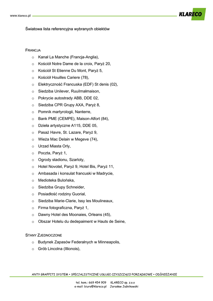 www.klareco.pl Światowa lista referencyjna wybranych obiektów FRANCJA o Kanał La Manche (Francja-Anglia), o Kościół Notre Dame de la croix, Paryż 20, o Kościół St Etienne Du Mont, Paryż 5, o Kościół Houilles Cariere (78), o Elektryczność Francuska (EDF) St denis (02), o Siedziba Unilever, Ruuilmalmaison, o Pokrycie autostrady ABB, DDE 02, o Siedziba CPR Grupy AXA, Paryż 8, o Pomnik martyrologii, Nanterre, o Bank PME (CEMPE), Maison-Alfort (84), o Dzieła artystyczne A115, DDE 05, o Pasaż Havre, St. Lazare, Paryż 9, o Wieża Mac Delain w Megeve (74), o Urzad Miasta Orly, o Poczta, Paryż 1, o Ogrody stadionu, Szarloty, o Hotel Novotel, Paryż 9, Hotel Bis, Paryż 11, o Ambasada i konsulat francuski w Madrycie, o Medioteka Bulońska, o Siedziba Grupy Schneider, o Posiadłość rodziny Guorial, o Siedziba Marie-Clarie, Issy les Moulineaux, o Firma fotograficzna, Paryż 1, o Dawny Hotel des Moonaies, Orleans (45), o Obszar Hotelu du dedepaiment w Hauts de Seine, STANY ZJEDNOCZONE o Budynek Zapasów Federalnych w Minneapolis, o Grób Lincolna (Illionois), ANTY GRAFFITI SYSTEM SPECJALISTYCZNE USŁUGI CZYSZCZĄCO PORZĄDKOWE ODŚNIEŻANIE tel. kom.: 669 454 909 e-mail: [email protected] KLARECO sp. z.o.o Jarosław Jaśnikowski www.klareco.pl HISZPANIA o Metro w Barcelonie, o Metro w Madrycie, o Łuk Triumfalny, o Pomnik „El Oso el Madrono de Madrit”, o Pałac Telecom w Madrycie, o Bank Hiszpański, o Kościół Św. Franciszka, Botja, o Wieże Bramy Europy, Madryt, o Bank BEX, o Bank Netweal, o Bank Barclay's Bank, WIELKA BRYTANIA o Metro Londyńskie, o Koleje Brytyjskie, o Trafalagar Sguare, o Merble Arch Londyn, o Tower Bridge Londyn, o Łuk Marmurowy, Londyn, o Big-Ben Londyn, o Muzeum British Heritage, o Muzeum Scittish Heritage, o Sklepy Marks and Spencer Edinburg, NIEMCY o Most Warszawski, Berlin, o Senat Berliński,”Alte oper” Frankfurt, o Teatr, Frankfurt, AUSTRIA o Kolej Austriacka, o Metro Wiedeń, ANTY GRAFFITI SYSTEM SPECJALISTYCZNE USŁUGI CZYSZCZĄCO PORZĄDKOWE ODŚNIEŻANIE tel. kom.: 669 454 909 e-mail: [email protected] KLARECO sp. z.o.o Jarosław Jaśnikowski www.klareco.pl SŁOWENIA o Urząd Miasta, Lubliana, o Pomniki i posągi, SZWECJA o Koleje Szwedzkie, o Metro w Sztokholmie, o Ministerstwo Obrony, o Pałac Królewski w Sztokholmie, o Most Orseund Dania-Szwecja, NORWEGIA o Posterunek Królewski, o Zapory, o Metro i kolej w Oslo, o Parlament Norweski, WŁOCHY o Coloseum w Rzymie, o Kolej Włoska, o Pomnik Plaza del popolo, o Plac Hiszpański w Rzymie, o Sguare Ancore, GRECJA o Biała Wieża, Saloniki, o Pomniki, posągi, FINLANDIA o Parlament Finlandii, o Kolej Fińska, o Urząd Miasta w Helsinkach, o Opera w Helsinkach, ANTY GRAFFITI SYSTEM SPECJALISTYCZNE USŁUGI CZYSZCZĄCO PORZĄDKOWE ODŚNIEŻANIE tel. kom.: 669 454 909 e-mail: [email protected] KLARECO sp. z.o.o Jarosław Jaśnikowski www.klareco.pl DANIA o Metro w Kopenhadze, o Urząd Miasta w Kopenhadze, o Wiele Urzędów Miasta w Danii, WĘGRY o Metro w Budapeszcie, o Kolej Praska, BELGIA o Metro w Brukseli, HOLANDIA o Urząd Miasta w Amsterdamie, o Wiele mostów i banków ARGENTYNA o Pomniki i posagi w Buenos Aires, o Wiele banków w Buenos Aires, o Telefonia w Buenos Aires, o Urząd Miasta w Rosario, IRAN o Pomniki w Teheranie, AUSTRALIA I NOWA ZELANDIA o Urząd Miasta w Sydney, o Autobusy w Sydney, o Wiele Urzędów Miasta w Sydney, BRAZYLIA o Metro Bolo Horizonte, o Bank Brazylijski, o Urząd Miasta w Rio de Janeiro, ANTY GRAFFITI SYSTEM SPECJALISTYCZNE USŁUGI CZYSZCZĄCO PORZĄDKOWE ODŚNIEŻANIE tel. kom.: 669 454 909 e-mail: [email protected] KLARECO sp. z.o.o Jarosław Jaśnikowski www.klareco.pl LIBAN o Stadion piłkarski w Bejrucie, PORTUGALIA o Metro w Lizbonie, o Stadion w Lizbonie Jose Alvalade, o Pomniki w centrum Lizbony, Lista wciąż rośnie………….………… ANTY GRAFFITI SYSTEM SPECJALISTYCZNE USŁUGI CZYSZCZĄCO PORZĄDKOWE ODŚNIEŻANIE tel. kom.: 669 454 909 e-mail: [email protected] KLARECO sp. z.o.o Jarosław Jaśnikowski