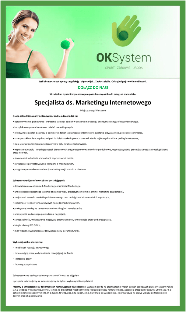 Jeśli chcesz czerpać z pracy satysfakcję i się rozwijać… Zaskocz siebie. Odkryj więcej swoich możliwości. DOŁĄCZ DO NAS! W związku z dynamicznym rozwojem poszukujemy osoby do pracy, na stanowisko: Specjalista ds. Marketingu Internetowego Miejsce pracy: Warszawa Osoba zatrudniona na tym stanowisku będzie odpowiadać za: • opracowywanie, planowanie i wdrażanie strategii działań w obszarze marketingu online/marketingu efektywnościowego, • kompleksowe prowadzenie ww. działań marketingowych, • efektywność działań z zakresu e-commerce, takich jak kampanie internetowe, działania aktywizacyjne, projekty e-commerce, • stałe poszukiwanie nowych rozwiązań i działań marketingowych oraz wdrażanie najlepszych z nich w podległym obszarze, • stałe usprawnianie stron sprzedażowych w celu zwiększenia konwersji, • wspieranie zespołu i innych jednostek biznesowych przy przygotowywaniu oferty produktowej, wypracowywaniu procesów sprzedaży i obsługi klienta przez Internet, • stworzenie i wdrożenie komunikacji poprzez social media, • zarządzanie i przygotowywanie kampanii e-mailingowych, • przygotowywanie korespondencji marketingowej i kontakt z klientem. Zainteresowani jesteśmy osobami posiadającymi: • doświadczenia w obszarze E-Marketingu oraz Social Marketingu, • umiejętności skutecznego łączenia działań na wielu płaszczyznach (online, offline, marketing bezpośredni), • znajomości narzędzi marketingu internetowego oraz umiejętność stosowania ich w praktyce, • znajomości trendów i innowacyjnych narzędzi marketingowych, • praktycznej wiedzy na temat tworzeniu mailingów i newsletterów, • umiejętność skutecznego prowadzenia negocjacji, • samodzielności, wykazywania inicjatywy, orientacji na cel, umiejętność pracy pod presją czasu, • biegłej obsługi MS Office, • mile widziane wykształcenie/doświadczenie w kierunku Grafiki. Wybranej osobie oferujemy: • możliwość rozwoju zawodowego • interesującą pracę w dynamicznie rozwijającej się firmie • narzędzia pracy • bonusy pozapłacowe Zainteresowane osoby prosimy o przesłanie CV wraz ze zdjęciem Uprzejmie informujemy, ze skontaktujemy się tylko z wybranymi Kandydatami Prosimy o umieszczenie w dokumentach następującego oświadczenia: Wyrażam zgodę na przetwarzanie moich danych osobowych przez OK System Polska S.A. z siedzibą w Warszawie, przy ul. Tamka 38 dla potrzeb niezbędnych do realizacji procesu rekrutacyjnego, zgodnie z przepisami ustawy z 29.08.1997 r. o ochronie danych osobowych (Dz. U. z 2002 r. Nr 101, poz. 926 z późn. zm.). Przyjmuję do wiadomości, że przysługuje mi prawo wglądu do treści moich danych oraz ich poprawiania